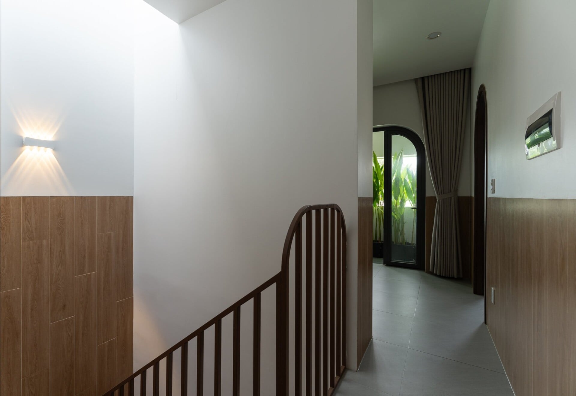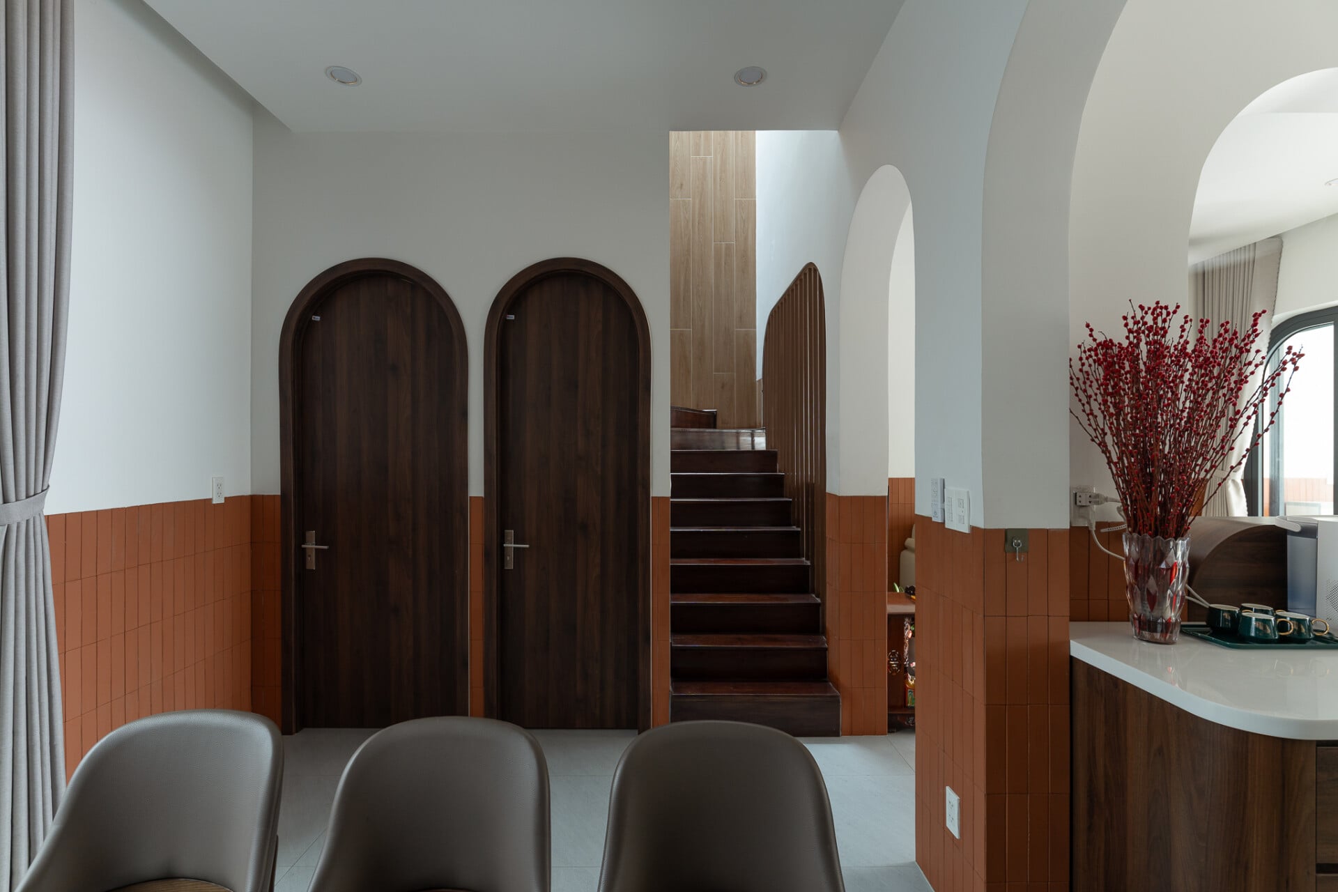 Lối vào phòng ngủ và cầu thang với hệ cửa vòm gỗ tạo cảm giác mềm mại. Chi tiết bo cong nối tiếp từ ngoại thất vào nội thất để giữ sự thống nhất thẩm mỹ.