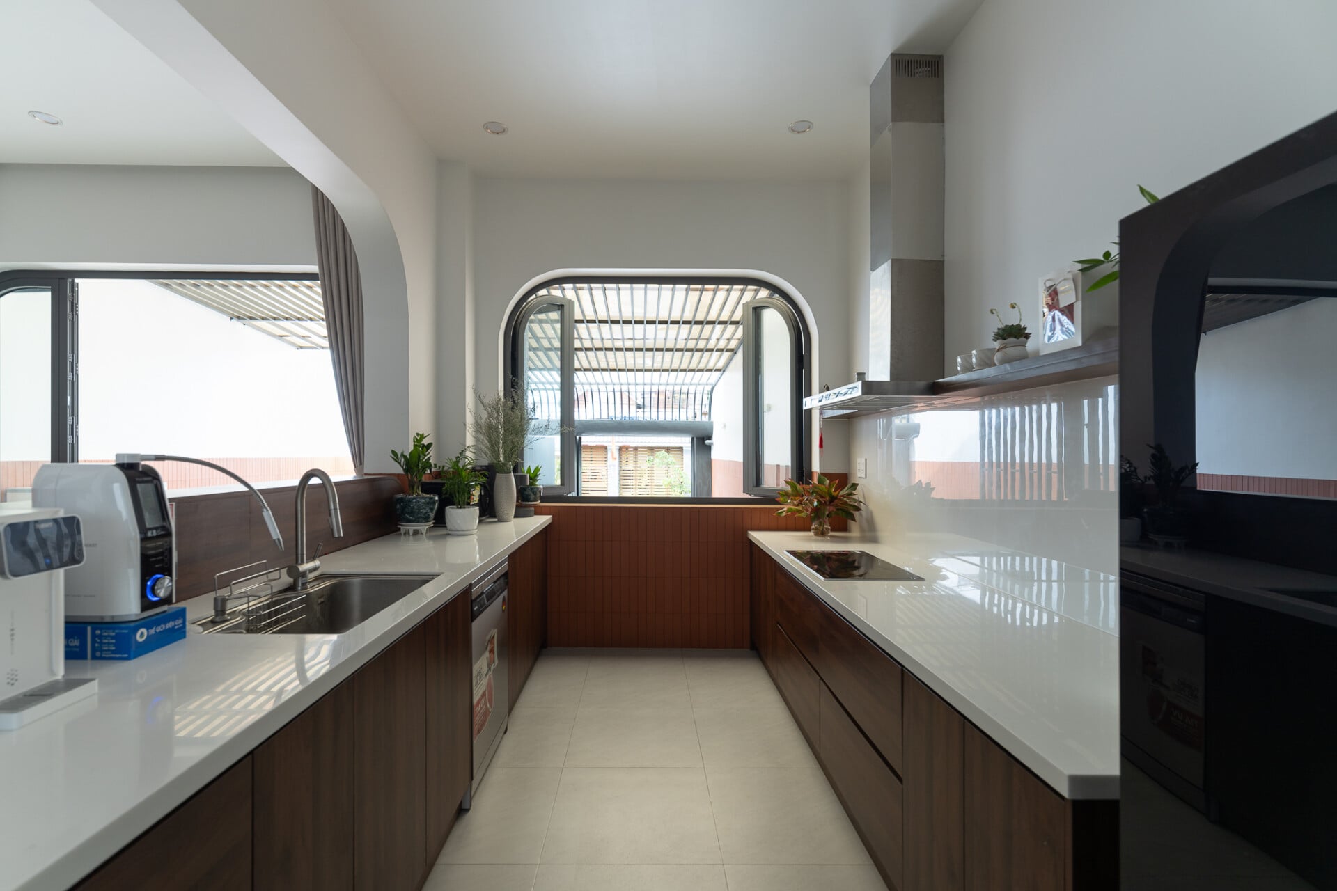 Bếp chữ U với hệ cửa mở ra sân trước để lấy sáng và thông gió tự nhiên. Chất liệu gỗ và bề mặt trắng được chọn nhằm đảm bảo chi phí và sự bền bỉ khi sử dụng.