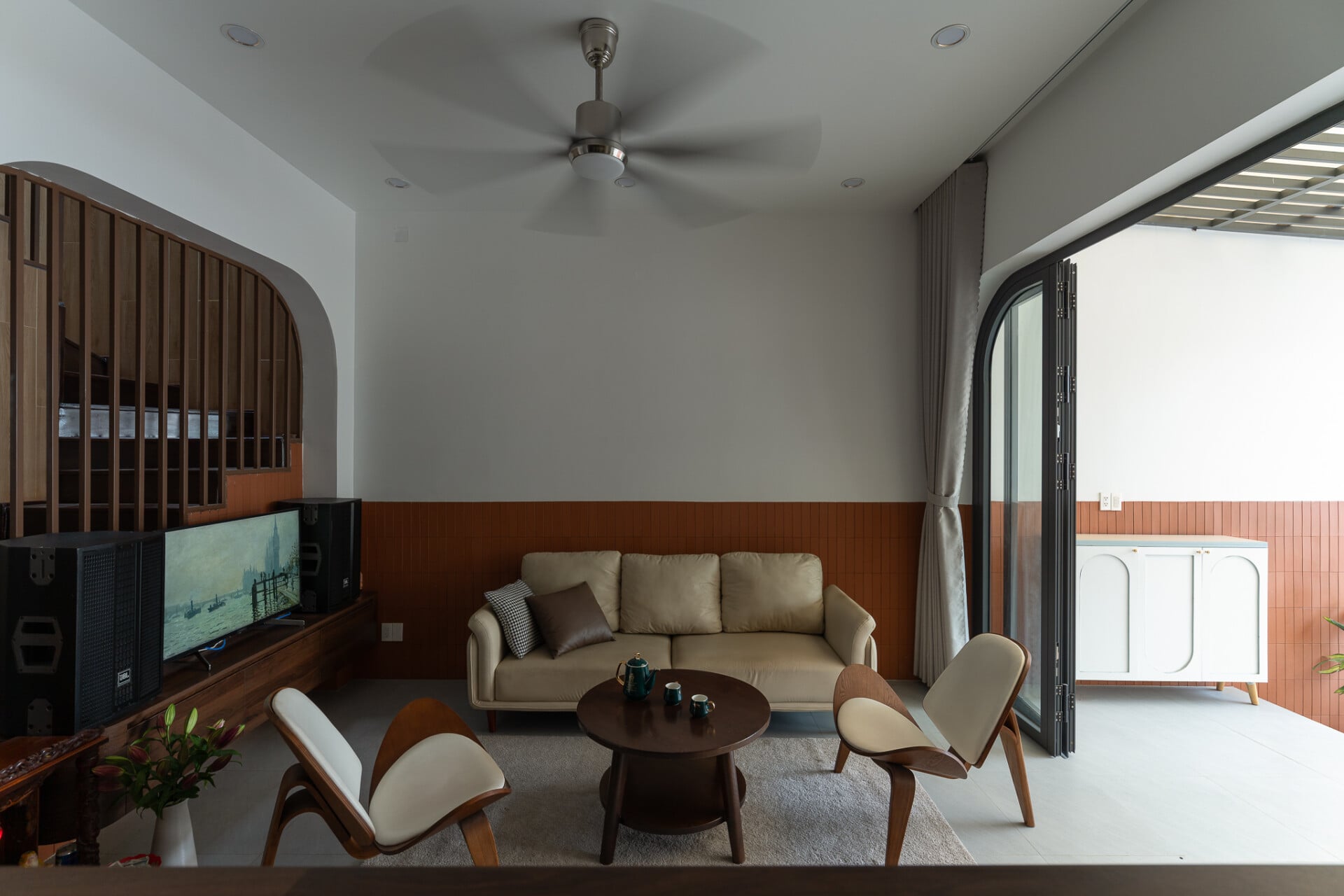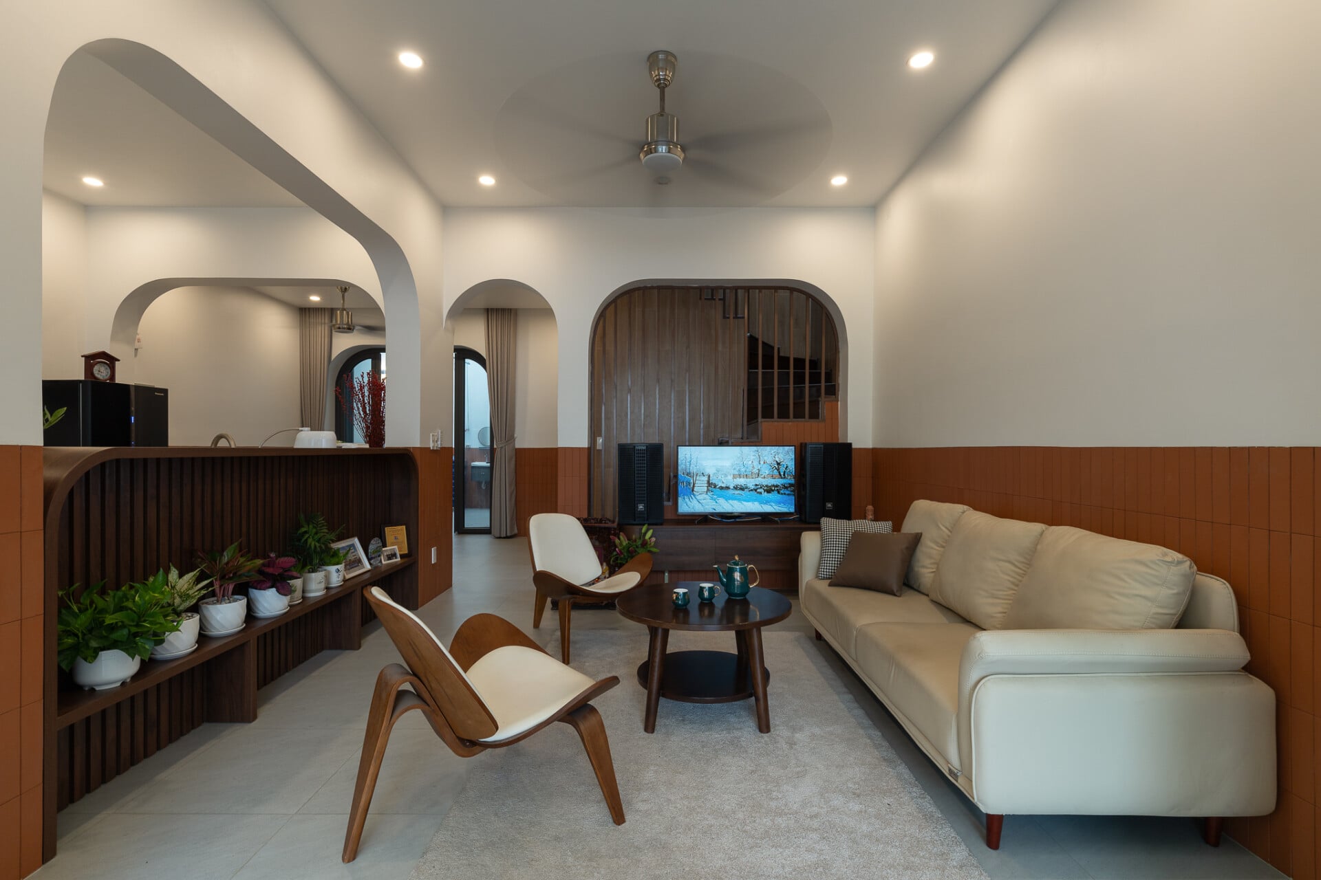 Phòng khách với nội thất tông gỗ óc chó kết hợp gạch ốp chân tường, tạo không khí ấm và gần gũi. Các vòm cong lặp lại như điểm nhấn tạo hình chủ đạo.