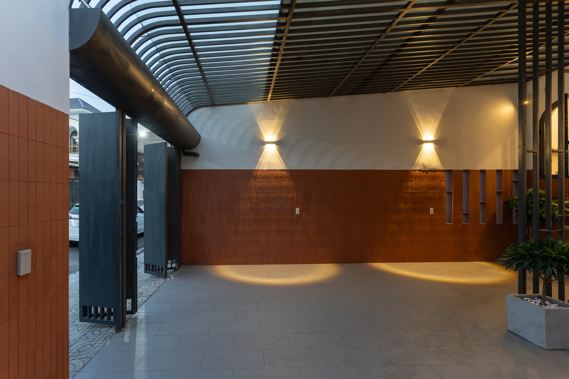 Không gian gara được che mái lam thép cong, tường ốp gạch thẻ đỏ và đèn tường tạo ánh sáng loang mềm. Thiết kế mở giúp lấy gió và ánh sáng từ đường phố vào nhà.