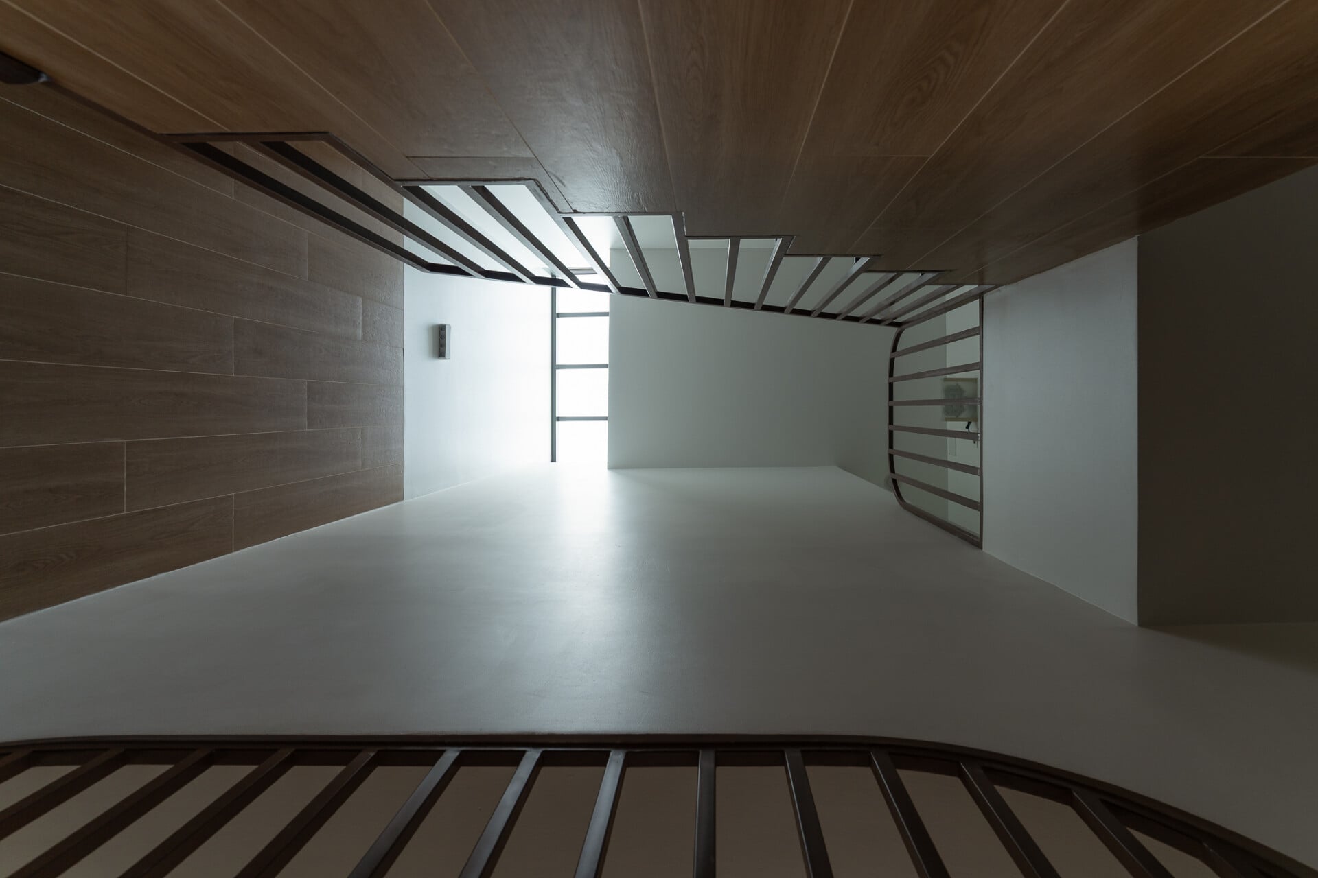 Trần cầu thang với hệ song đứng tạo hiệu ứng thị giác nhẹ, dẫn sáng xuống tầng dưới. Đây là điểm chuyển tiếp giữa tầng trệt và tầng lầu.