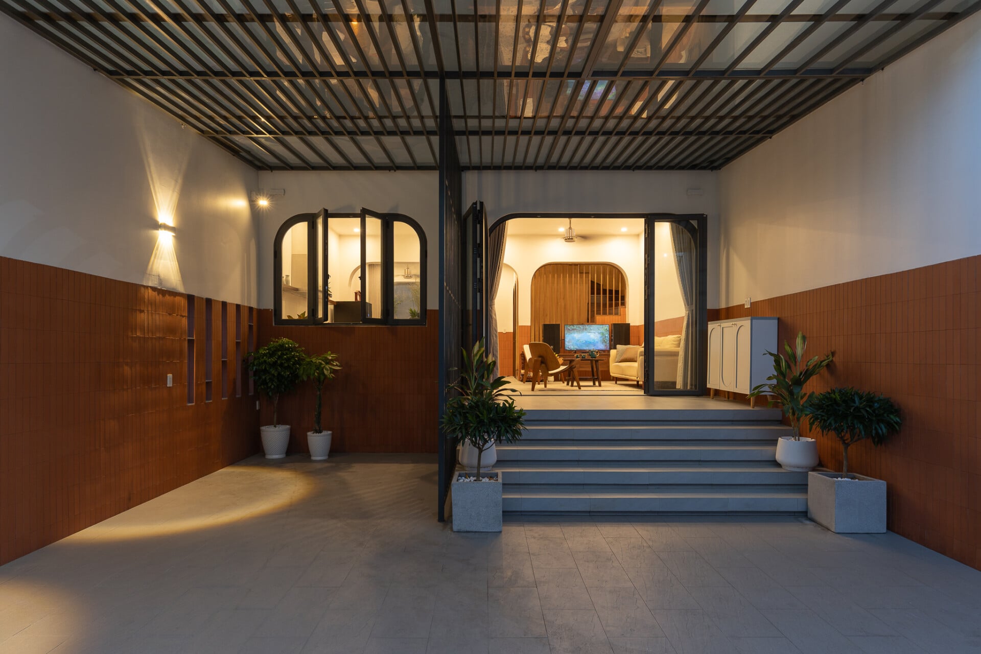 Khoảng sân trước nhìn vào phòng khách vào buổi tối, ánh sáng tạo điểm nhấn lên các mảng tường gạch đất nung. Khu đệm này được sử dụng cho xe và làm lối vào chính của ngôi nhà.