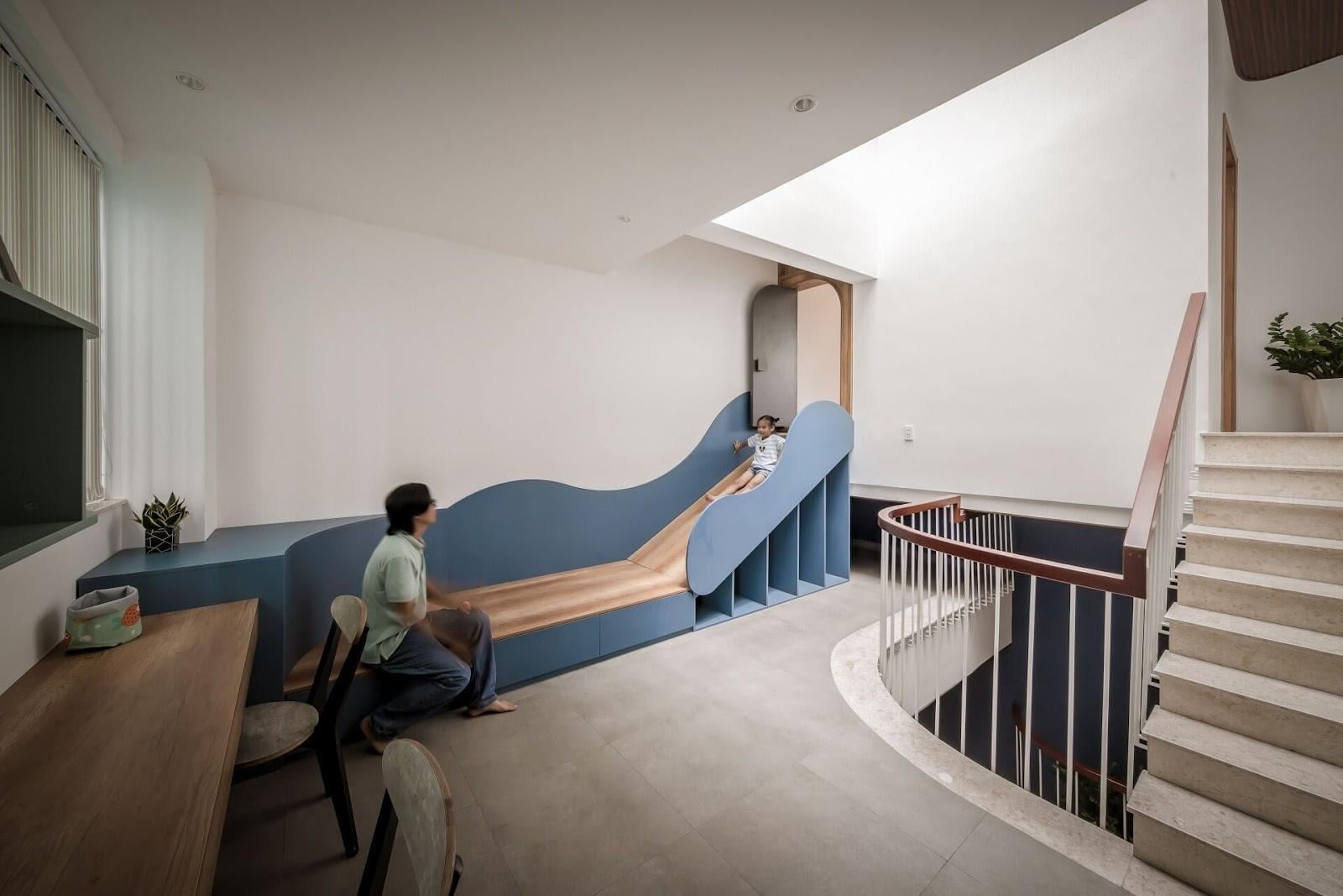 Nhà 3 tầng với hệ thống lệch tầng kết hợp cầu trượt tạo “dòng chảy” hoạt động liên tục không gián đoạn. Khu chơi tầng 2 kết nối phòng ngủ bằng cả thang bộ và cầu trượt trong môi trường an toàn với đường cong làm mềm góc tường