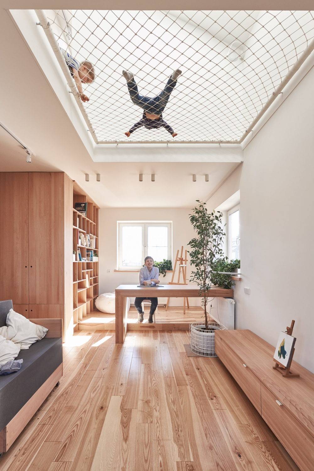 Thiết kế cho phép bố mẹ dễ dàng quan sát hoạt động của con trên lưới thông tầng, đồng thời cũng là nơi đọc sách và nghỉ ngơi yêu thích của cả người lớn. Công trình sử dụng chất liệu gỗ làm chủ đạo kết hợp với sơn trắng tạo không gian ấm áp, thân thiện và phân chia rõ rệt các khu vực chức năng cho gia đình 4 người.