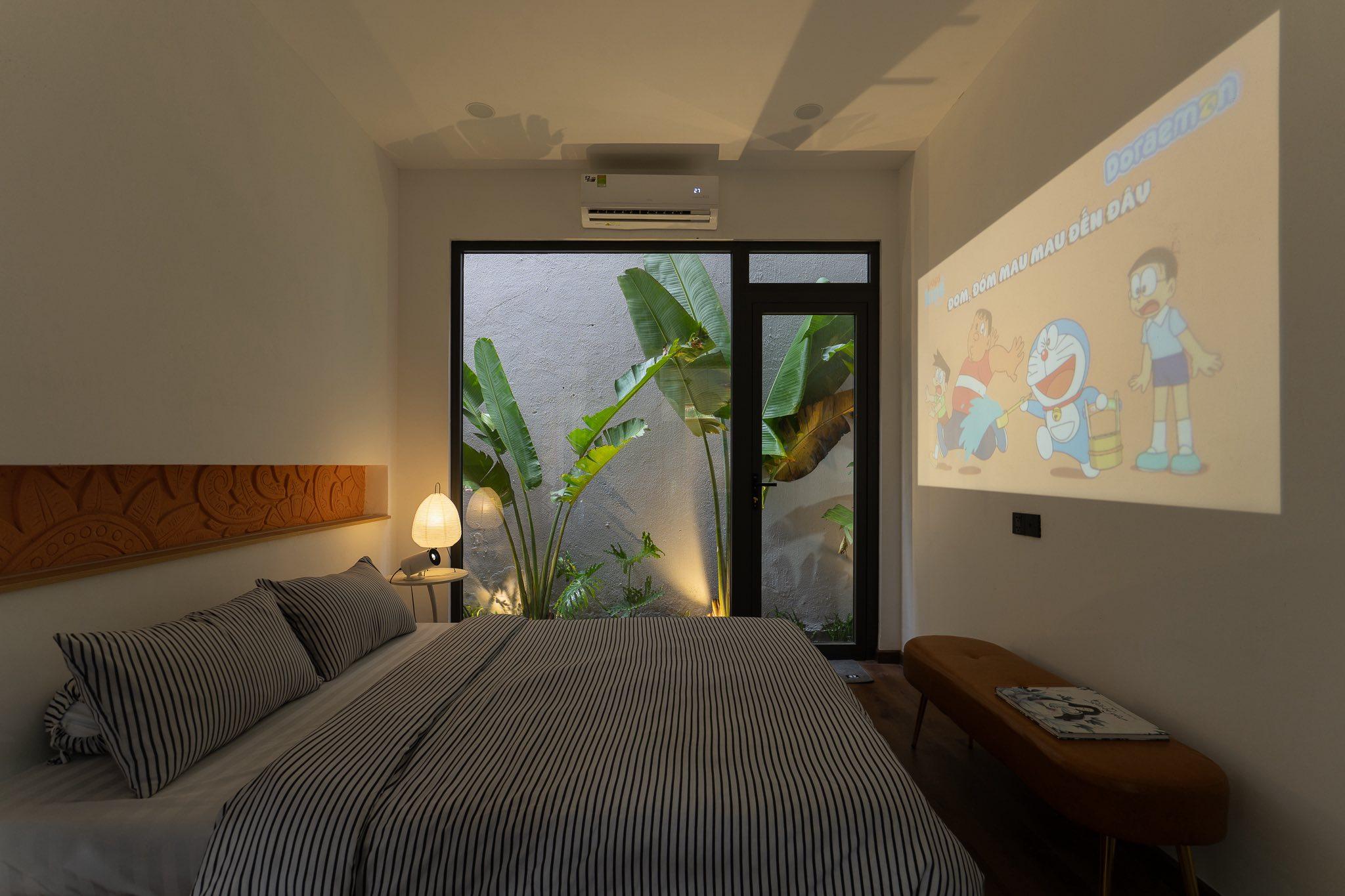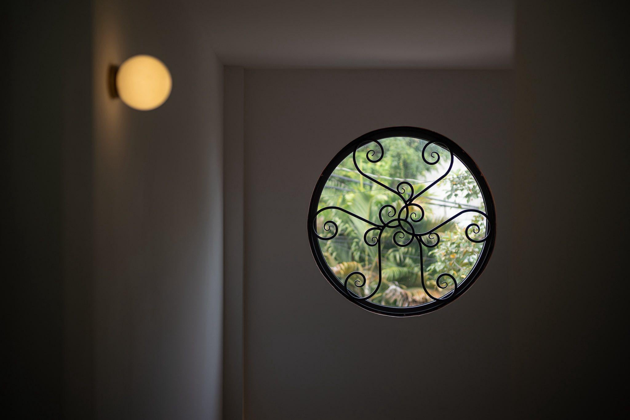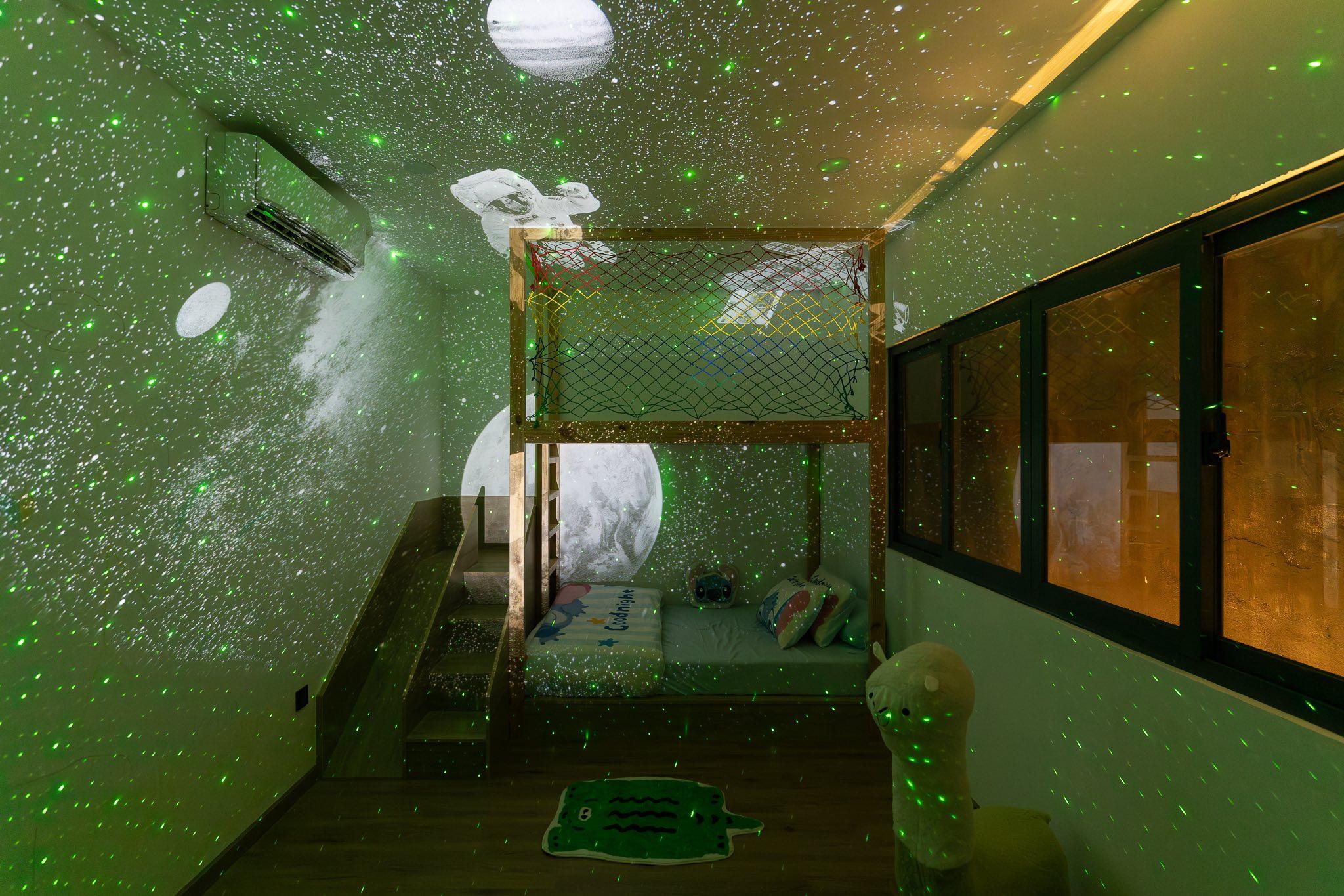 Trẻ con trong nhà được ưu tiên thiết kế riêng một phòng ngủ vui nhộn, có giường tầng bằng gỗ, lưới bảo vệ sắc màu và khu vực chơi thoải mái. Những chi tiết như cửa sổ tròn với hoa sắt uốn cong, cầu thang bê tông đúc hoa văn cổ điển hay đèn giấy treo trần đều là cách khéo léo để cân bằng nét hiện đại – cảm xúc trong cùng một không gian.