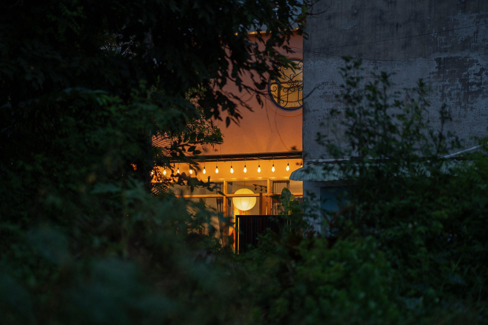 Mặt tiền cam rực, cửa tròn và dàn đèn dây tạo cảm giác vừa hiện đại, vừa hoài niệm