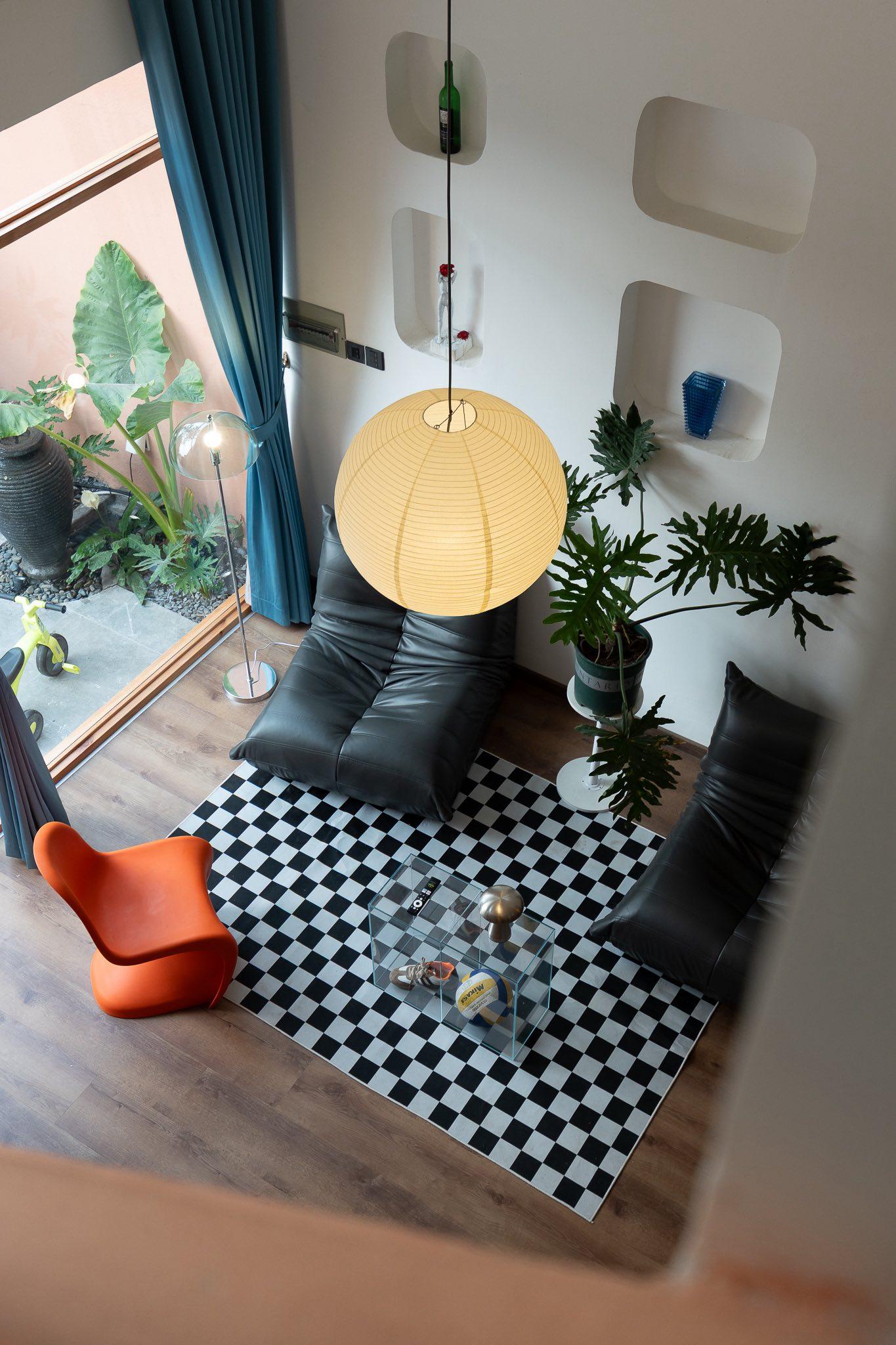 Để cân bằng với sắc cam, các KTS sử dụng các gam màu trung tính như trắng, xám và đen cho phần nội thất bên trong, giúp tổng thể vừa sinh động, vừa hài hòa.