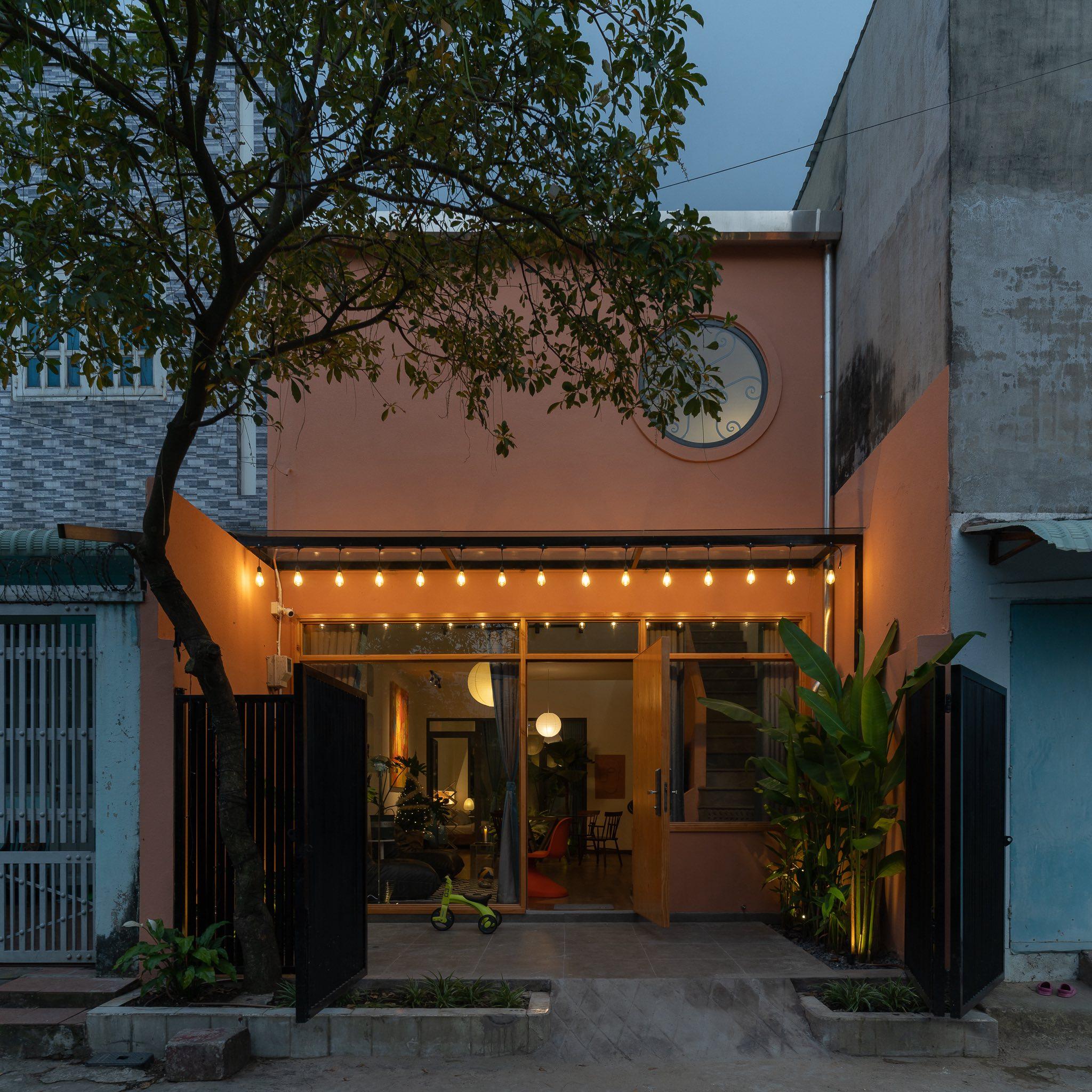 Điểm nhấn đầu tiên của OR House chính là lớp vỏ màu cam đất – màu sắc nổi bật nhưng được xử lý khéo léo để không gây chói mắt. Tông cam này không ngẫu nhiên mà được lấy cảm hứng trực tiếp từ chiếc iPhone 17 phiên bản cam – món đồ yêu thích của gia chủ. Ý tưởng “bê” màu công nghệ vào kiến trúc là cách để họ truyền tải gu thẩm mỹ hiện đại, thời thượng nhưng vẫn cá nhân hóa.