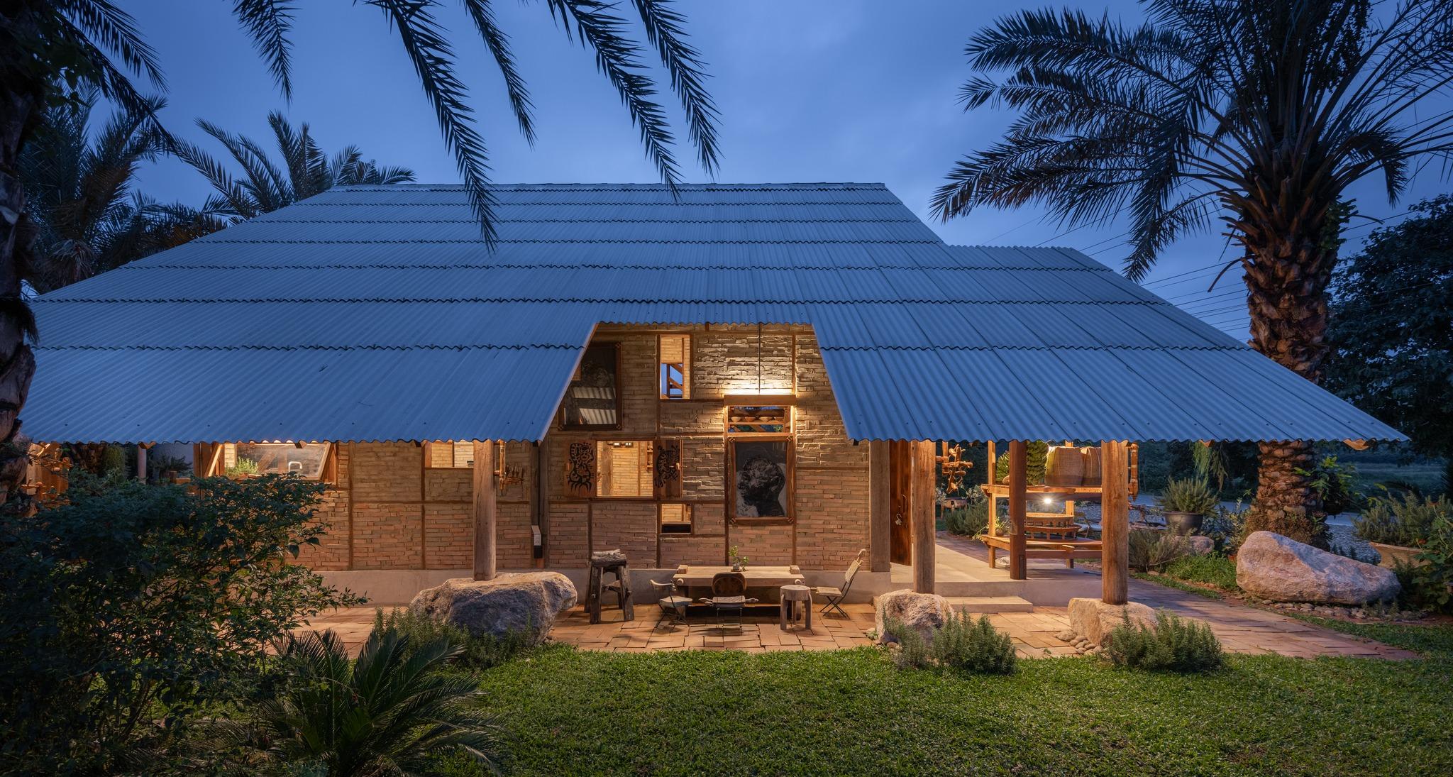 Dự án do Yangnar Studio thực hiện, xuất phát từ nhu cầu của gia chủ: cần một nơi vừa có thể phục vụ hoạt động thương mại, vừa đủ “chất” để trở thành không gian nghệ thuật. Giải pháp chính của nhóm thiết kế là đặt công trình nép dưới tán vườn chà là, tổ chức không gian liền mạch và sử dụng gỗ cũ - đất - đá để kể lại ký ức bản địa bằng một cách rất tự nhiên.