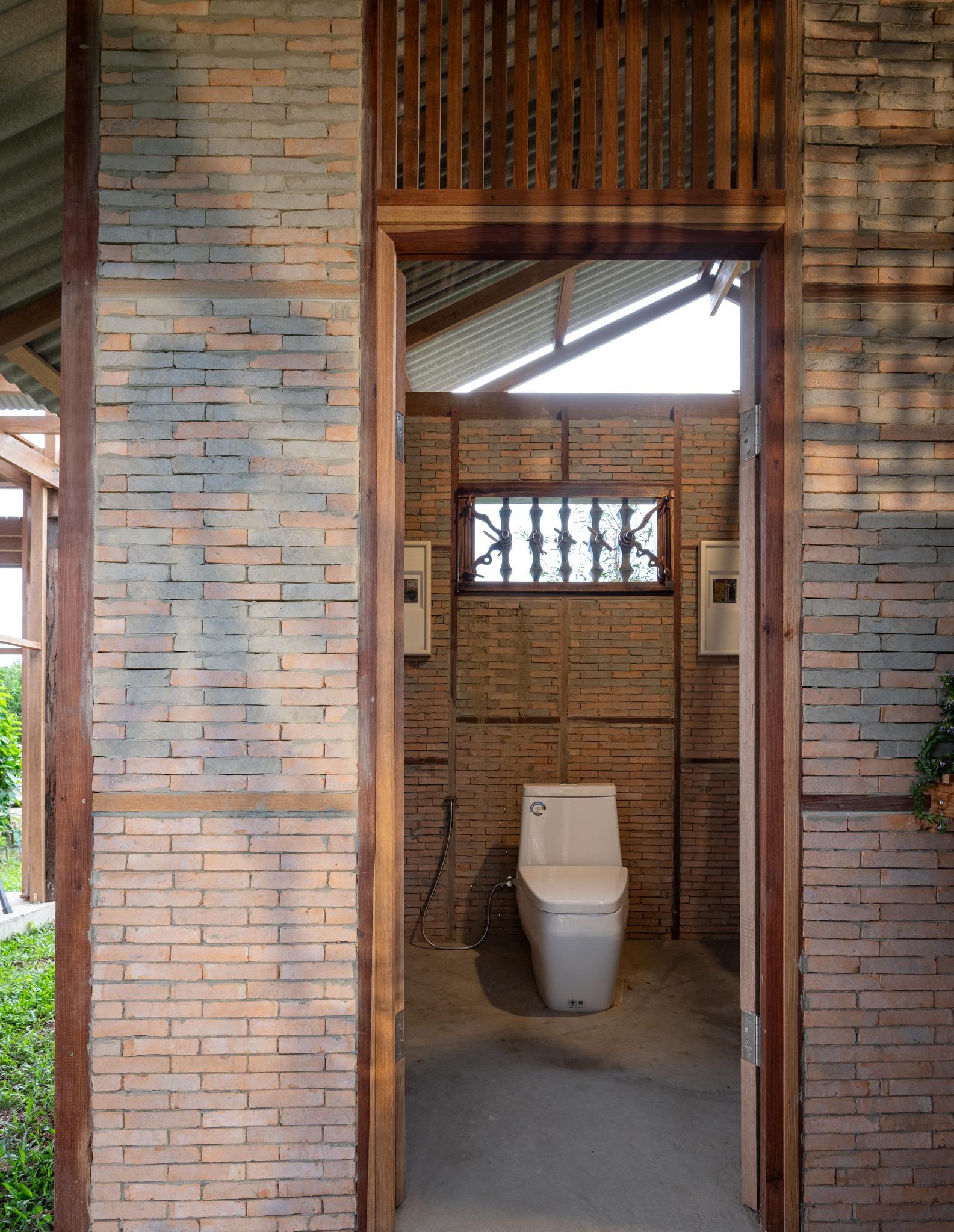 Khu vệ sinh với tường gạch trần, cửa gỗ và chi tiết thông gió phía trên. Giải pháp đơn giản, thoáng khí và giữ thống nhất vật liệu với tổng thể công trình