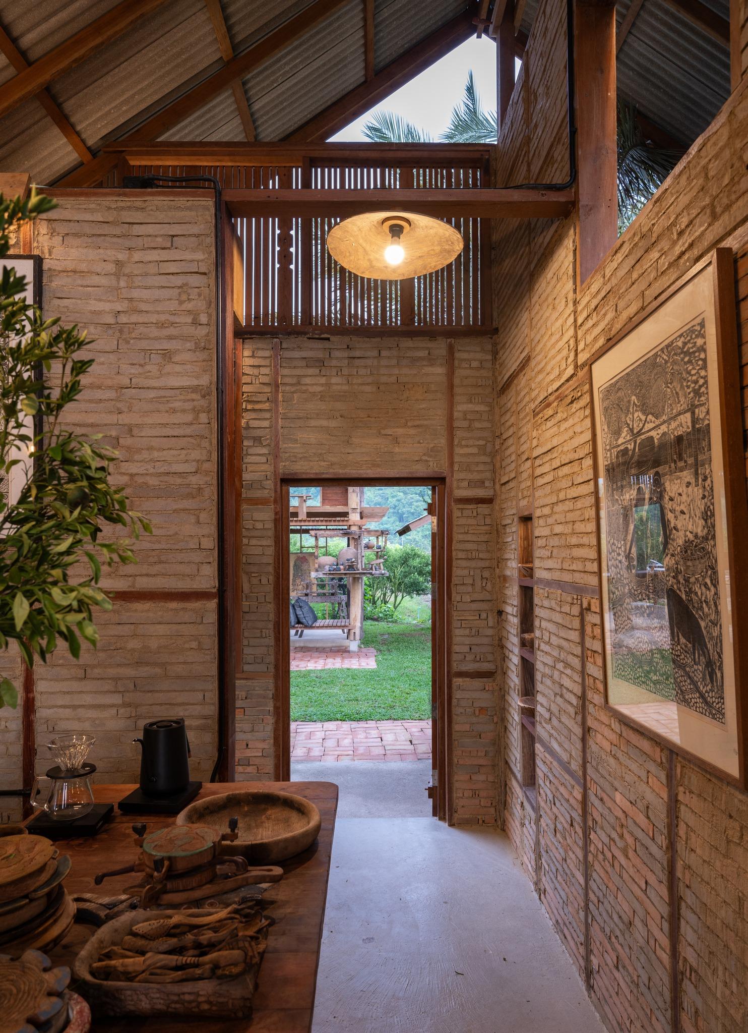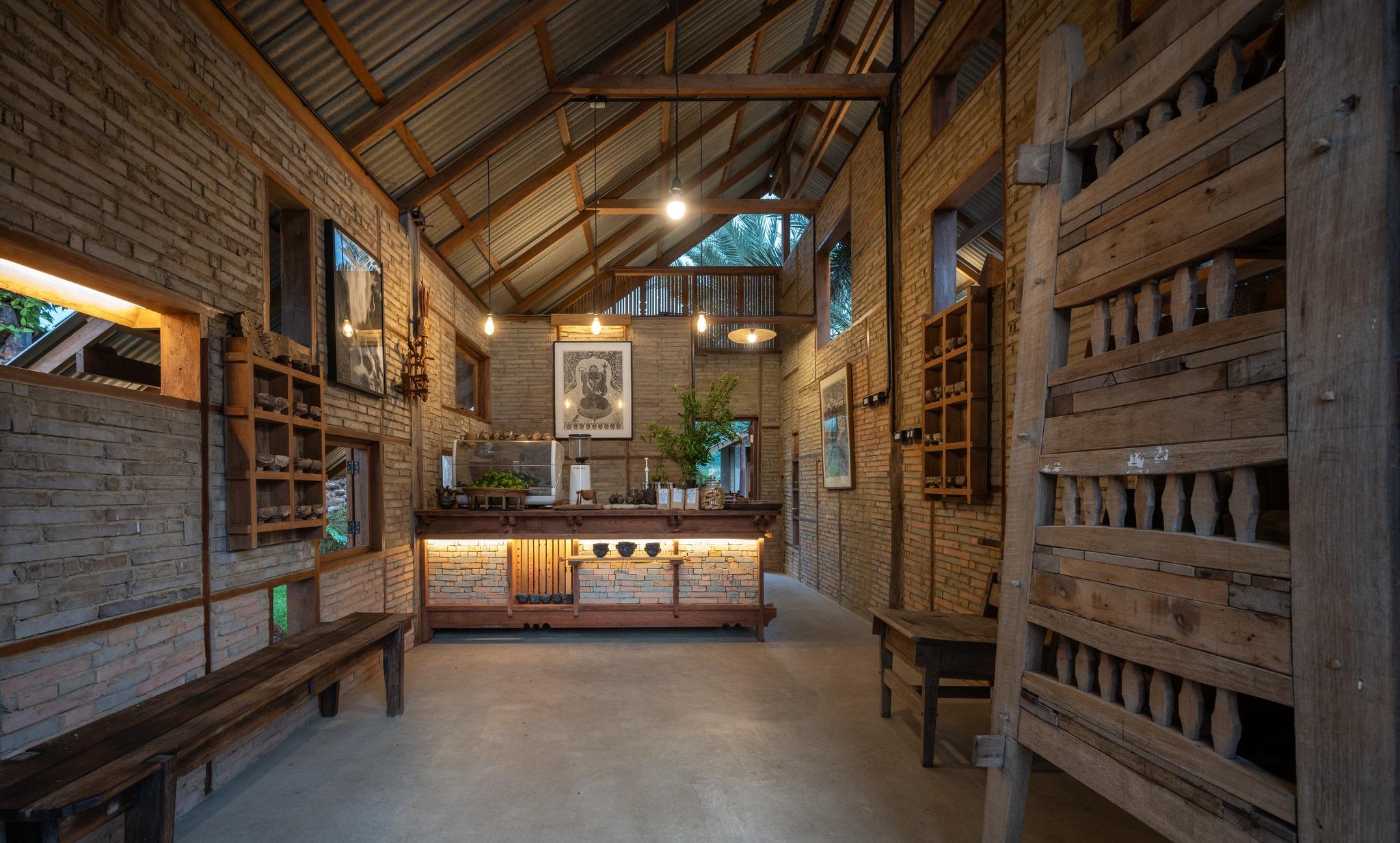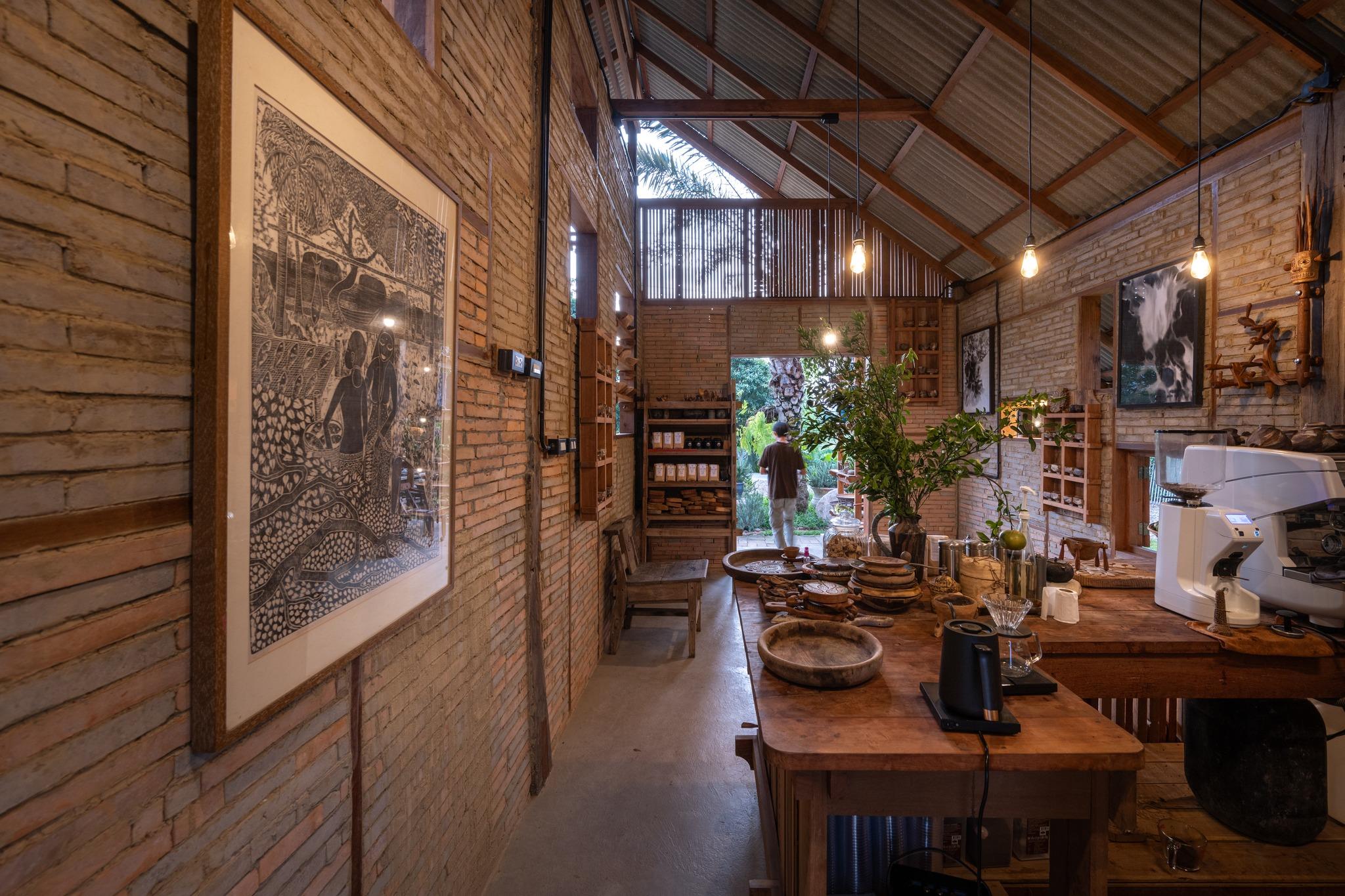 Không gian nội thất chính với tường gạch trần, bàn gỗ lớn và các vật dụng thủ công được trưng bày tự nhiên. Giải pháp mặt bằng mở giúp khu vực thương mại và nghệ thuật kết nối liền mạch, không bị chia cắt cứng