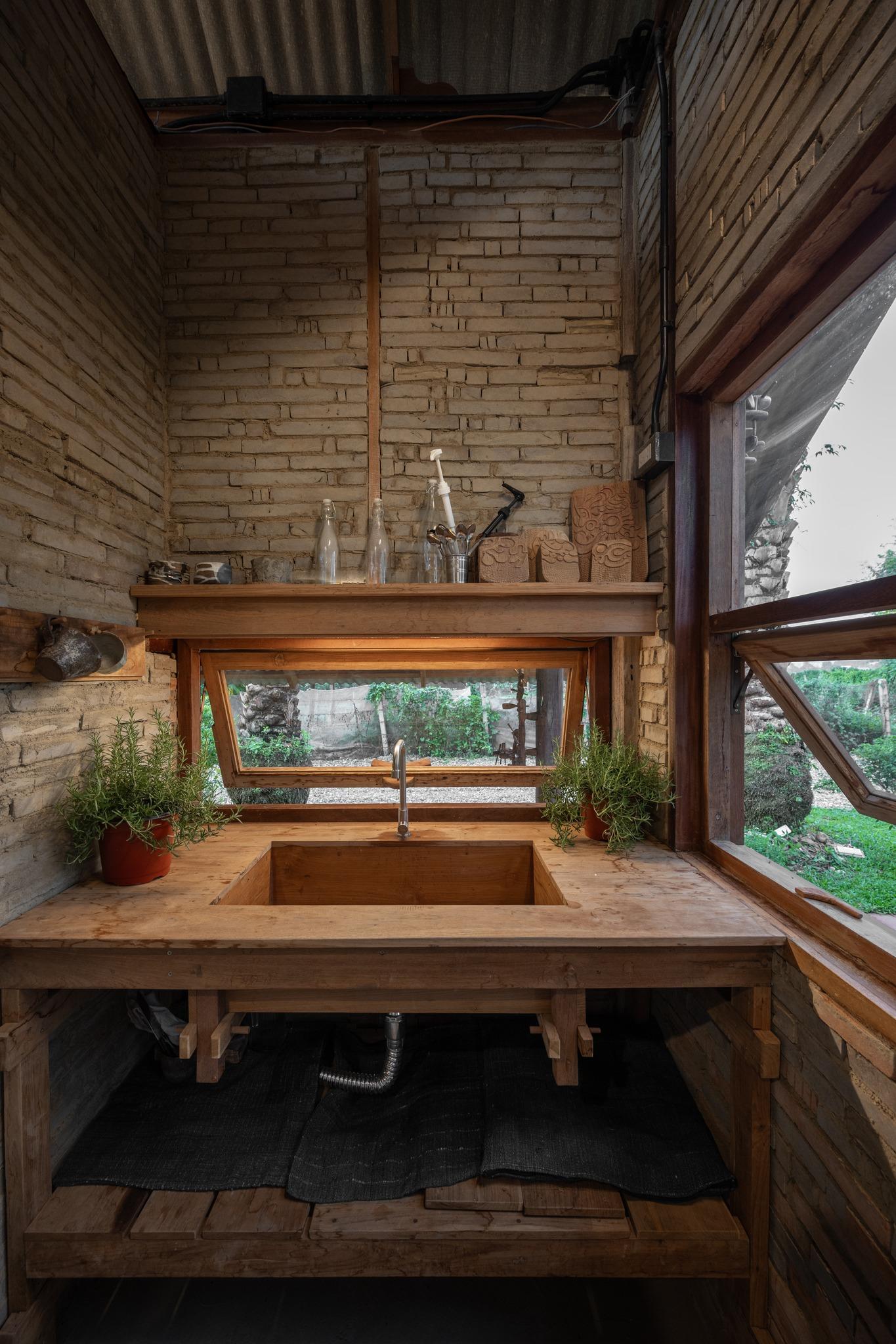 Khu vực bồn rửa với cửa sổ mở thấp nhìn ra vườn, sử dụng gỗ và gạch thô mộc. Thiết kế ưu tiên ánh sáng tự nhiên và thông gió, đồng thời giữ cảm giác gần gũi với đời sống nông thôn