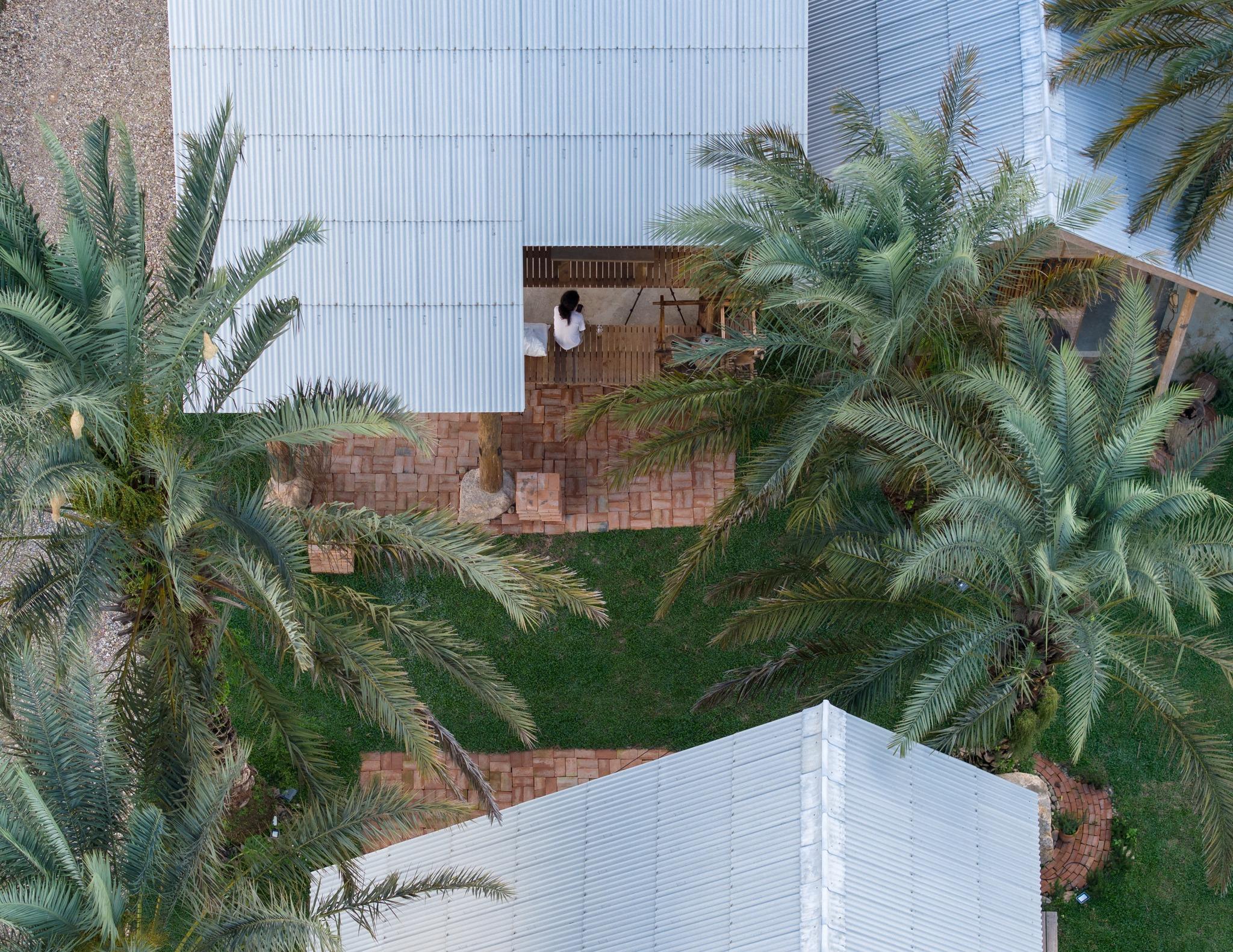 Góc nhìn từ trên cao thể hiện mối quan hệ giữa mái nhà, sân lát gạch và hệ cây xanh bao quanh. Thiết kế tận dụng khoảng trống và cây lớn để tạo vi khí hậu mát mẻ cho toàn bộ công trình
