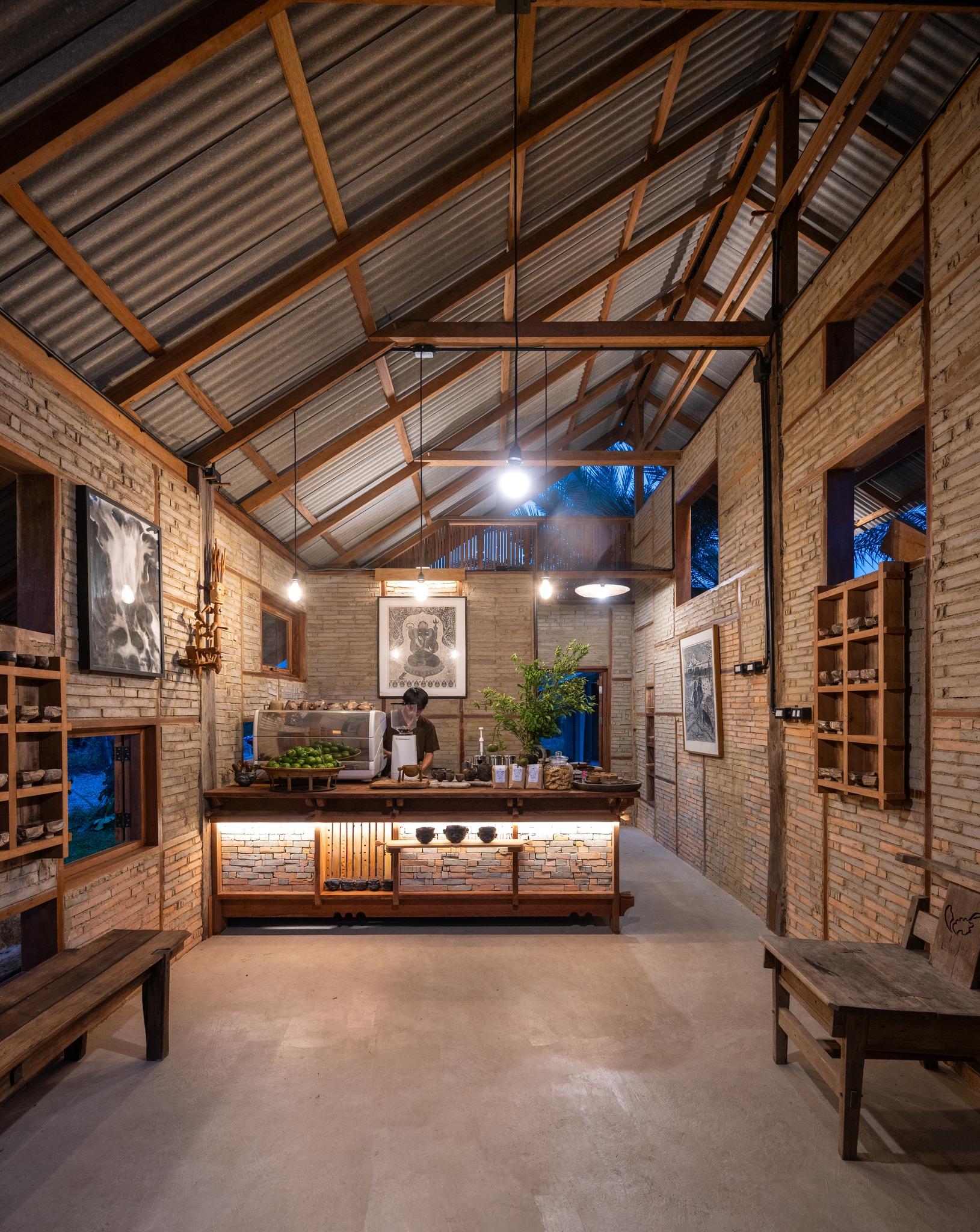 Không gian nội thất trung tâm với quầy phục vụ bằng gỗ, tường gạch trần và trần mái lộ kết cấu. Cách tổ chức không gian cao thoáng giúp ánh sáng và không khí lưu thông dễ dàng