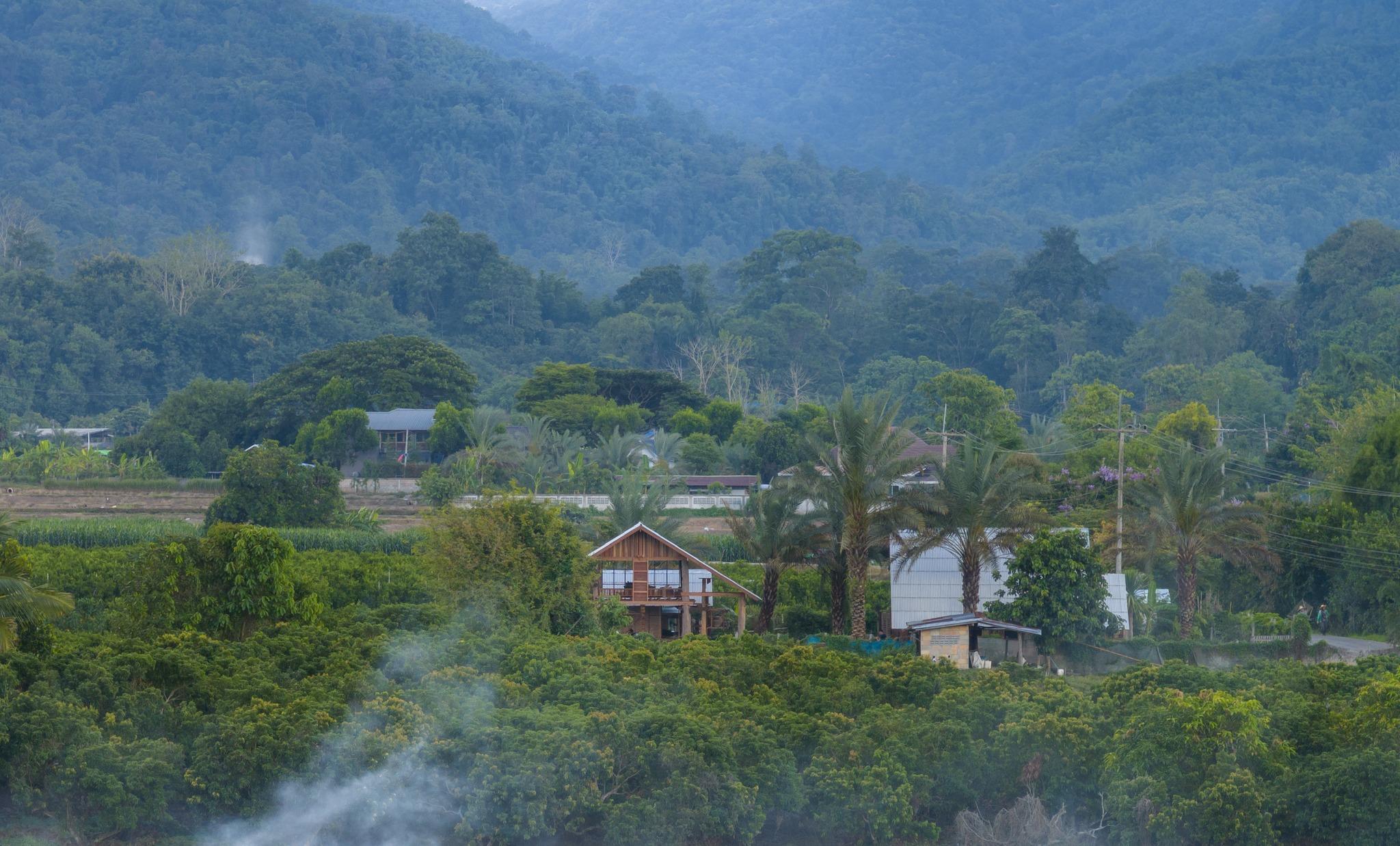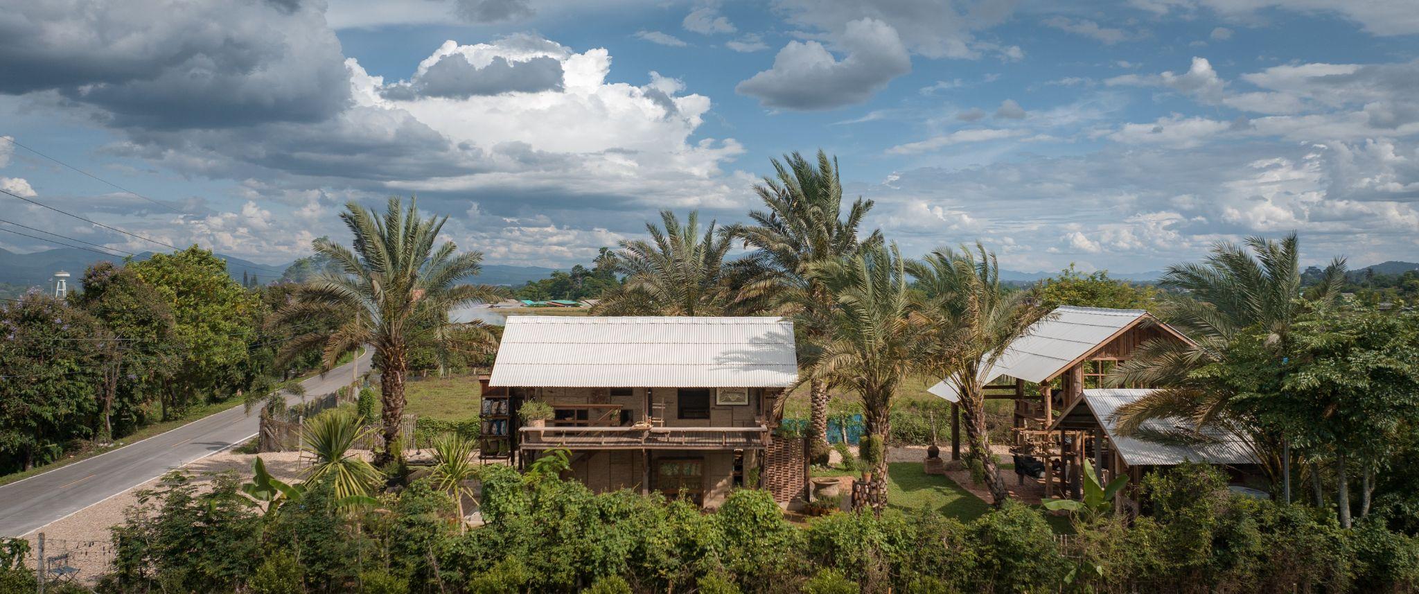 Công trình nằm bên dòng Mae Chai, trên tuyến đường dẫn tới suối nước nóng Fang, xung quanh là cảnh quan núi rừng với dãy Doi Phahompok. Trước một bối cảnh thiên nhiên mạnh như vậy, giải pháp hợp lý nhất không phải là xây thứ gì đó thật nổi bật, mà là biết lùi lại. Khối nhà gỗ được đặt thấp và “lọt” dưới bóng vườn chà là. Nhờ vậy, công trình không chiếm lấy cảnh quan, mà để cảnh quan bao bọc công trình.