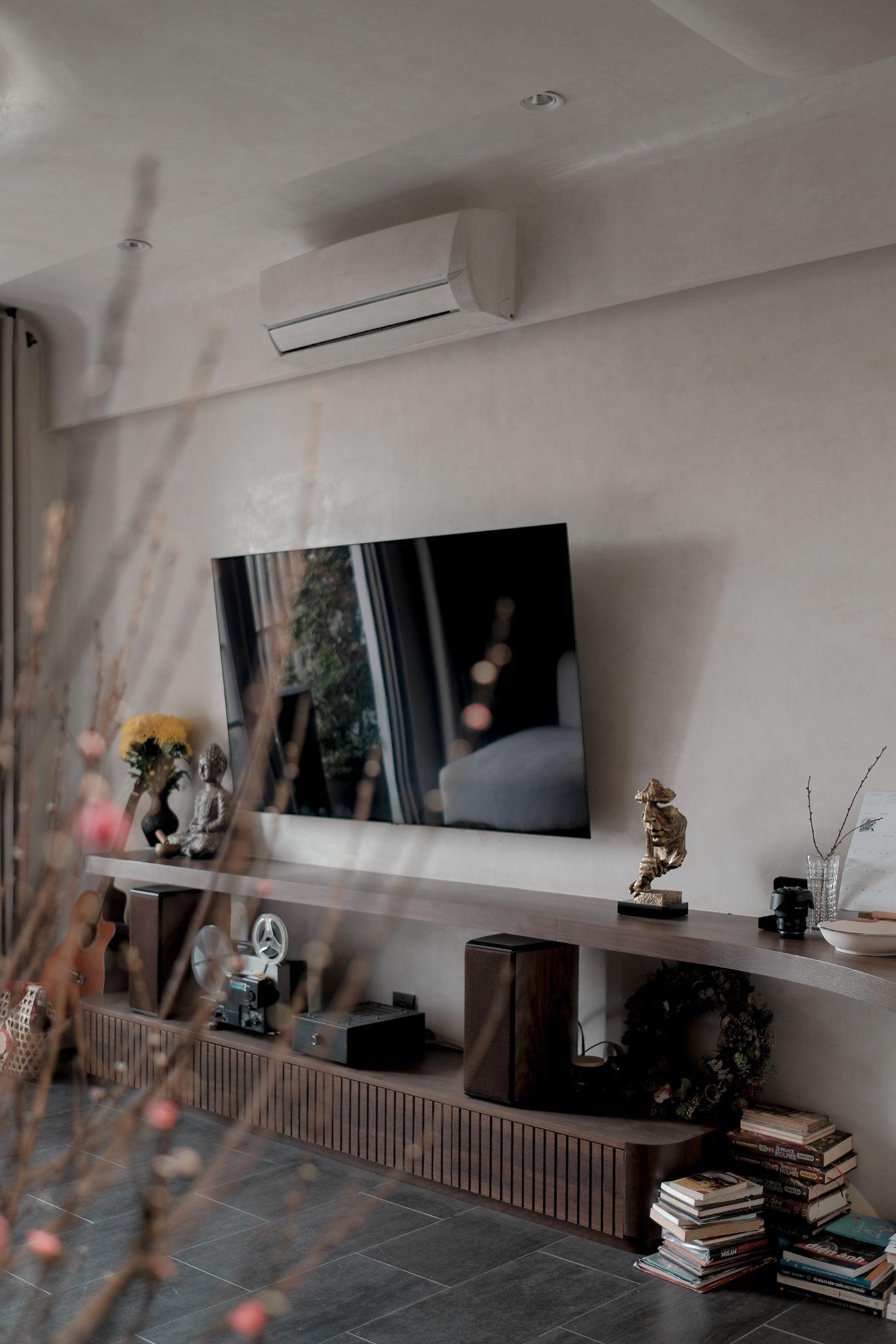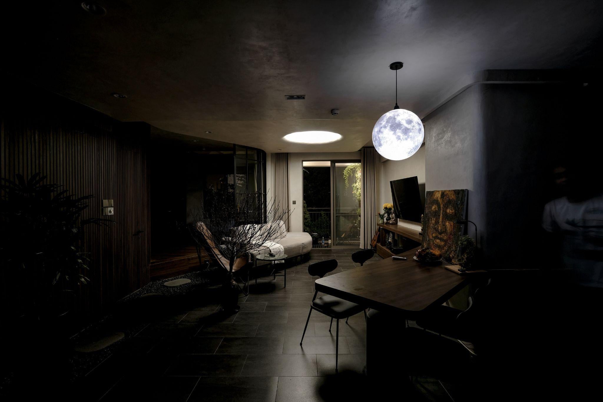Khi đêm xuống, Wrinkle Home không cần đến nhiều đèn chiếu sáng. Chủ nhà bật hệ đèn “trăng” treo trần hoặc ánh sáng hắt nhẹ từ kệ TV – thế là đủ để cảm thấy được bao bọc. Khu vực sofa với chiếc ghế bướm da, bàn trà đá xanh và lọ đào bung nụ trở thành nơi lý tưởng để tạm dừng.