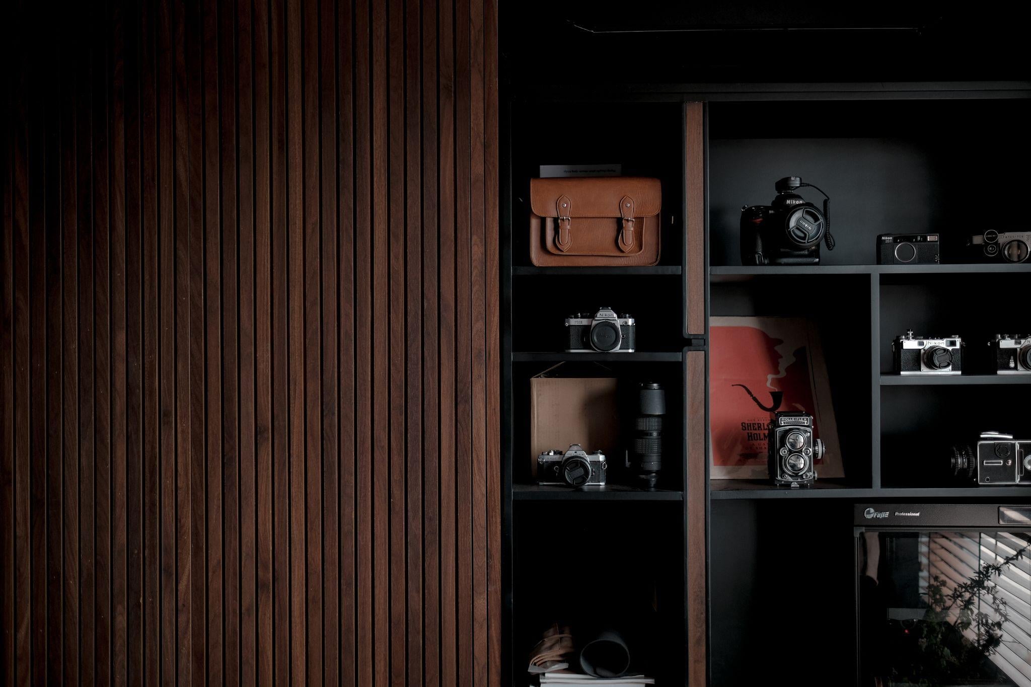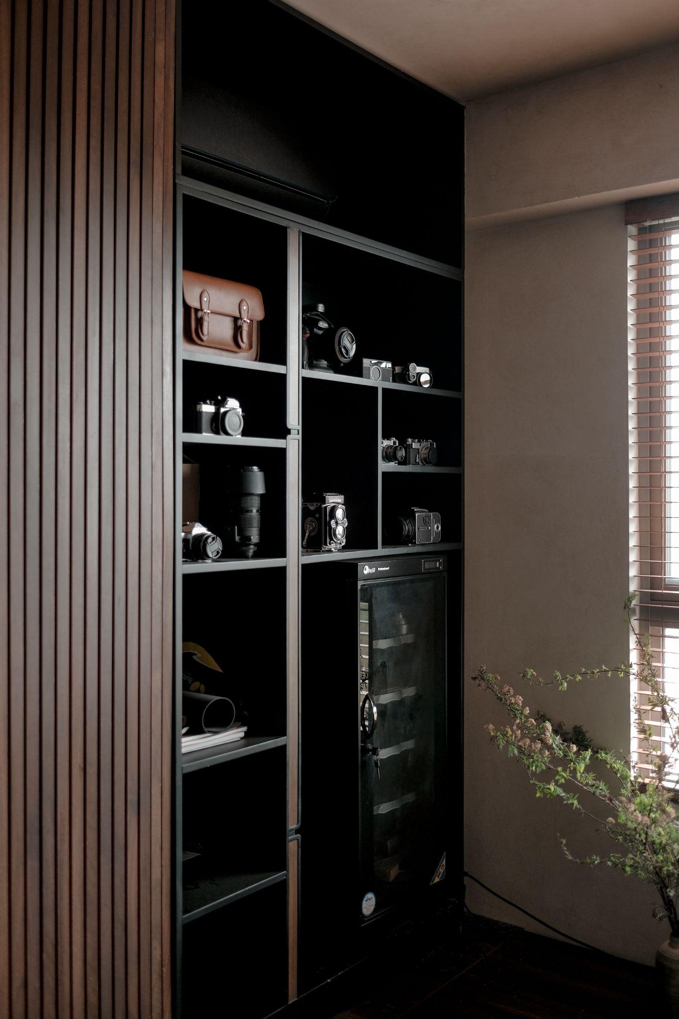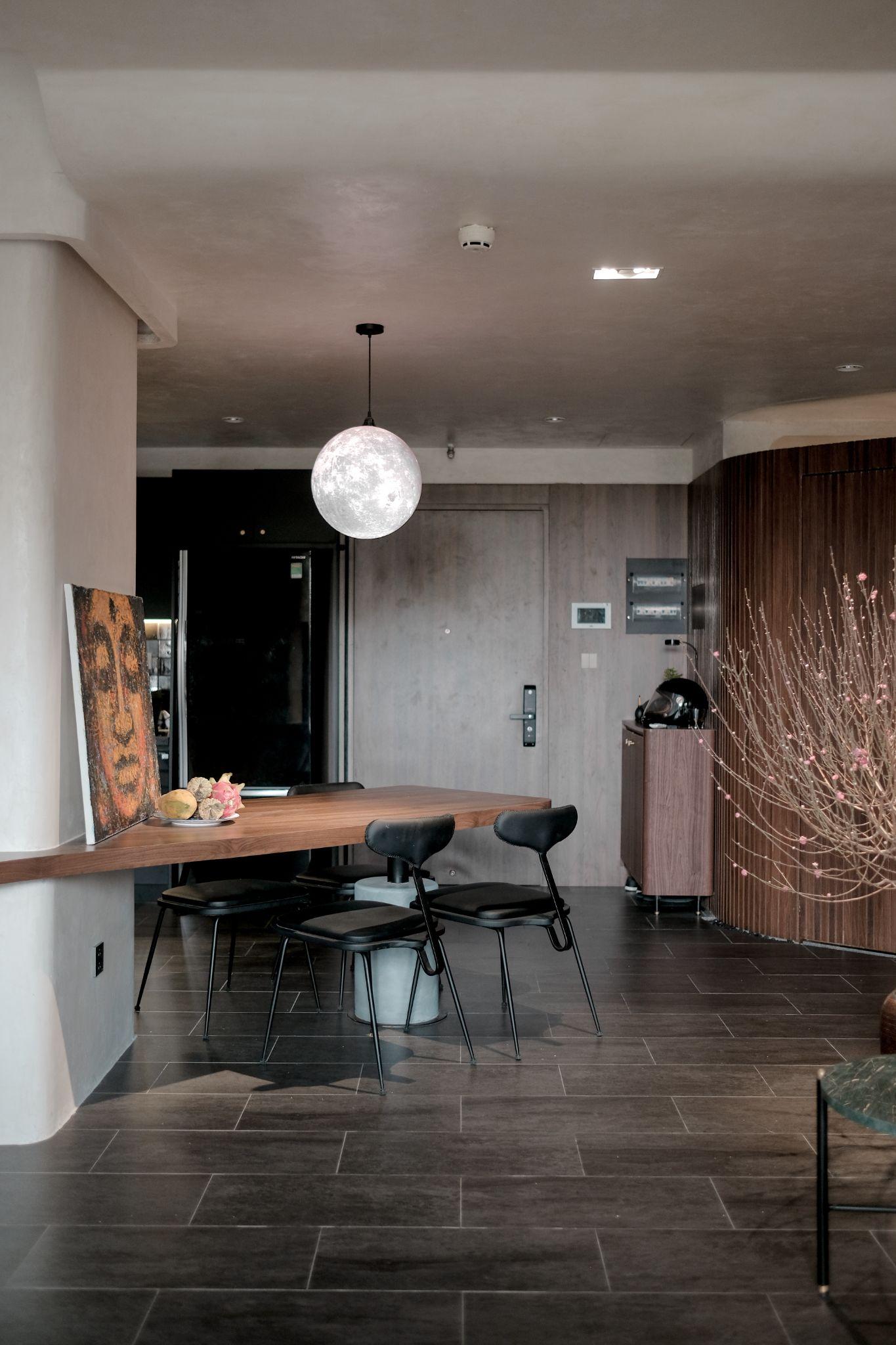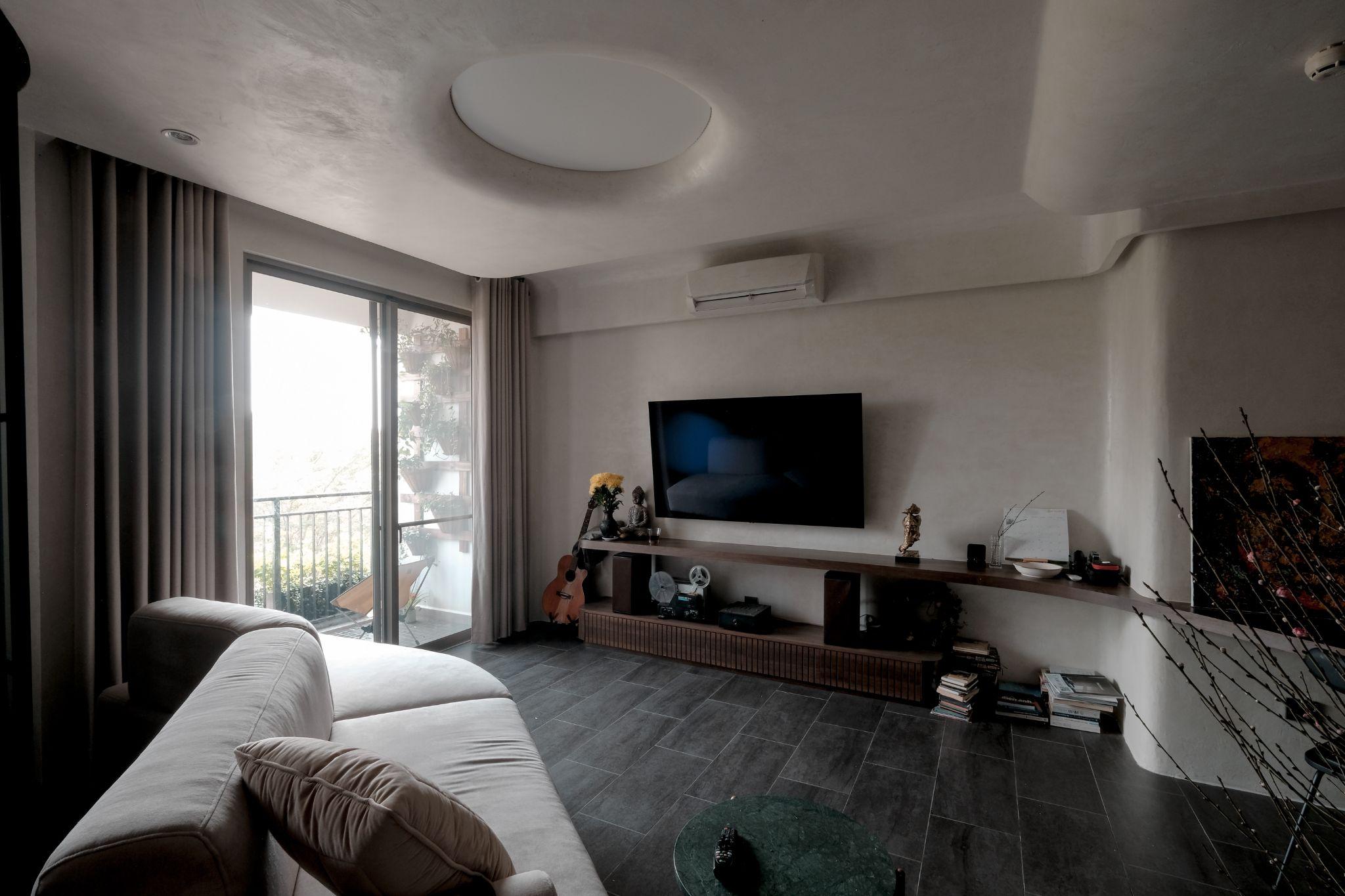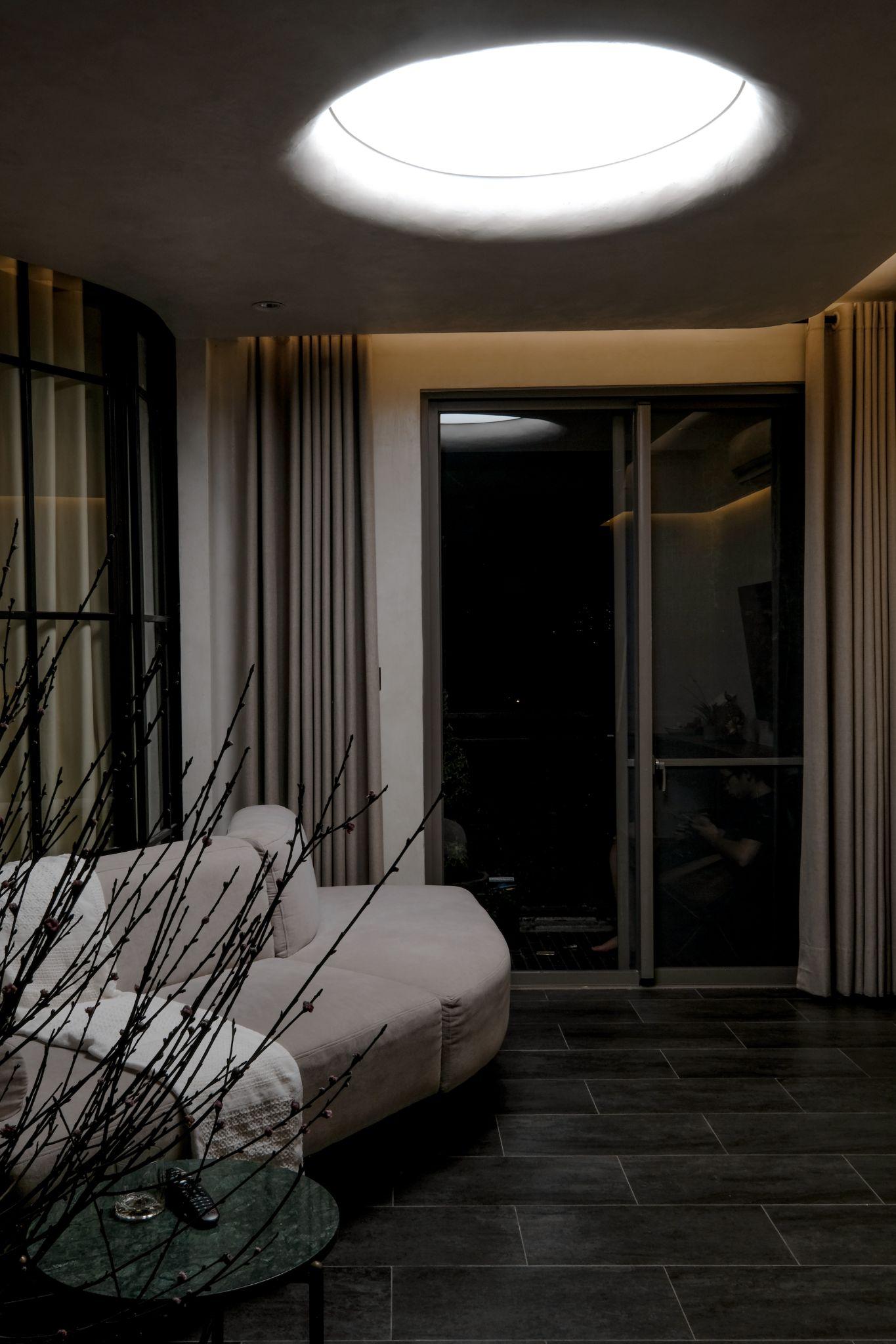 Bước vào nhà, bạn sẽ không thấy sự “căng cứng” của những căn hộ hiện đại gượng ép theo xu hướng. Thay vào đó là một hệ trần như lượn sóng, ánh sáng hắt dịu từ các khe âm trần, chiếc đèn tròn mô phỏng mặt trăng lửng lơ, và những điểm nhấn bằng cây xanh, gốm, ảnh chân dung, hay dàn máy ảnh film – tất cả mang màu sắc rất riêng của một tâm hồn nghệ sĩ.