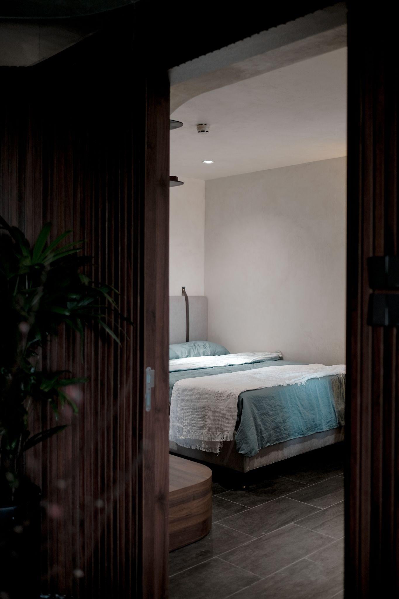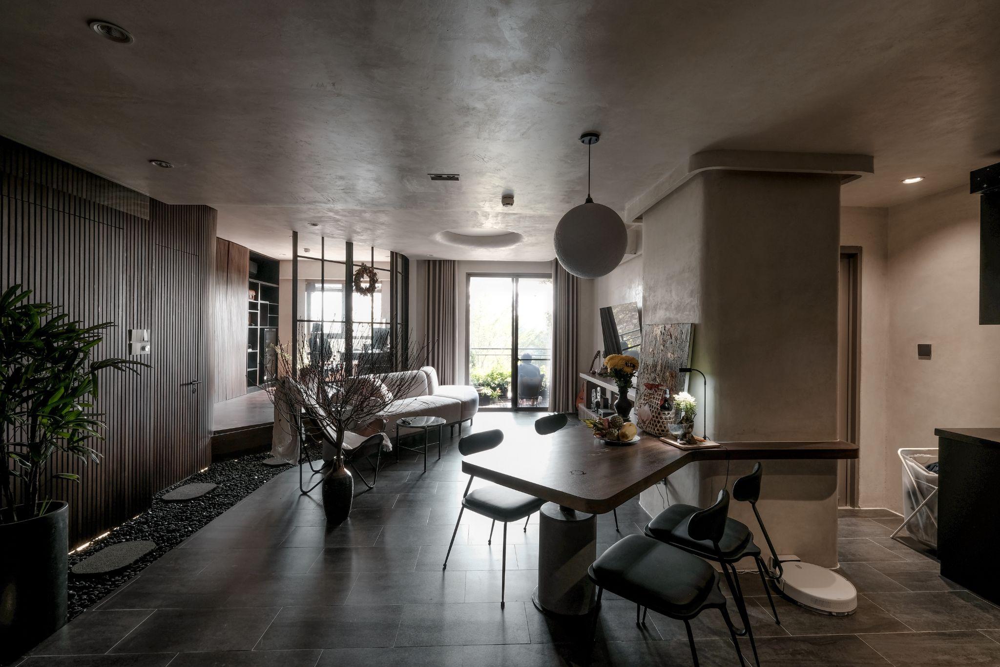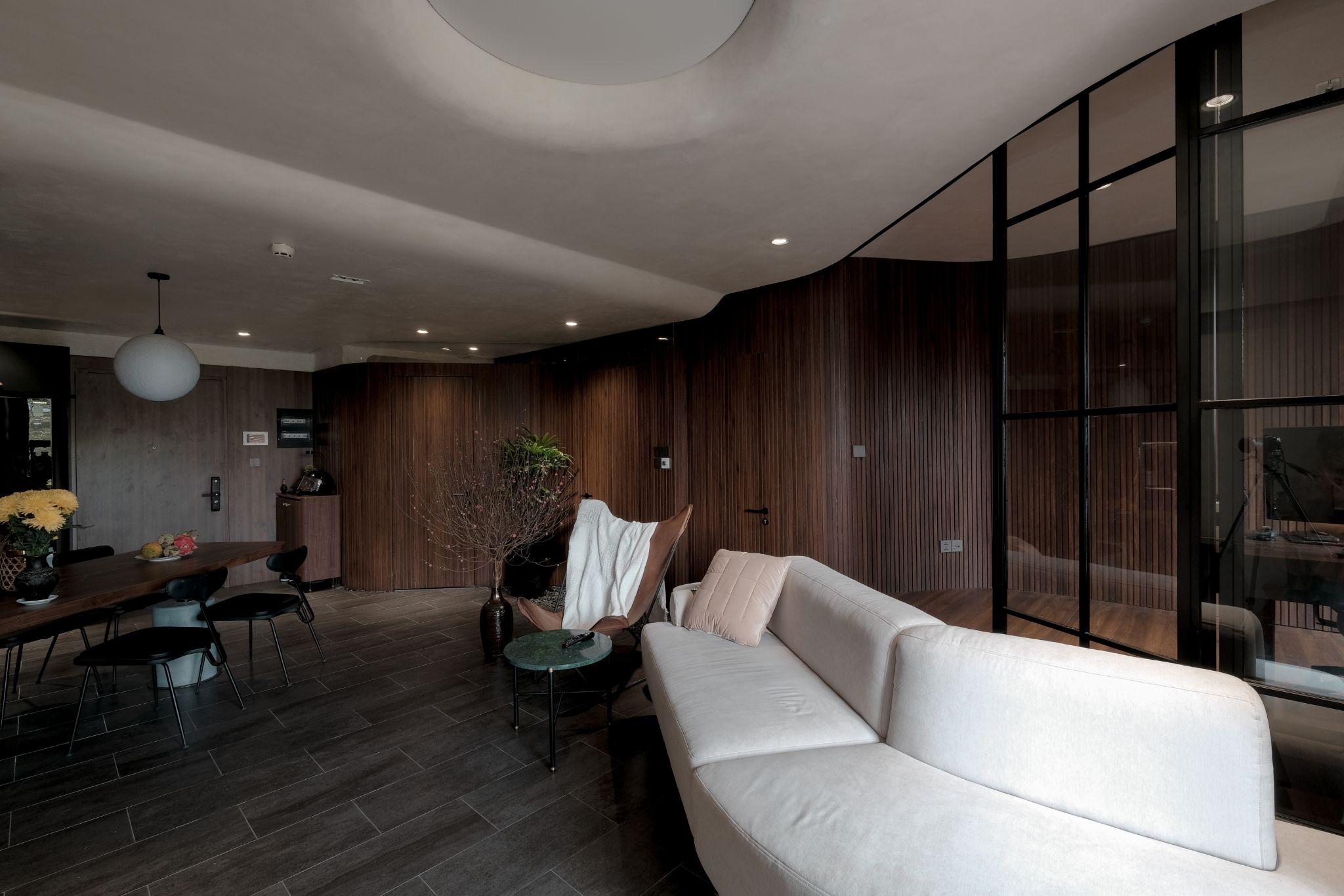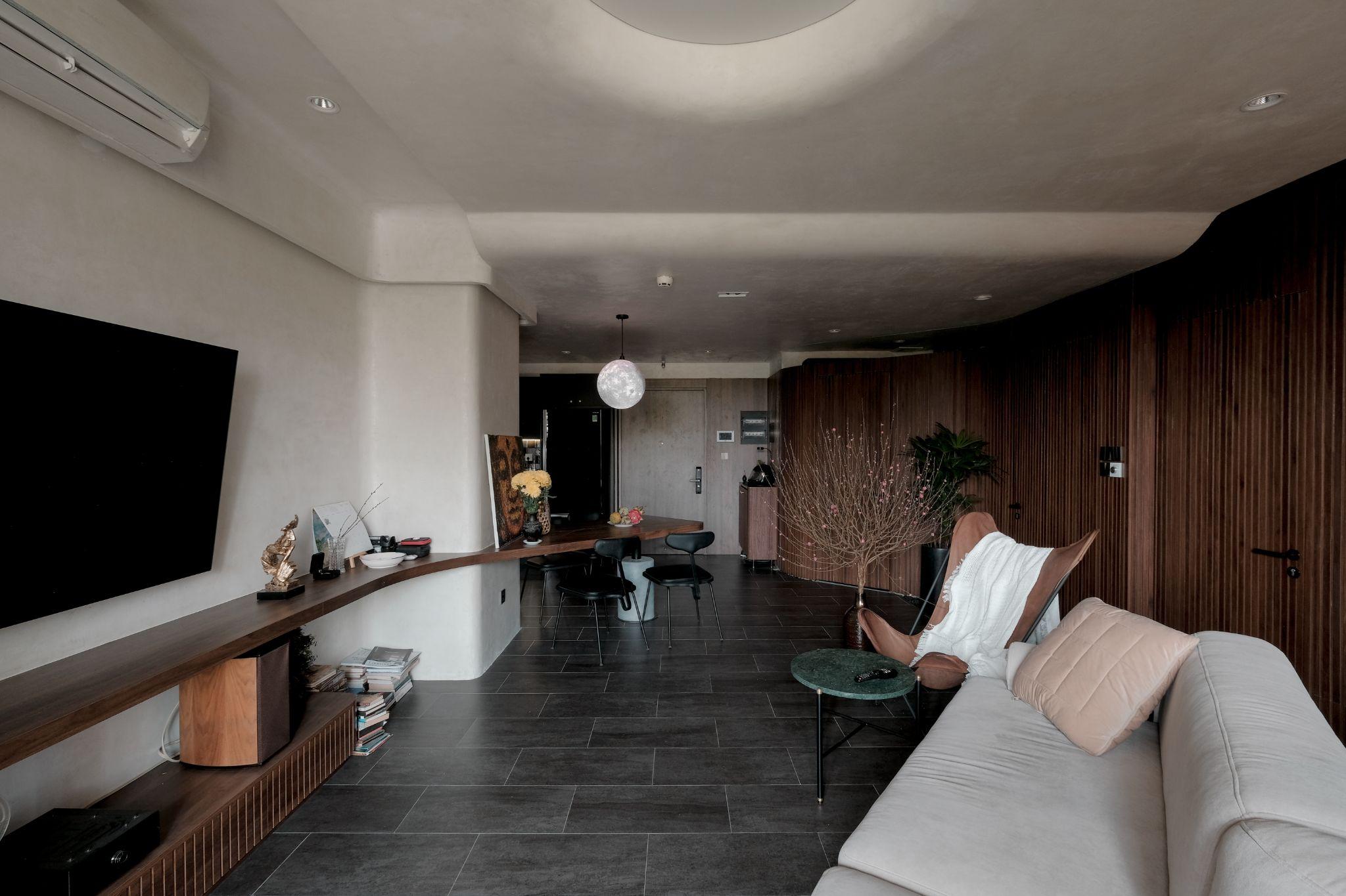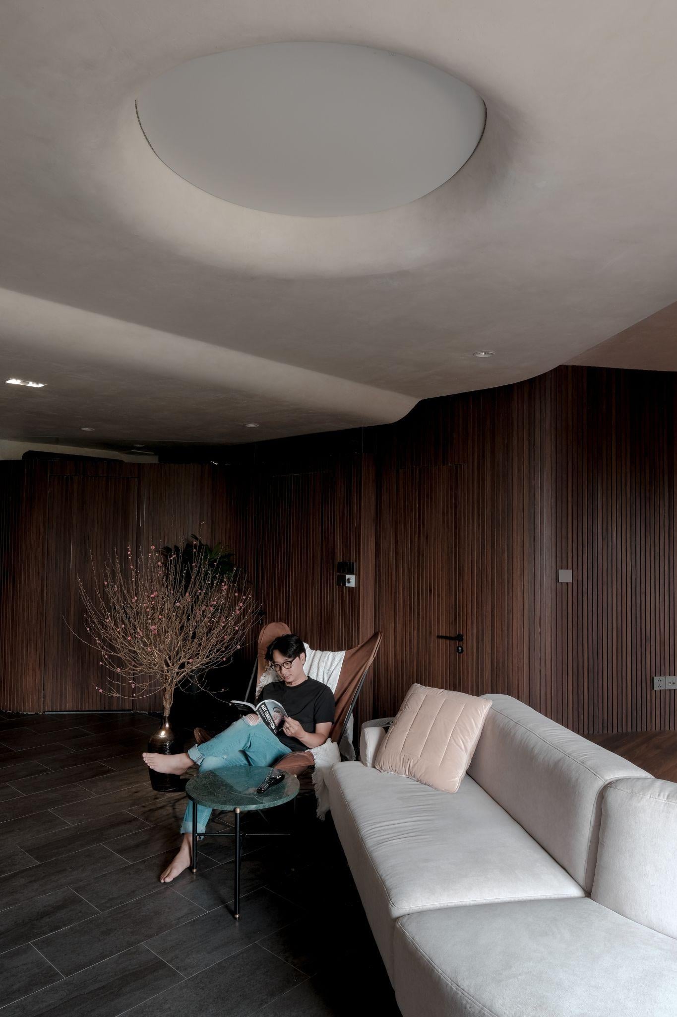 Không gian trong Wrinkle Home không bị chia cắt bằng các mảng tường vuông vức, mà được “gấp nhẹ” – bằng trần lõm, bằng bo góc, bằng các đường cong vừa đủ để tạo nên ranh giới mà không ngắt dòng chảy. Những mảng tường bả thô, ánh sáng gián tiếp và vật liệu gỗ tone trầm được kết hợp có chủ ý để tạo chiều sâu thị giác và cảm giác thư giãn tuyệt đối.