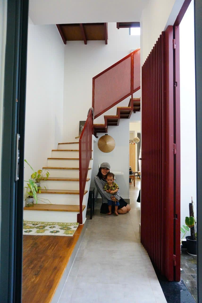 Ngôi nhà 5x33 không chạy theo những thiết kế phức tạp, mà chọn cách tối giản vừa đủ – từ màu sắc, vật liệu đến bố cục. Tường trắng, gạch kính lấy sáng, lan can kim loại đỏ rượu, cửa mở xoay gấp… mọi chi tiết đều mộc mạc nhưng có điểm nhấn, đủ để không gian không bị đơn điệu.