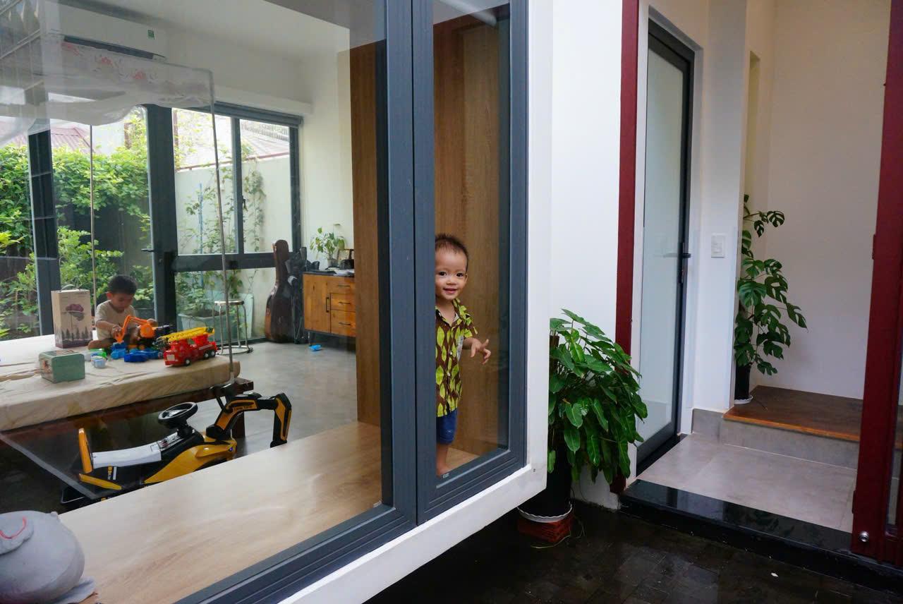 Ngay trung tâm nhà là một khoảng sân trong – chi tiết đóng vai trò nút giao không chỉ về thông gió mà còn về cảm xúc. Tại đây, ánh sáng tự nhiên len qua những ô kính, gió đối lưu giữa trước và sau nhà. Từ cầu thang, phòng ngủ, phòng ăn đến phòng làm việc, mọi không gian đều có thể "chạm" vào khoảng sân ấy, như một lõi sống xanh của ngôi nhà.