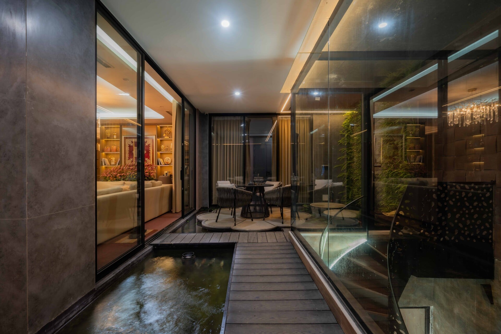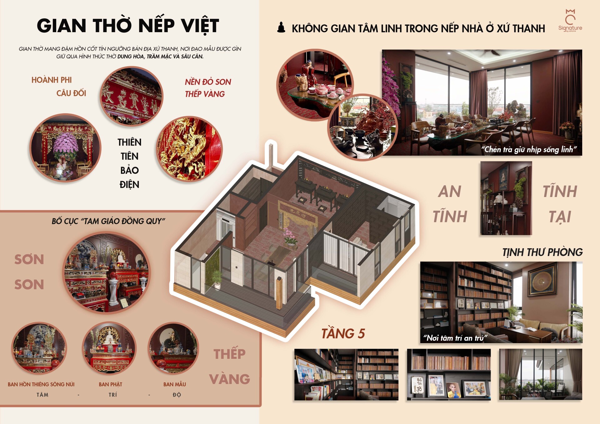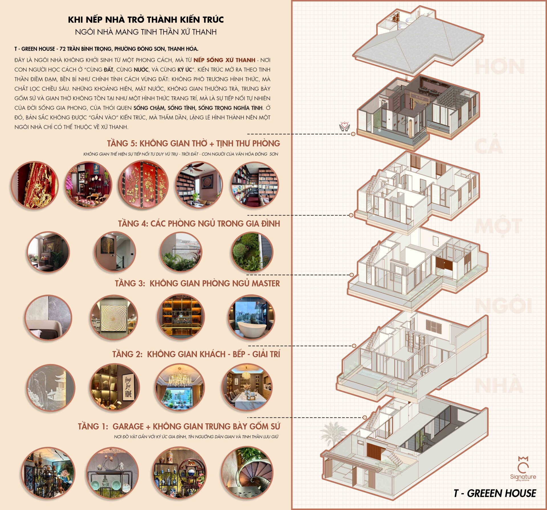 Hơi thở của đời sống và văn hóa bản địa xứ Thanh được các kiến trúc sư trân trọng và chuyển hóa một cách tinh tế vào những không gian sinh hoạt chung như phòng trà, khu thờ và trục giao thông đứng, tạo nên những "điểm chạm" giao thoa để các thế hệ trong gia đình có thể gặp gỡ, chia sẻ và duy trì nhịp sống truyền thống. Sự hiện diện của ánh sáng tự nhiên, cây xanh và mặt nước được kiểm soát một cách chủ đích, hòa quyện cùng bảng màu trầm và vật liệu thô mộc, mang lại cảm giác bình yên, quen thuộc nhưng vẫn đậm chất đương đại.