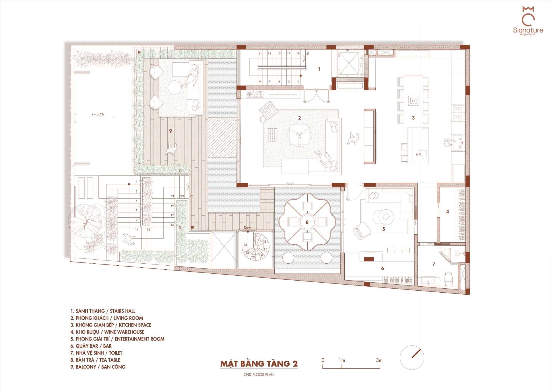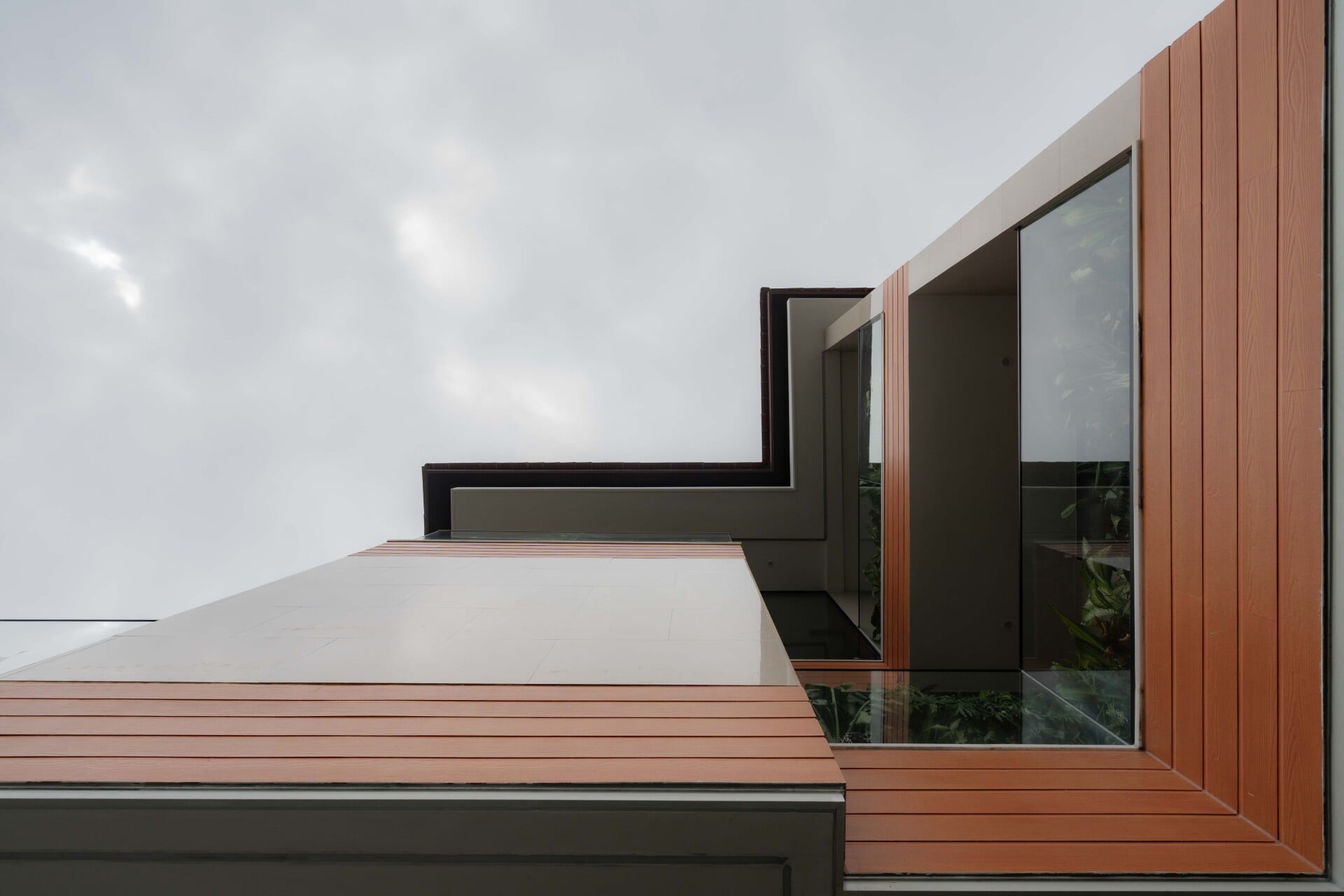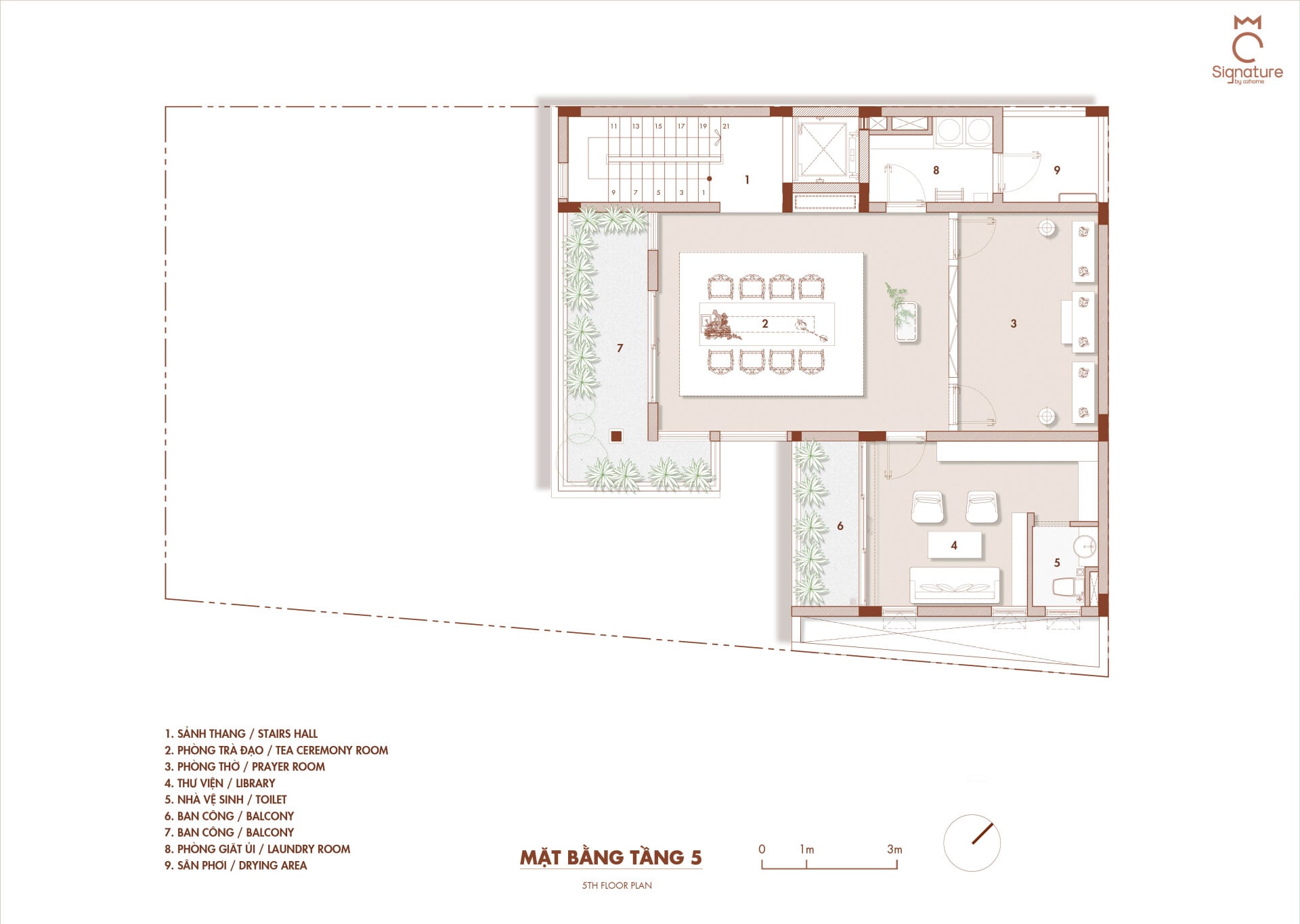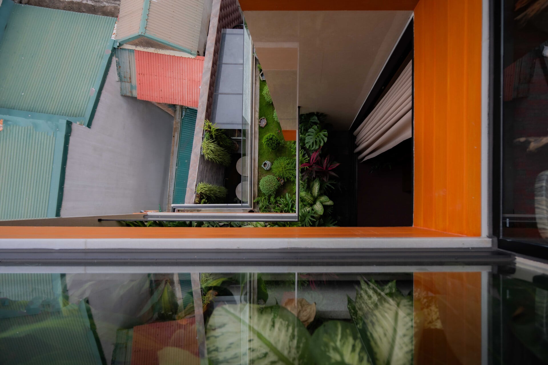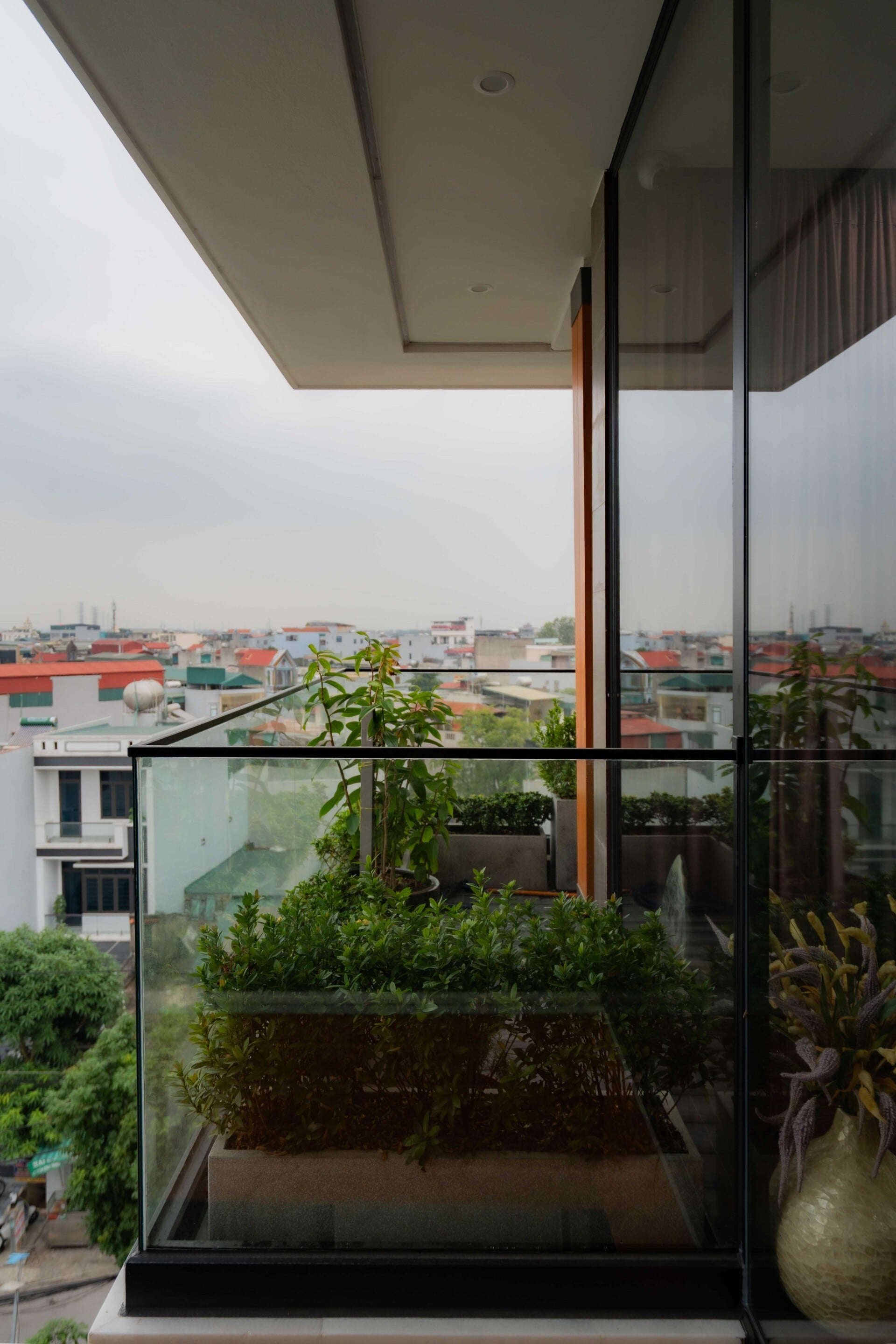 Ngôi nhà phát triển theo phương đứng với sự sắp đặt khéo léo của các lớp không gian đệm đan xen bao gồm ban công, hiên nhà và những khu vườn nhỏ, đóng vai trò như những khoảng chuyển tiếp mềm mại, giúp tách biệt đời sống riêng tư ấm cúng khỏi nhịp sống hối hả, ồn ào của thành phố.