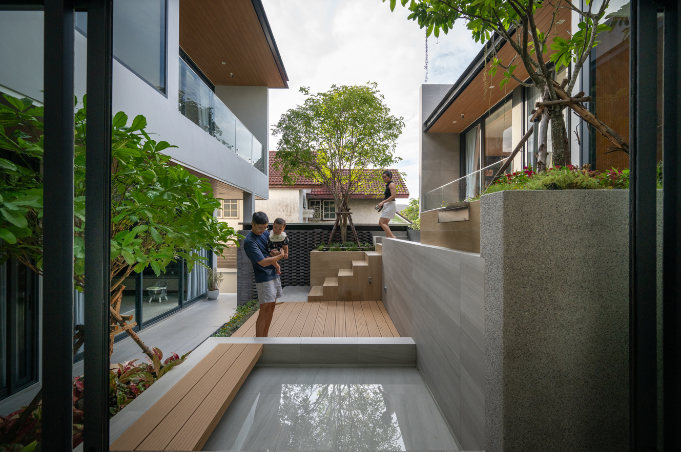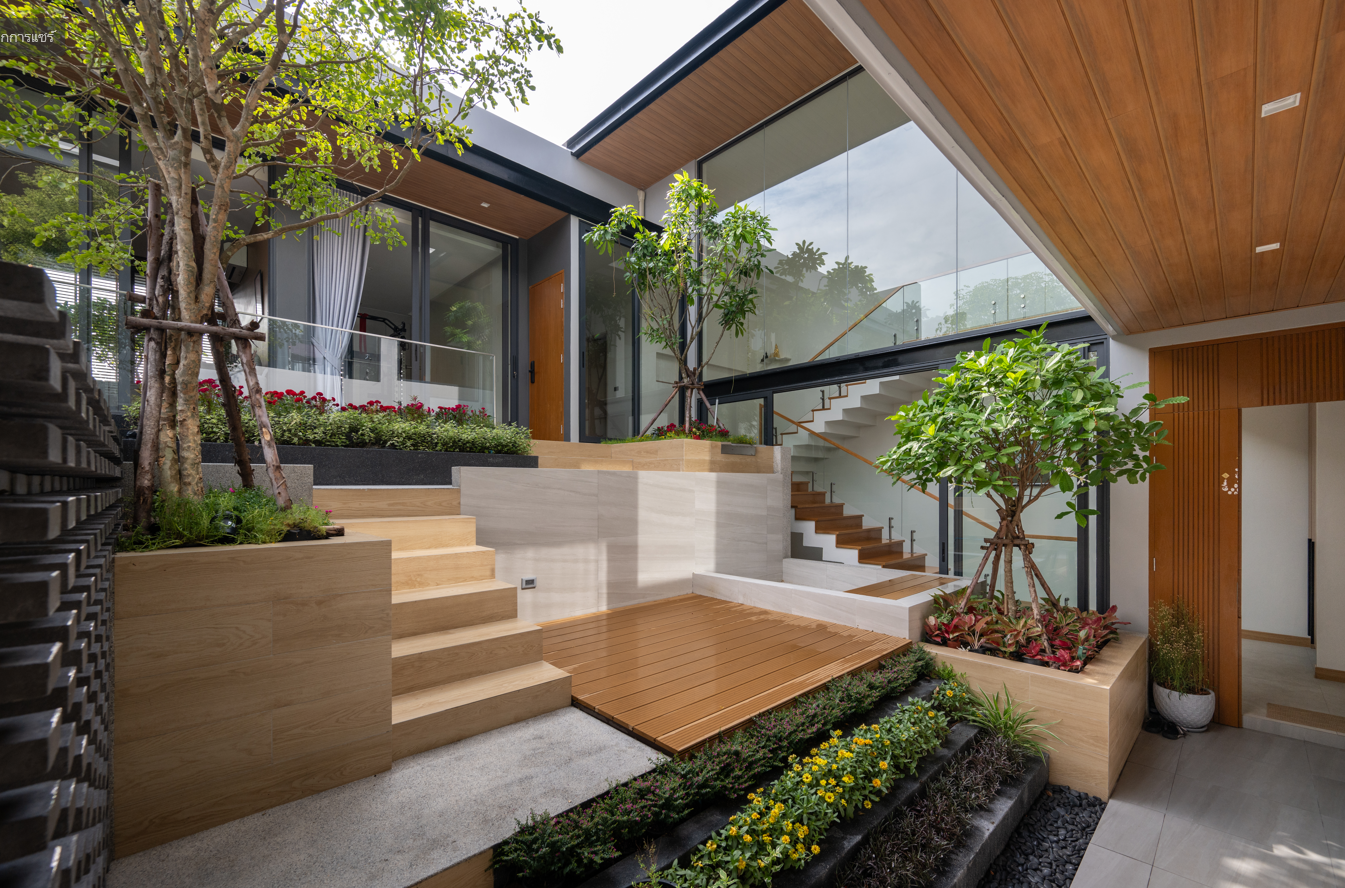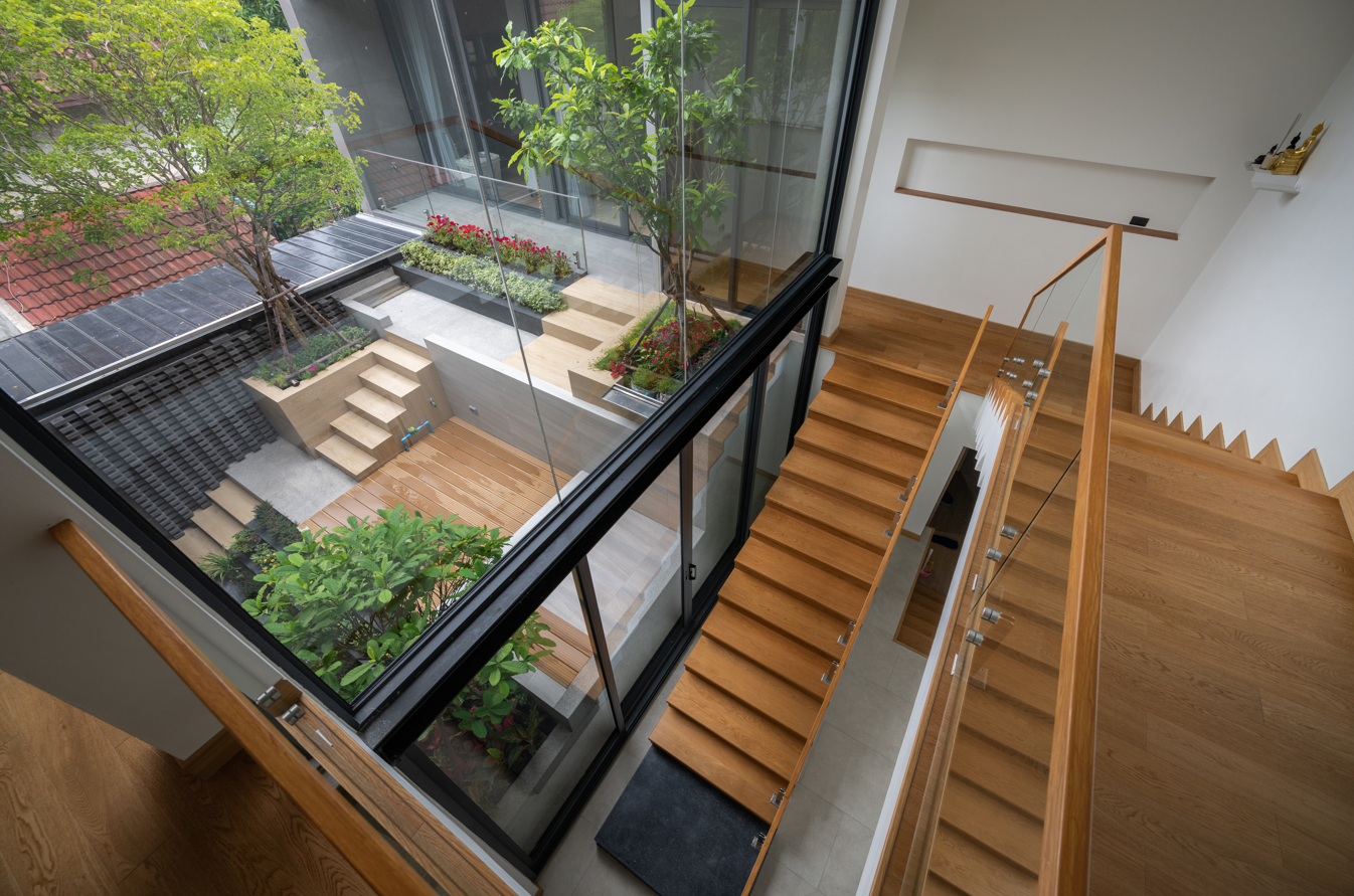 Khoảng sân trong với nhiều bậc thang và sàn gỗ là “trái tim” của ngôi nhà, nơi ánh sáng và cây xanh hòa quyện. Không gian này đóng vai trò như khu vườn nhỏ, kết nối liền mạch các phòng ở 2 tầng