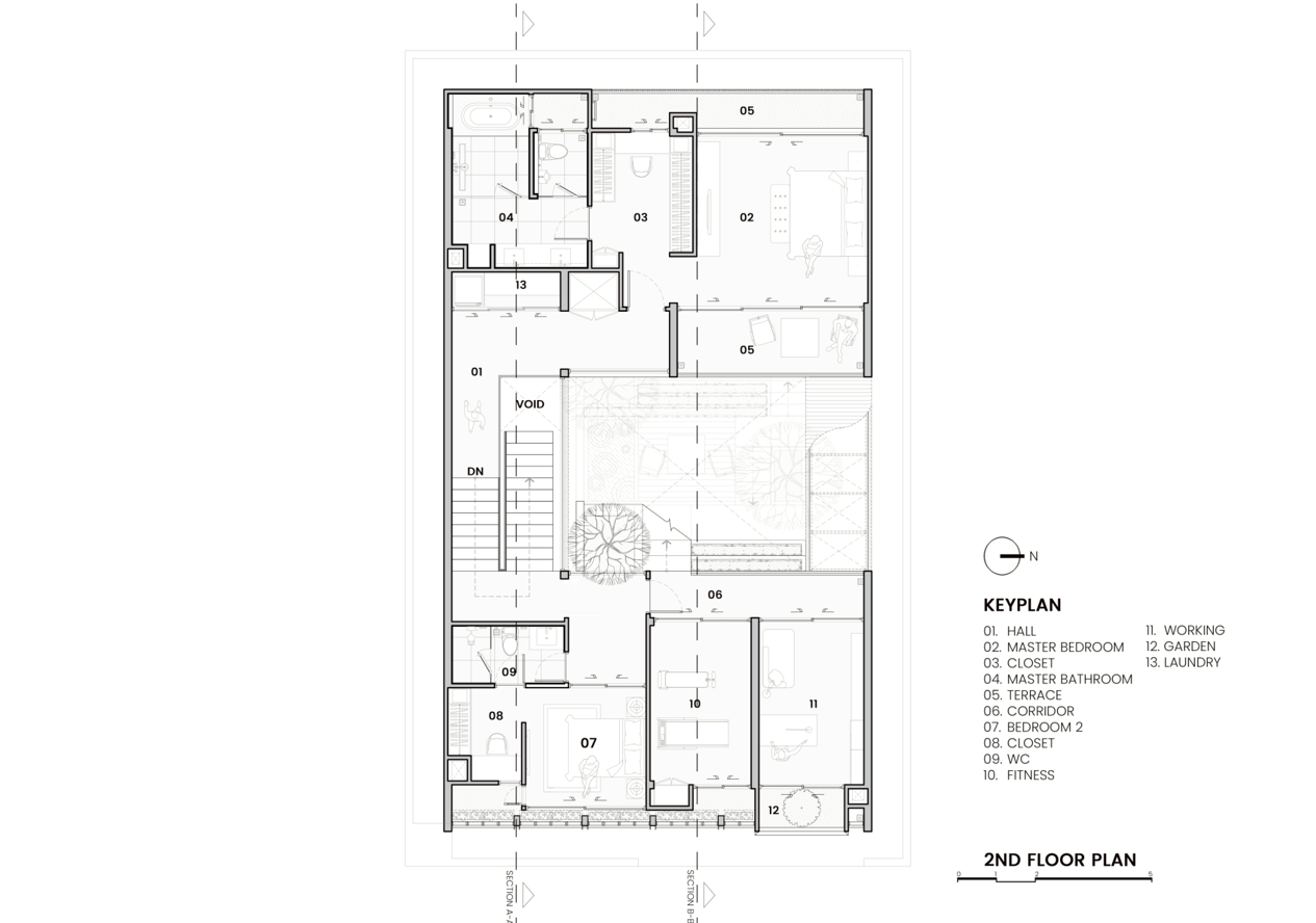 Bản vẽ tầng 2 cho thấy các phòng ngủ, phòng làm việc và phòng tập đều hướng ra khoảng sân trong. Thiết kế này giúp mọi không gian trên tầng đều đón được ánh sáng và gió tự nhiên từ khu vườn phía dưới