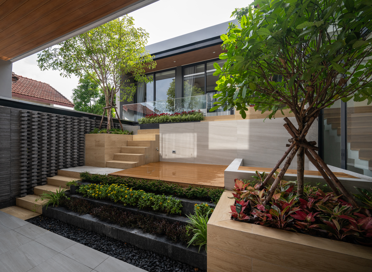 Khoảng sân trong tầng trên với cây xanh, bậc thang và ánh sáng tự nhiên tràn ngập. Không gian mở giúp các phòng đều có tầm nhìn hướng vườn, tạo cảm giác thư giãn như ở resort