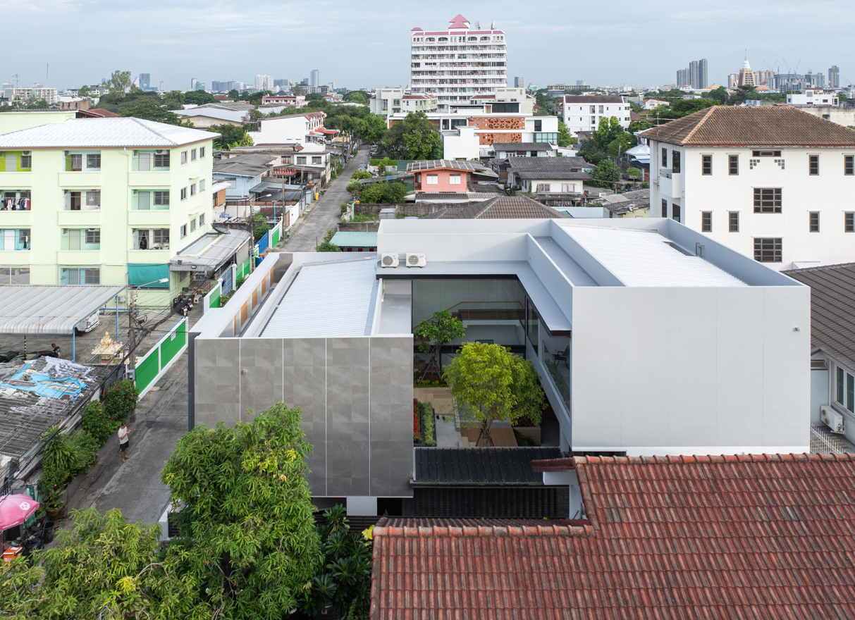 Toàn cảnh The Oasis House nhìn từ trên cao cho thấy khối nhà chữ U khép kín giữa khu dân cư đông đúc của Bangkok. Thiết kế hiện đại kết hợp lam gỗ và mảng xanh tạo nên “ốc đảo riêng tư” nổi bật giữa không gian chật hẹp