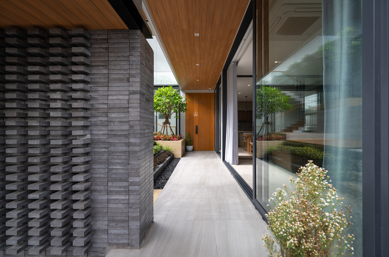 Hành lang lát gạch xám dẫn vào nhà, với tường gạch thông gió tạo điểm nhấn mạnh mẽ. Kết hợp vật liệu gỗ - kính - gạch giúp không gian vừa ấm cúng, vừa hiện đại