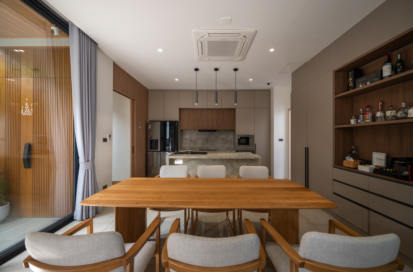 Khu bếp - ăn được thiết kế đơn giản, tinh tế với gam màu trung tính và nội thất gỗ sáng. Không gian mở ra sân trong, giúp khu vực sinh hoạt luôn sáng và thoáng khí