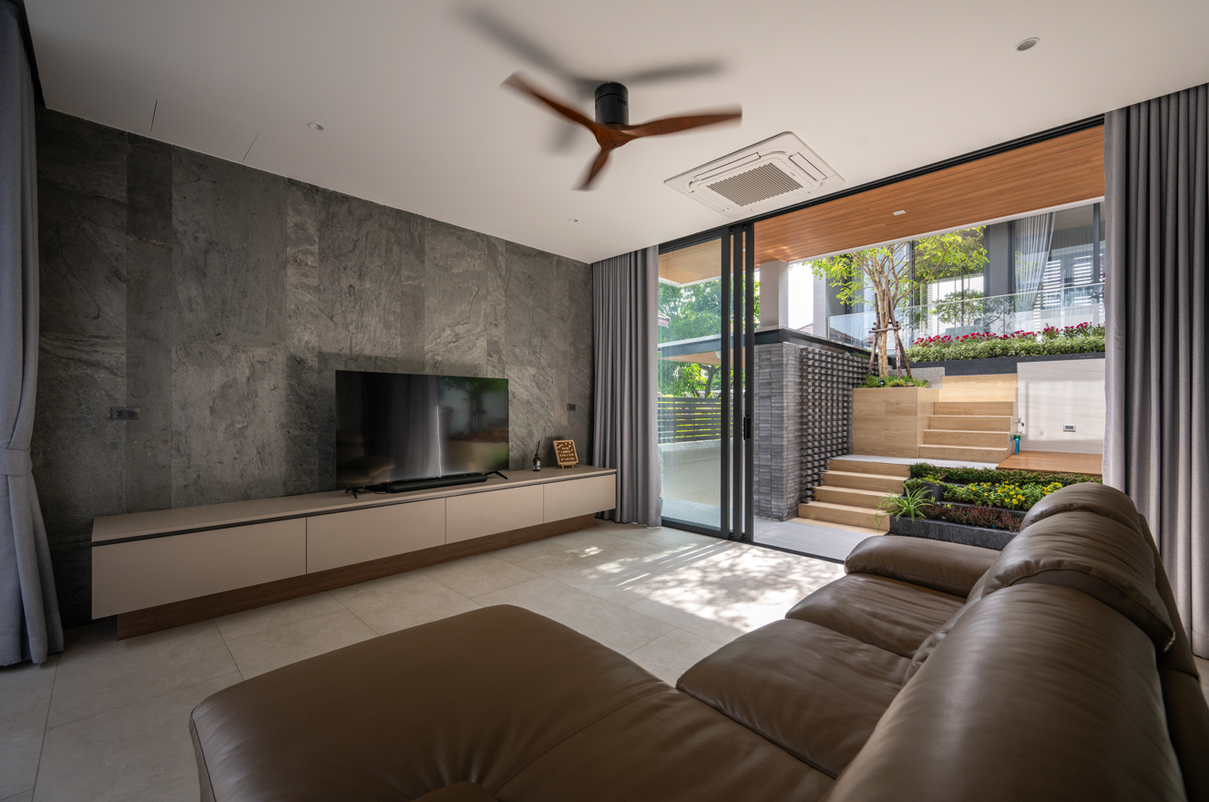 Phòng khách mở rộng liền kề sân trong, nơi ánh sáng tự nhiên phản chiếu khắp không gian. Cửa trượt kính toàn khổ giúp kết nối nội - ngoại thất một cách liền mạch