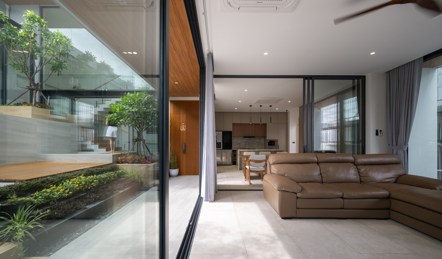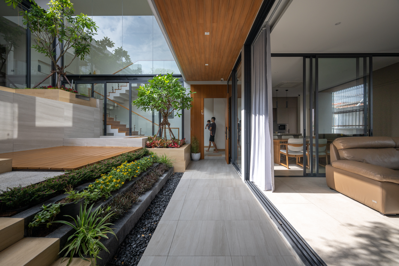 Lối đi dọc sân trong mở ra khung cảnh tươi mát, nơi ánh sáng tự nhiên lan tỏa khắp không gian sinh hoạt. Các khung cửa kính trượt giúp xóa nhòa ranh giới giữa phòng khách, bếp và khu vườn trung tâm