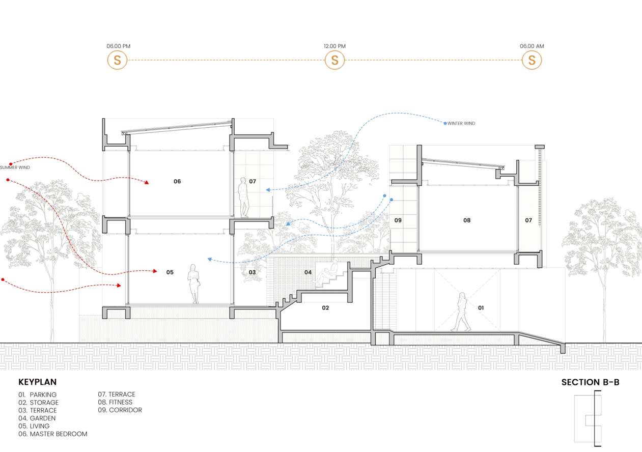 Bản vẽ mặt cắt thể hiện rõ giải pháp thông gió chéo và lấy sáng tự nhiên qua sân trong trung tâm. Hướng gió và ánh sáng được tính toán kỹ để ngôi nhà luôn mát mẻ, tiết kiệm năng lượng quanh năm