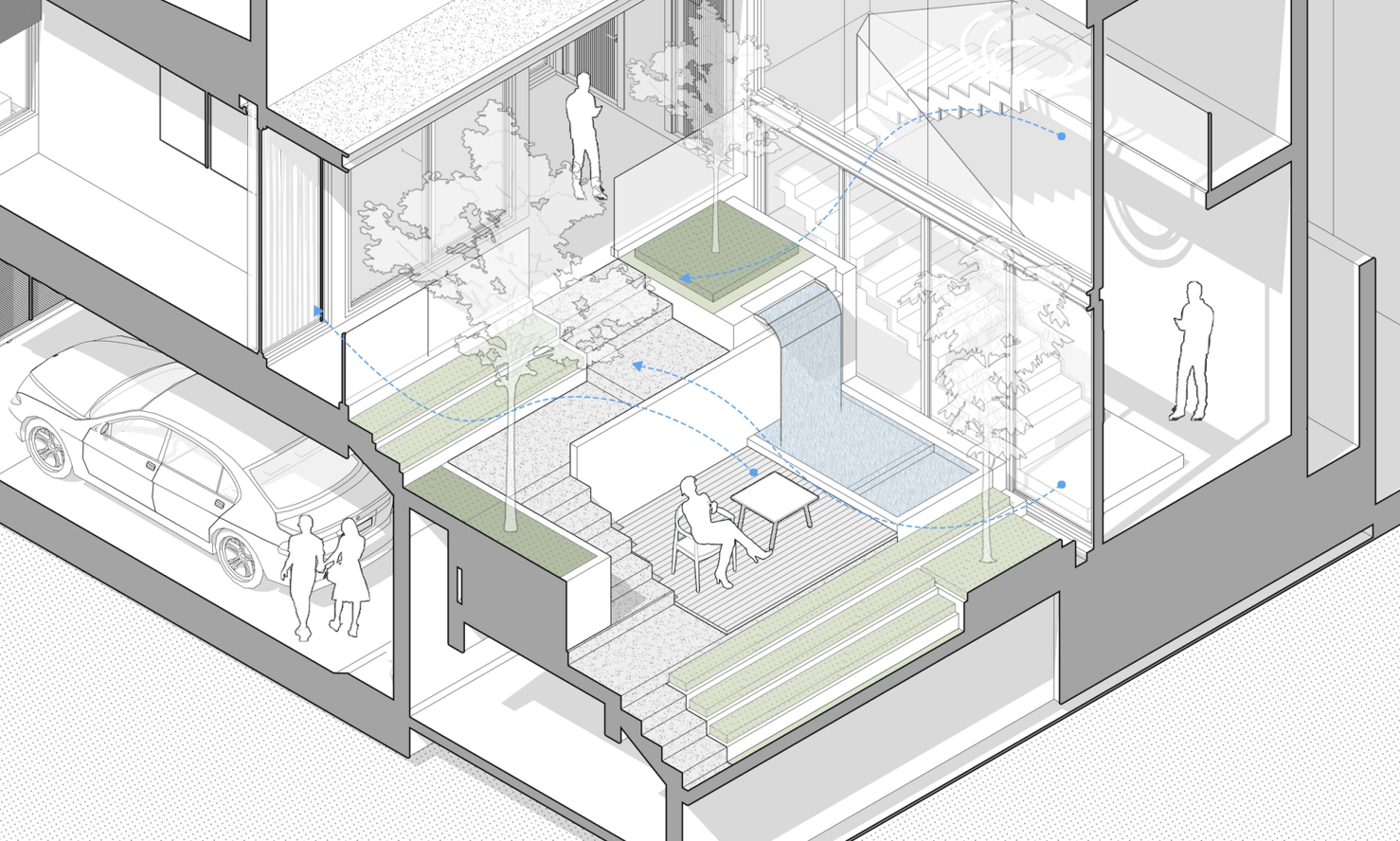 Bản vẽ minh họa hệ thống thông gió tự nhiên trong sân trong. Luồng không khí được dẫn qua cao độ lệch tầng và mặt nước, giúp nhà luôn mát mẻ