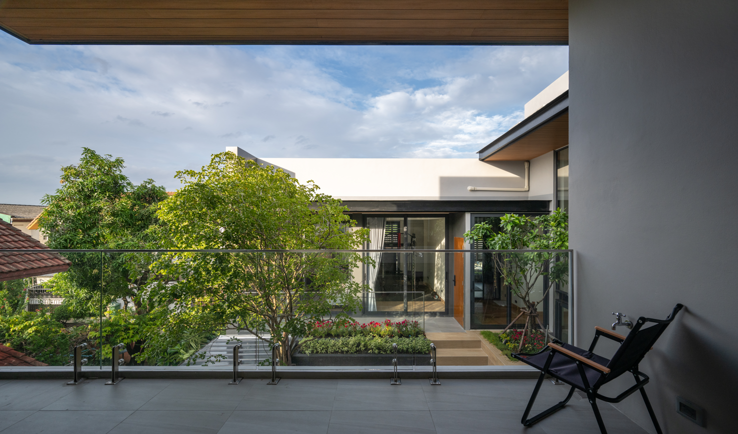 Ban công tầng 2 hướng về khoảng sân trong xanh mát, nơi cây và hoa nở quanh năm. Không gian nghỉ ngơi lý tưởng, vừa riêng tư vừa kết nối với thiên nhiên