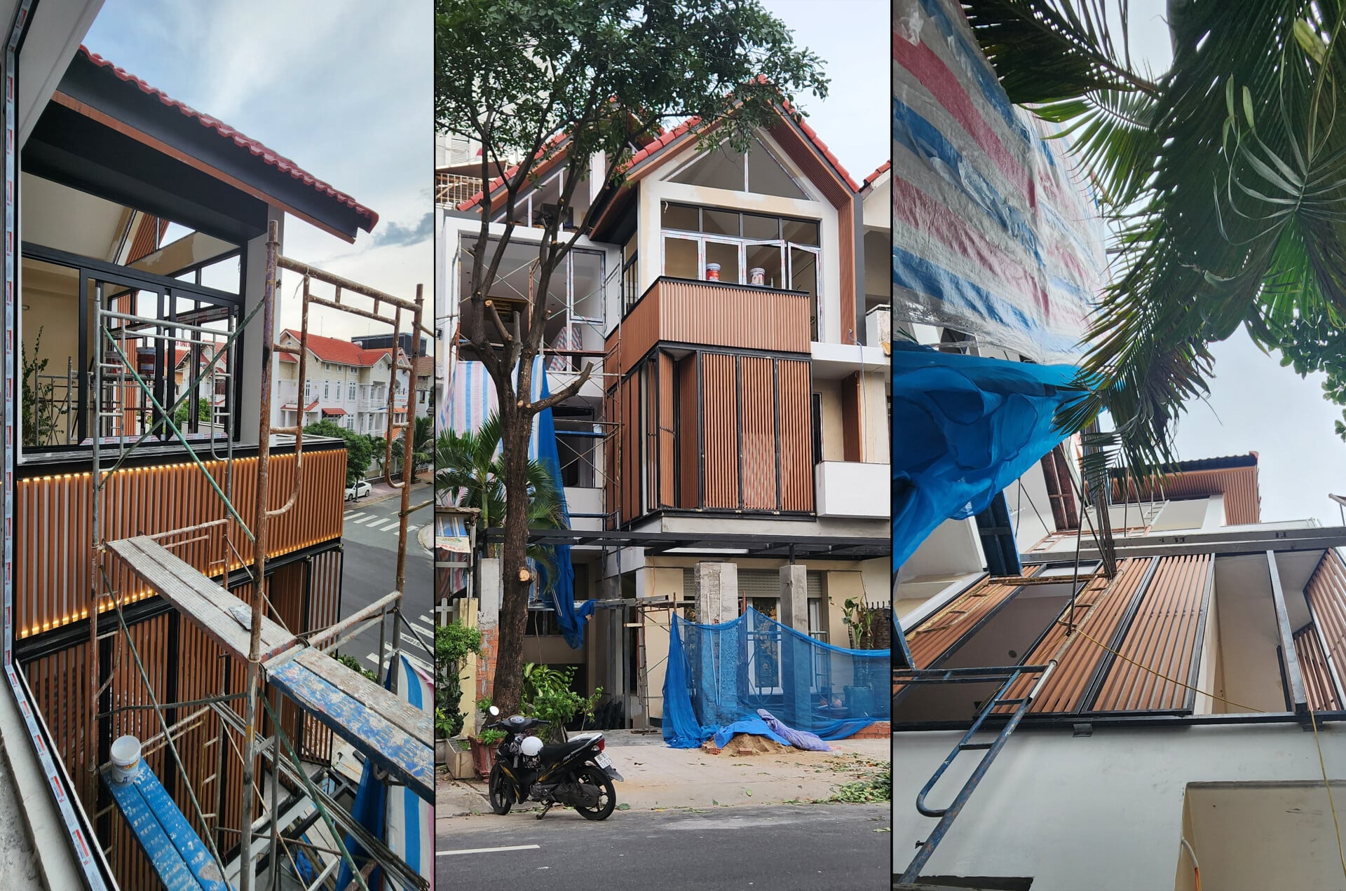 Lắp đặt hệ khung thép và lam đứng theo module thiết kế, từng bước hình thành lớp che nắng và chiều sâu cho mặt tiền.Hệ lam đóng vai trò lọc sáng, tạo nhịp điệu bóng đổ và tăng tính riêng tư cho công trình.