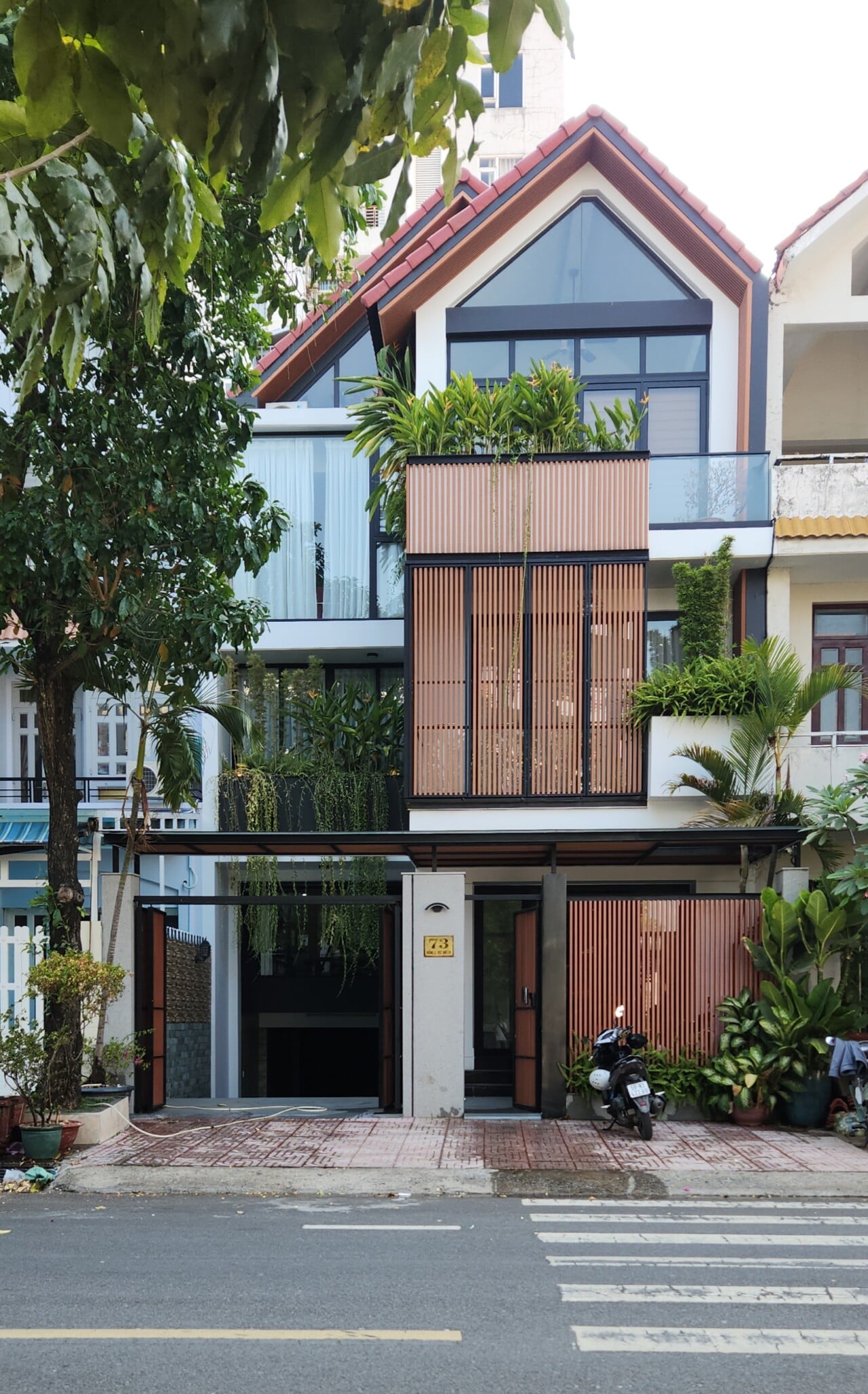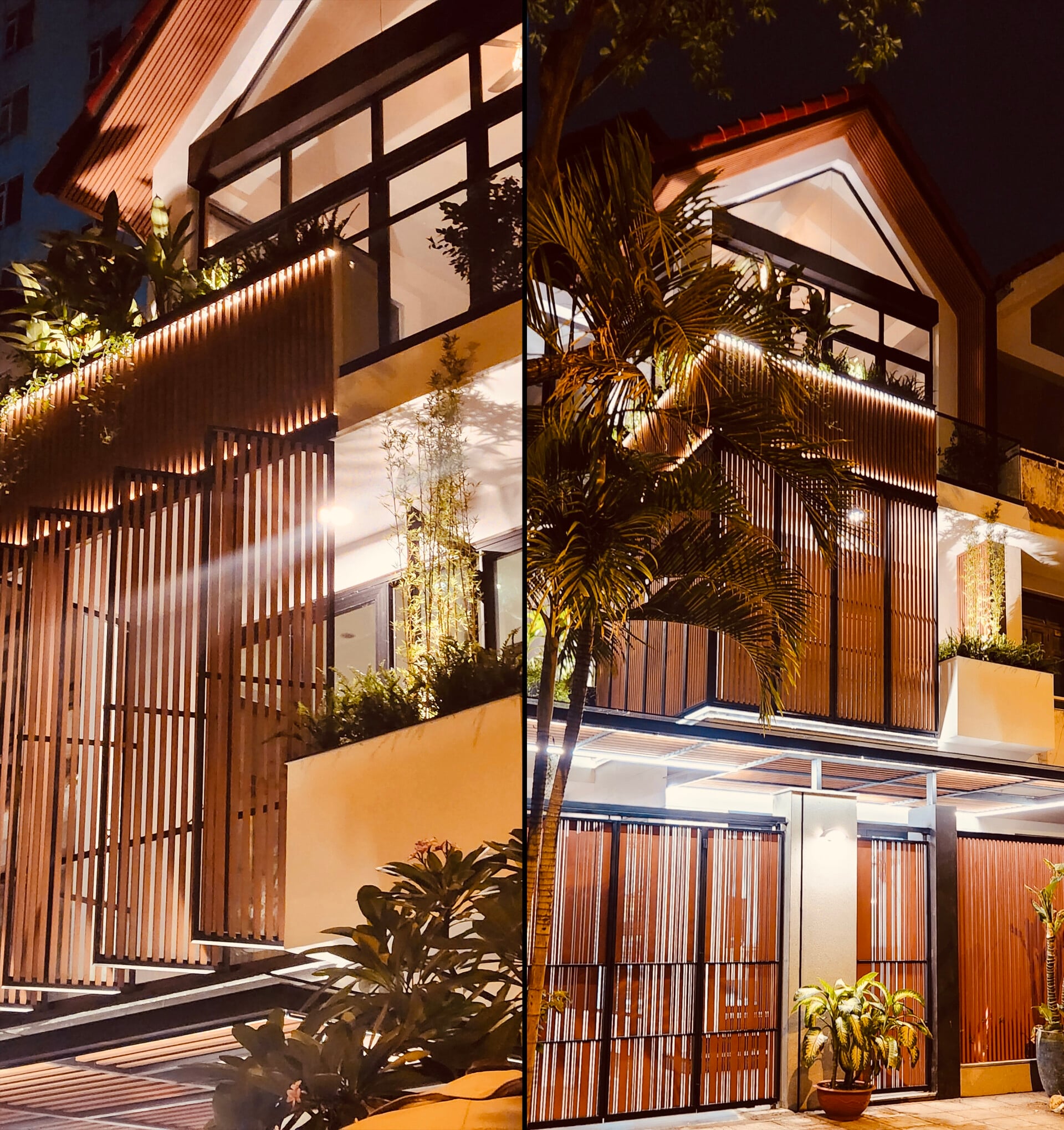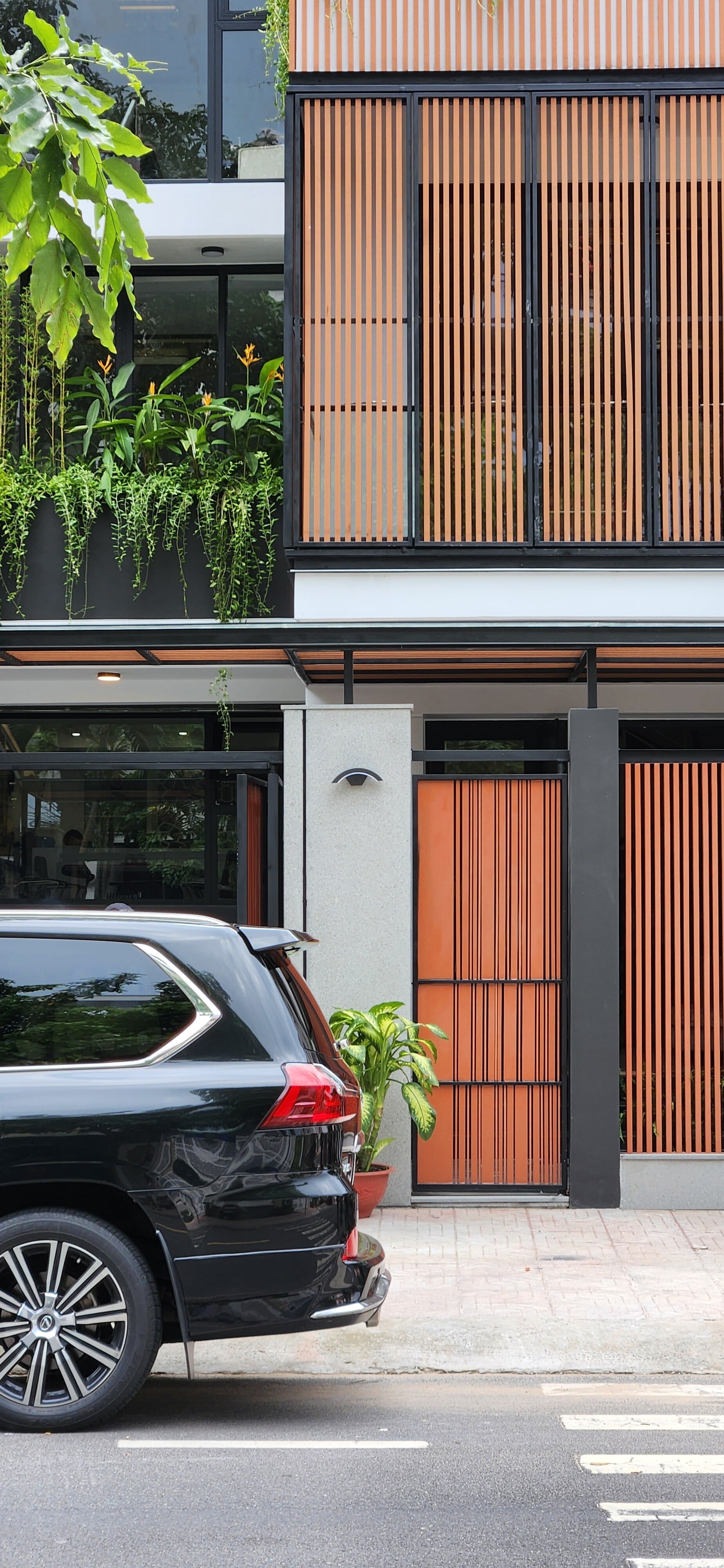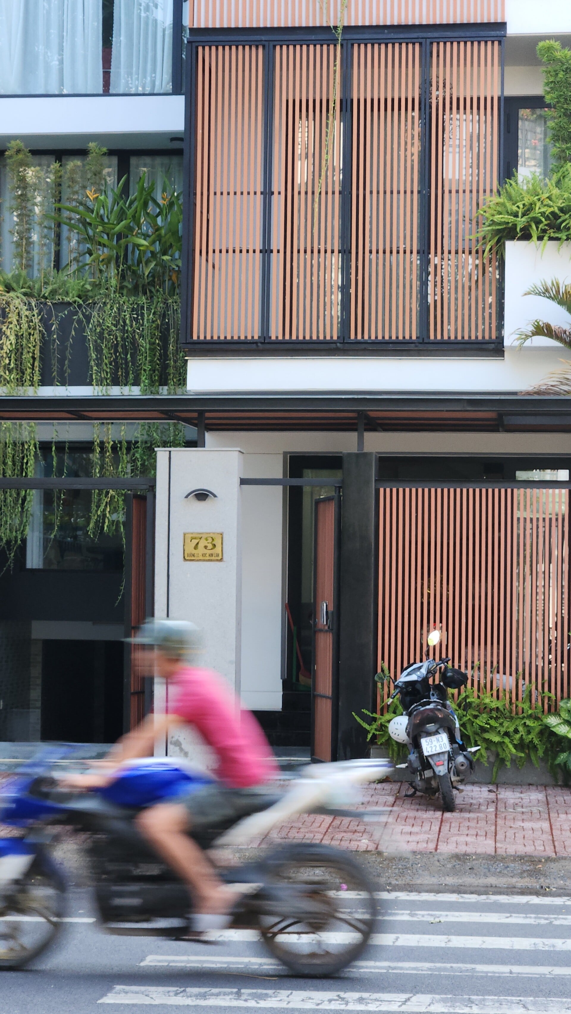 Ngôn ngữ Modern Tropical được thể hiện rõ qua hệ lam đứng chạy xuyên suốt các tầng, kết hợp mảng xanh bố trí tại ban công và logia. Các lớp lam vừa đóng vai trò che nắng, giảm bức xạ trực tiếp, vừa tạo chiều sâu thị giác cho mặt tiền vốn có hình khối đơn giản của nhà liên kế. Hệ khung thép sơn tối màu làm nền, kết hợp vật liệu lam tông gỗ ấm và mảng tường sáng, giúp công trình giữ được sự cân bằng giữa hiện đại và cảm giác nhiệt đới.