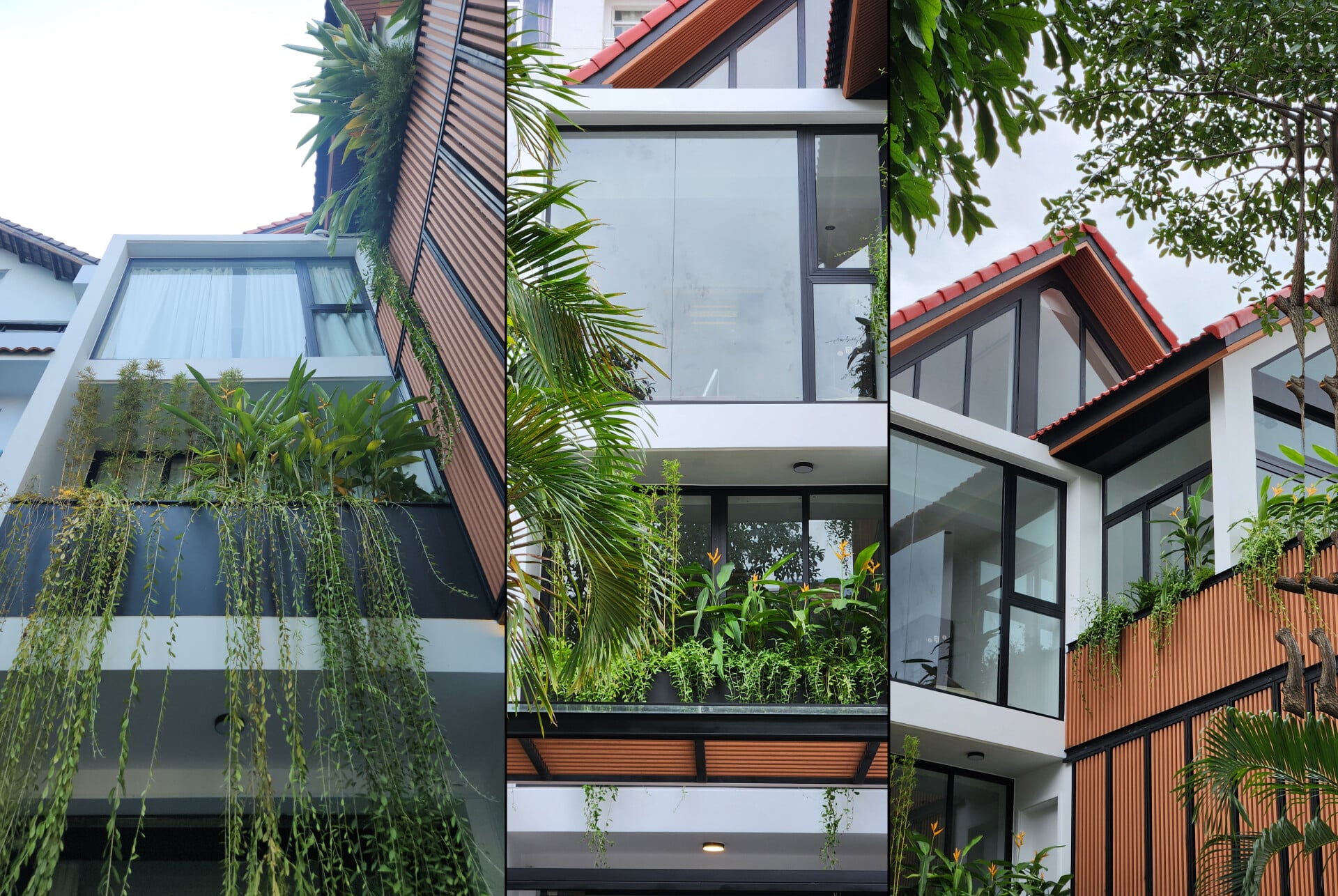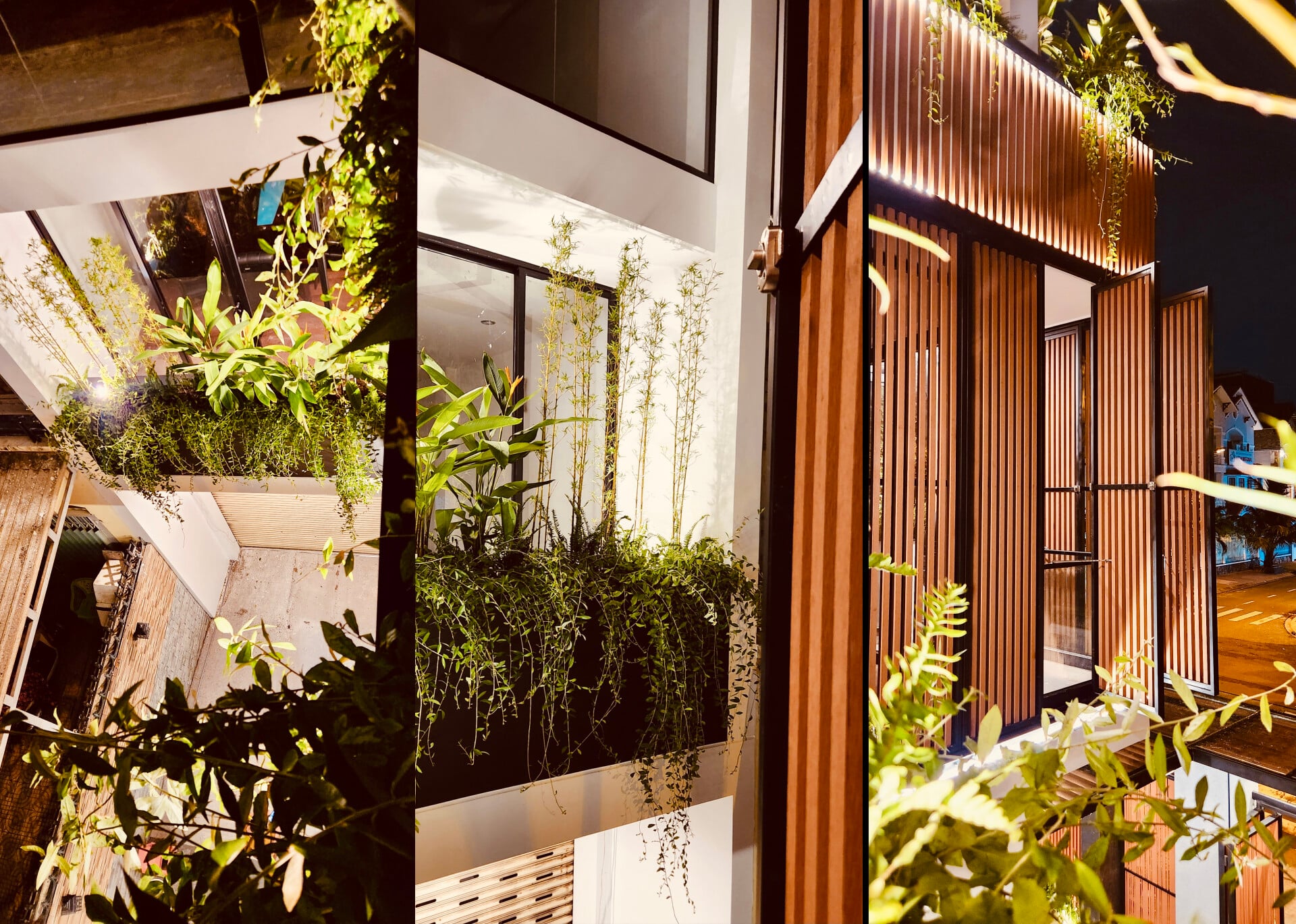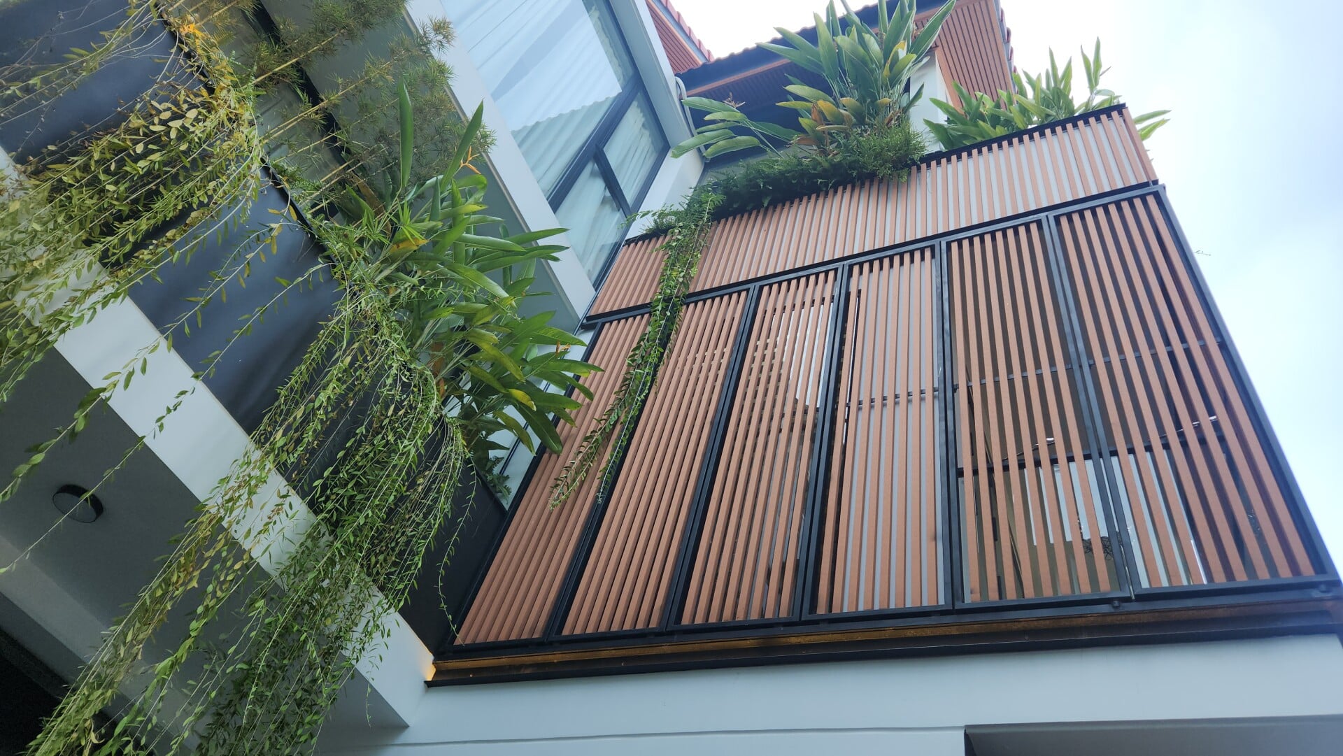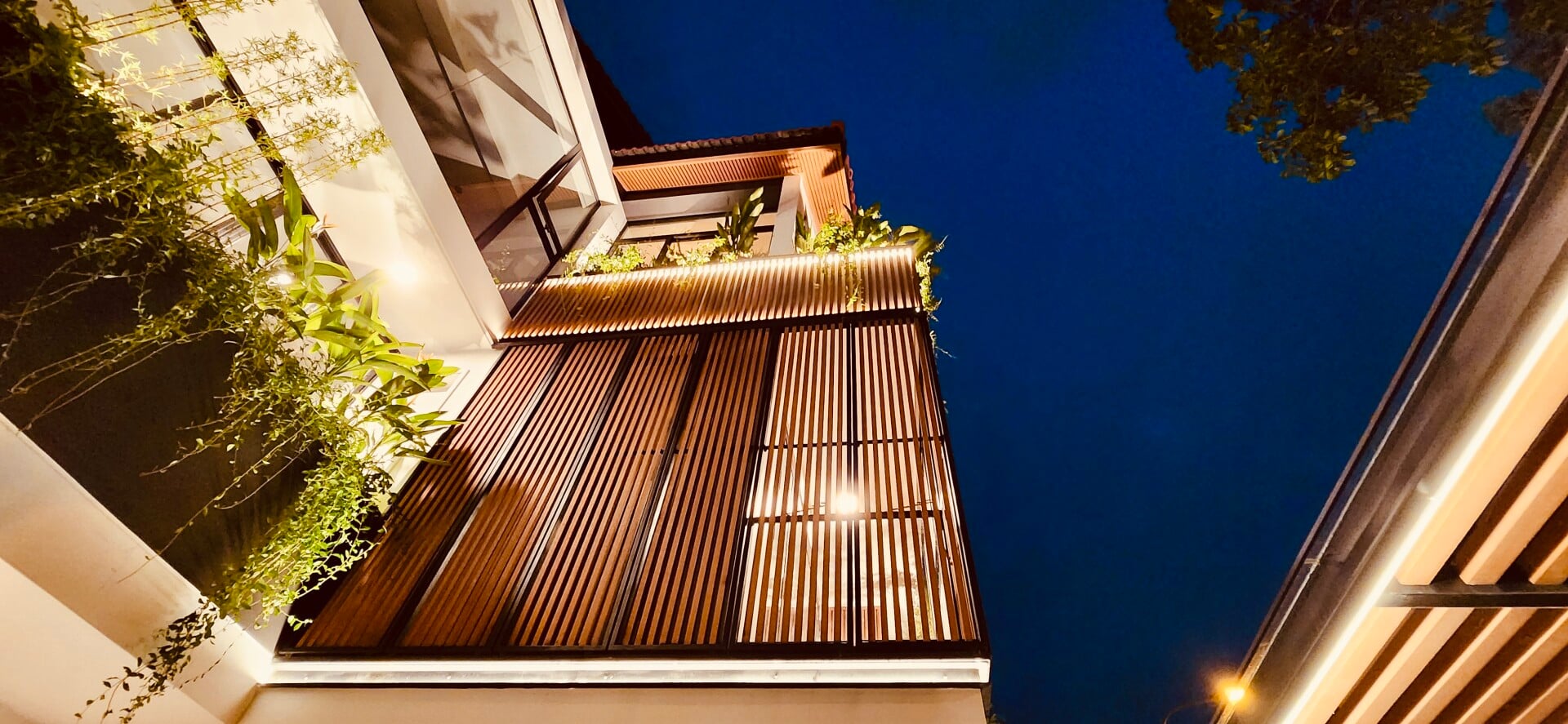 Ngôn ngữ Modern Tropical được thể hiện rõ qua hệ lam đứng chạy xuyên suốt các tầng, kết hợp mảng xanh bố trí tại ban công và logia. Các lớp lam vừa đóng vai trò che nắng, giảm bức xạ trực tiếp, vừa tạo chiều sâu thị giác cho mặt tiền vốn có hình khối đơn giản của nhà liên kế. Hệ khung thép sơn tối màu làm nền, kết hợp vật liệu lam tông gỗ ấm và mảng tường sáng, giúp công trình giữ được sự cân bằng giữa hiện đại và cảm giác nhiệt đới.