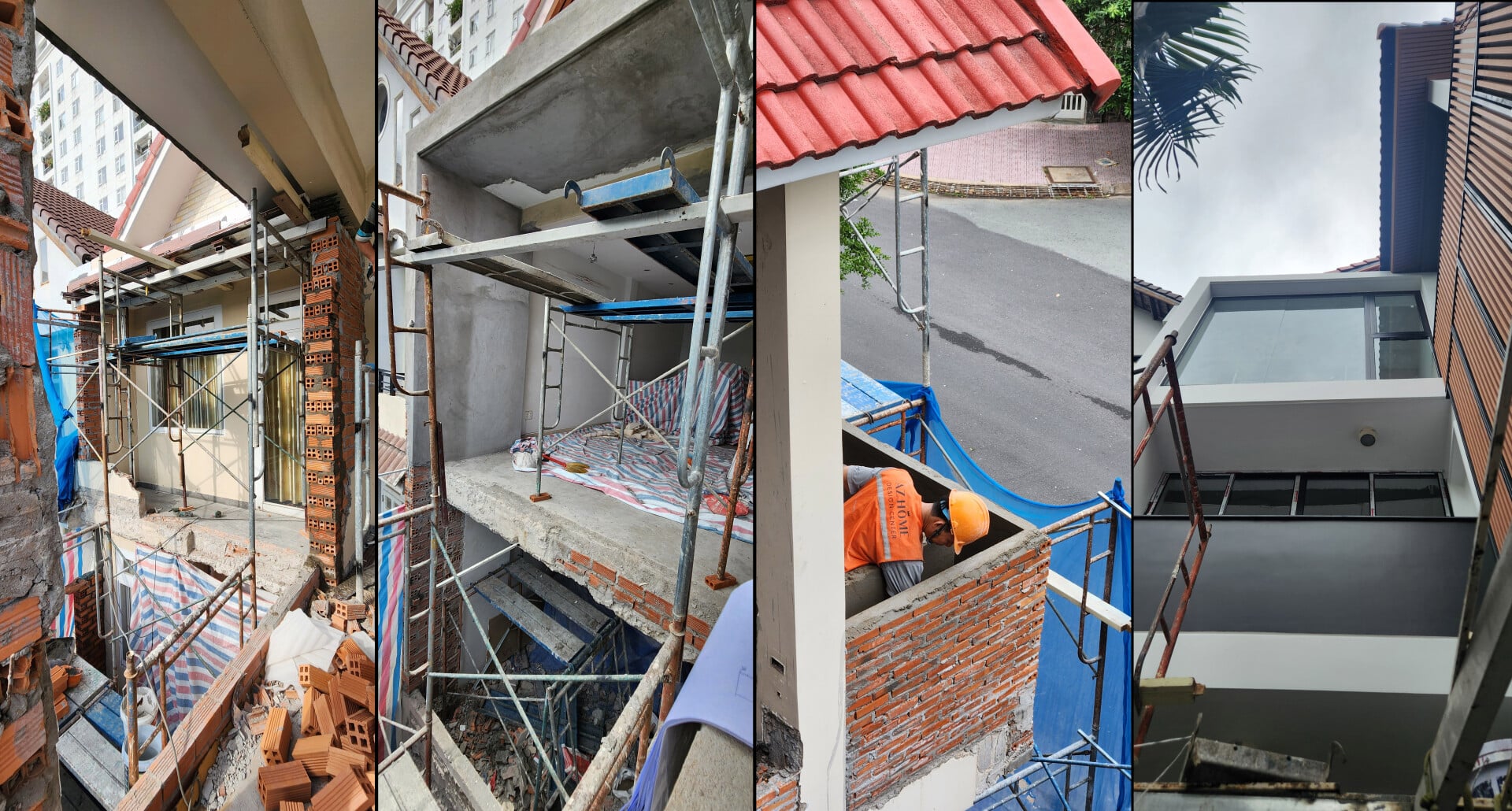 Giai đoạn tháo dỡ và tái cấu trúc ban công, chuẩn bị nền kết cấu cho các lớp bao che và hệ lam mới của mặt tiền.