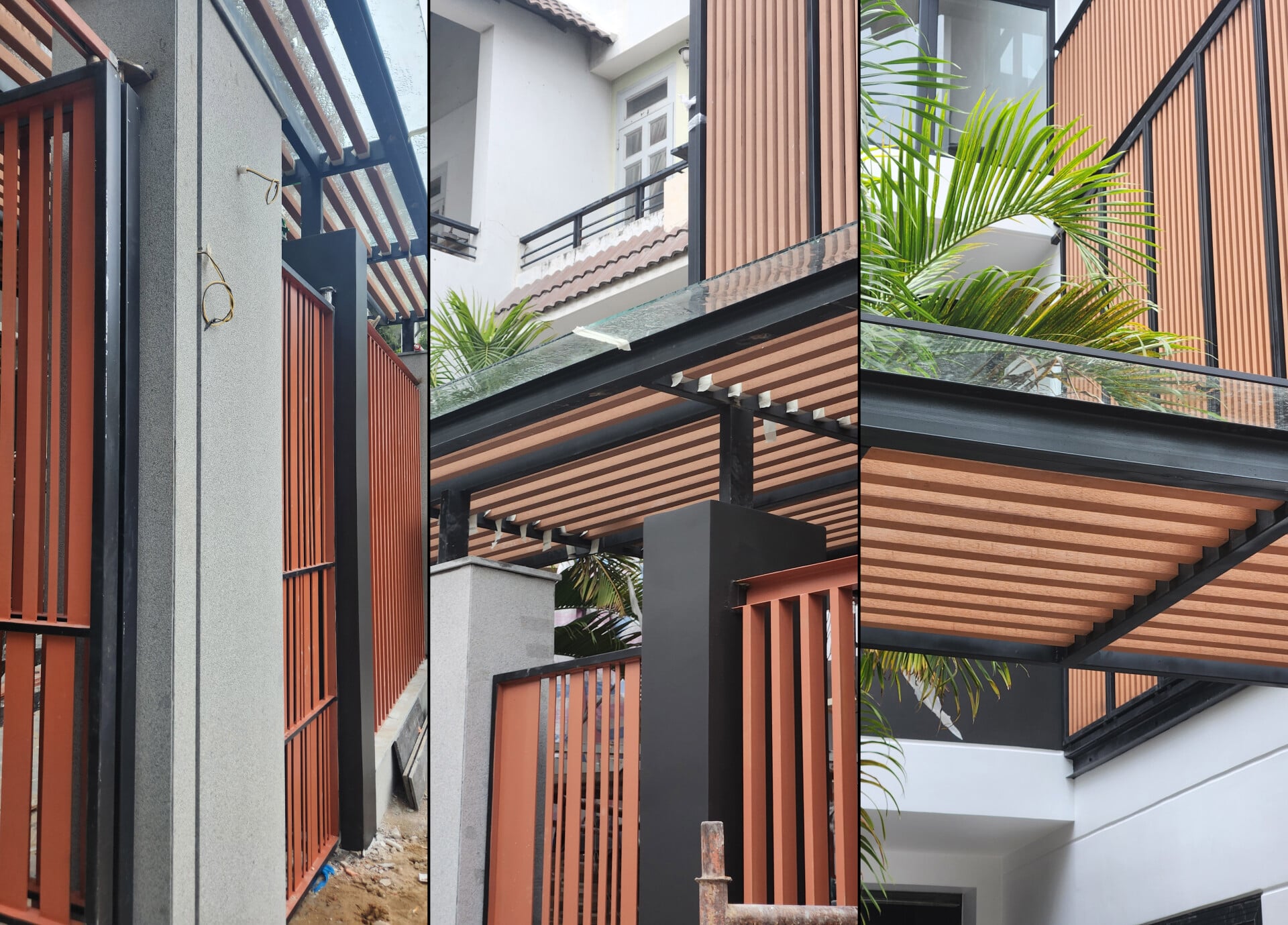 Hoàn thiện hệ khung thép và lam đứng cho hàng rào, đảm bảo tính riêng tư nhưng vẫn thông thoáng theo tinh thần Modern Tropical.