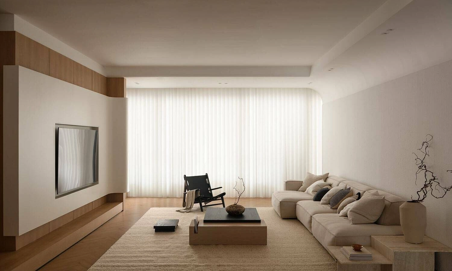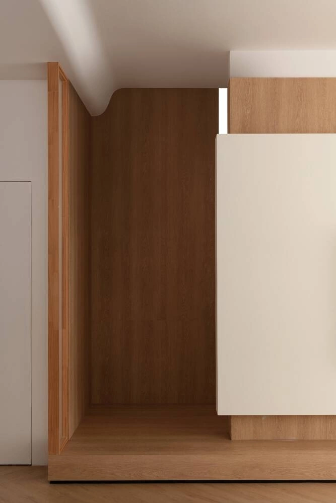 Để tạo nên độ dịu nhẹ cho thị giác, nhóm thiết kế ưu tiên sử dụng gỗ sáng màu kết hợp cùng các bề mặt nhám thô và chất liệu vải mềm mại. Sự tương tác này khiến ánh sáng không bị chói gắt mà được tán xạ đều, tạo ra một bầu không khí ấm áp, bao bọc lấy người ở trong sự dễ chịu và thư thái tuyệt đối.