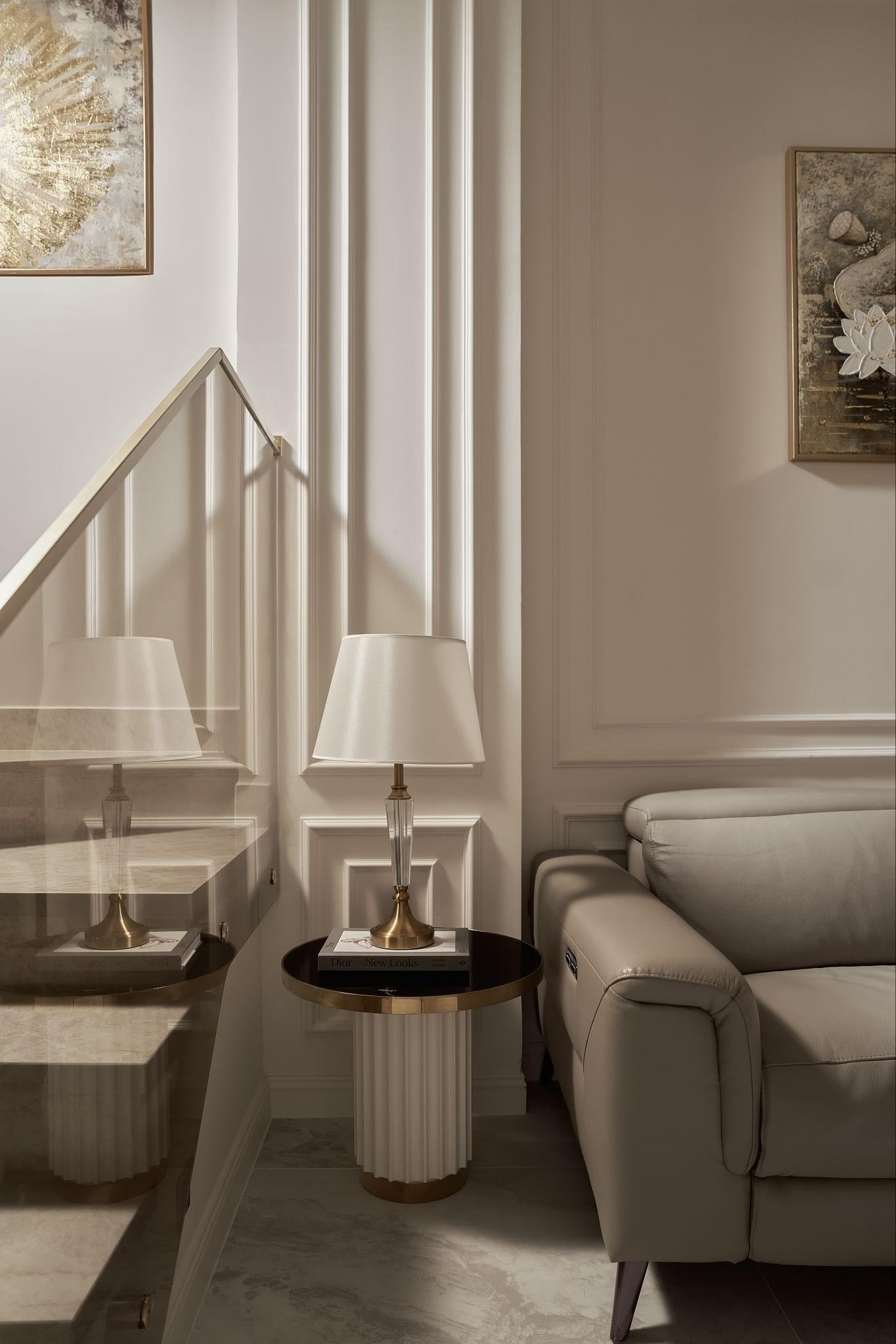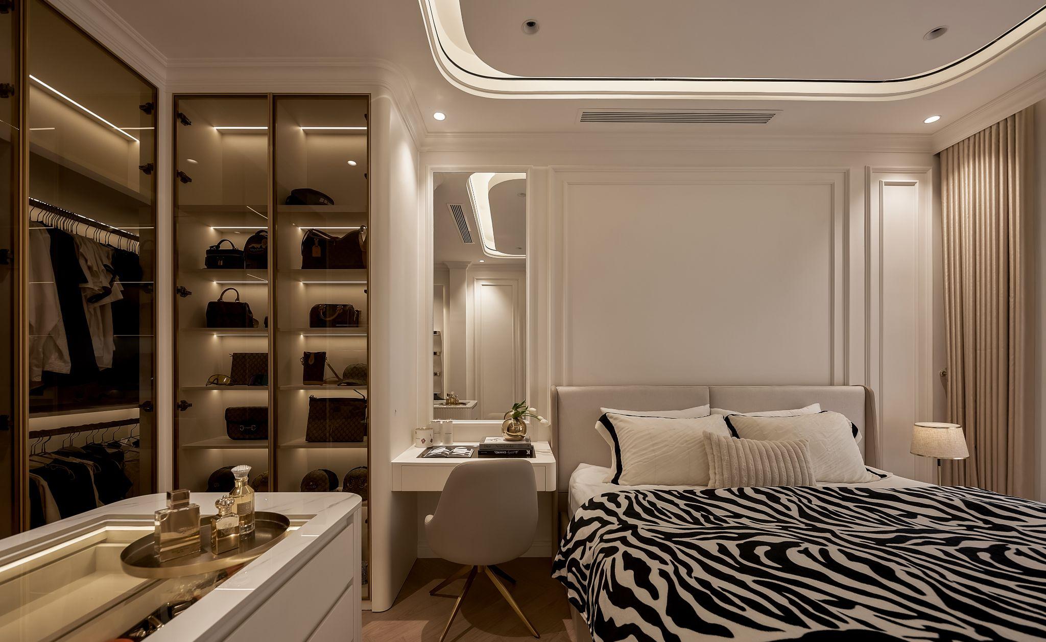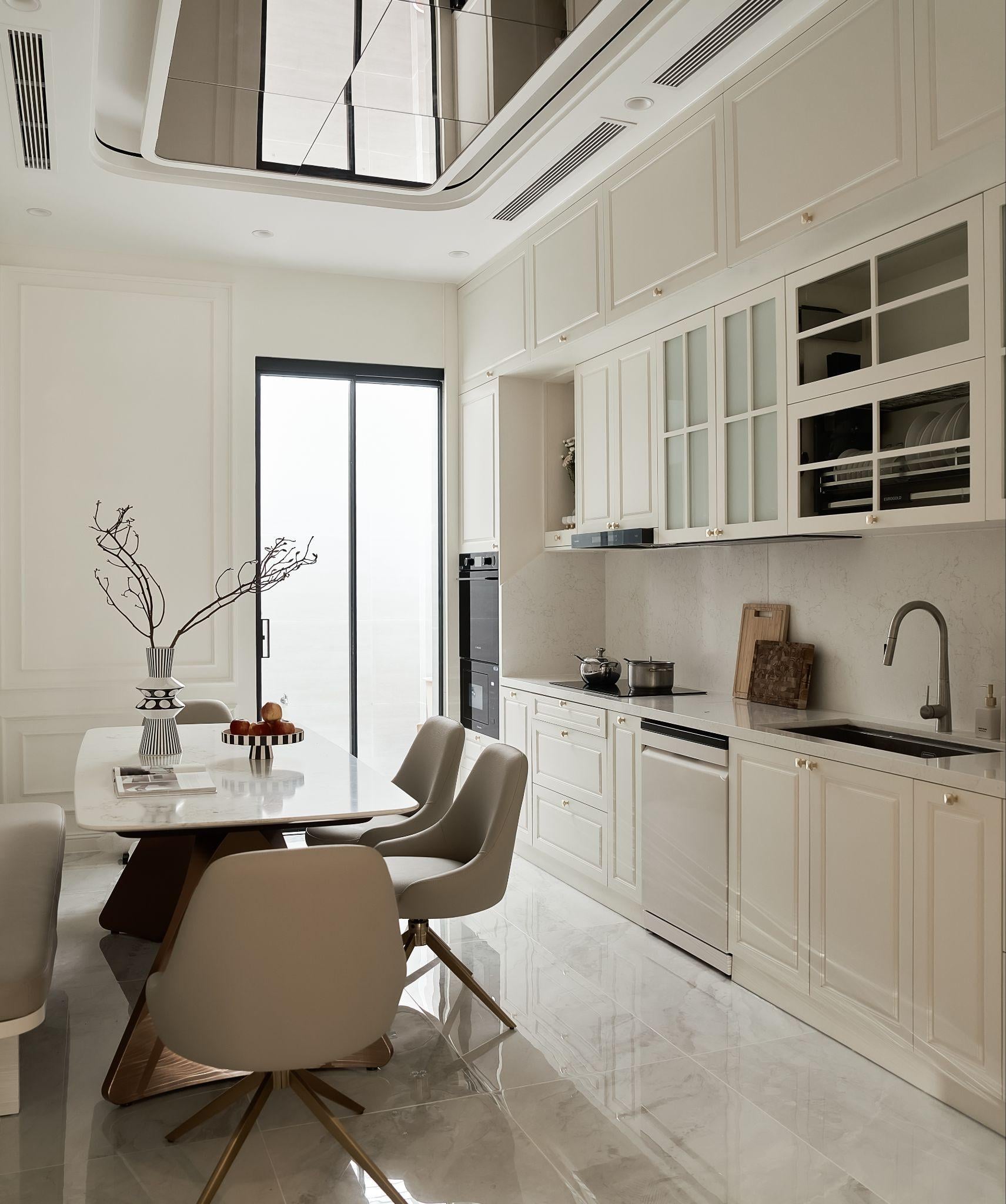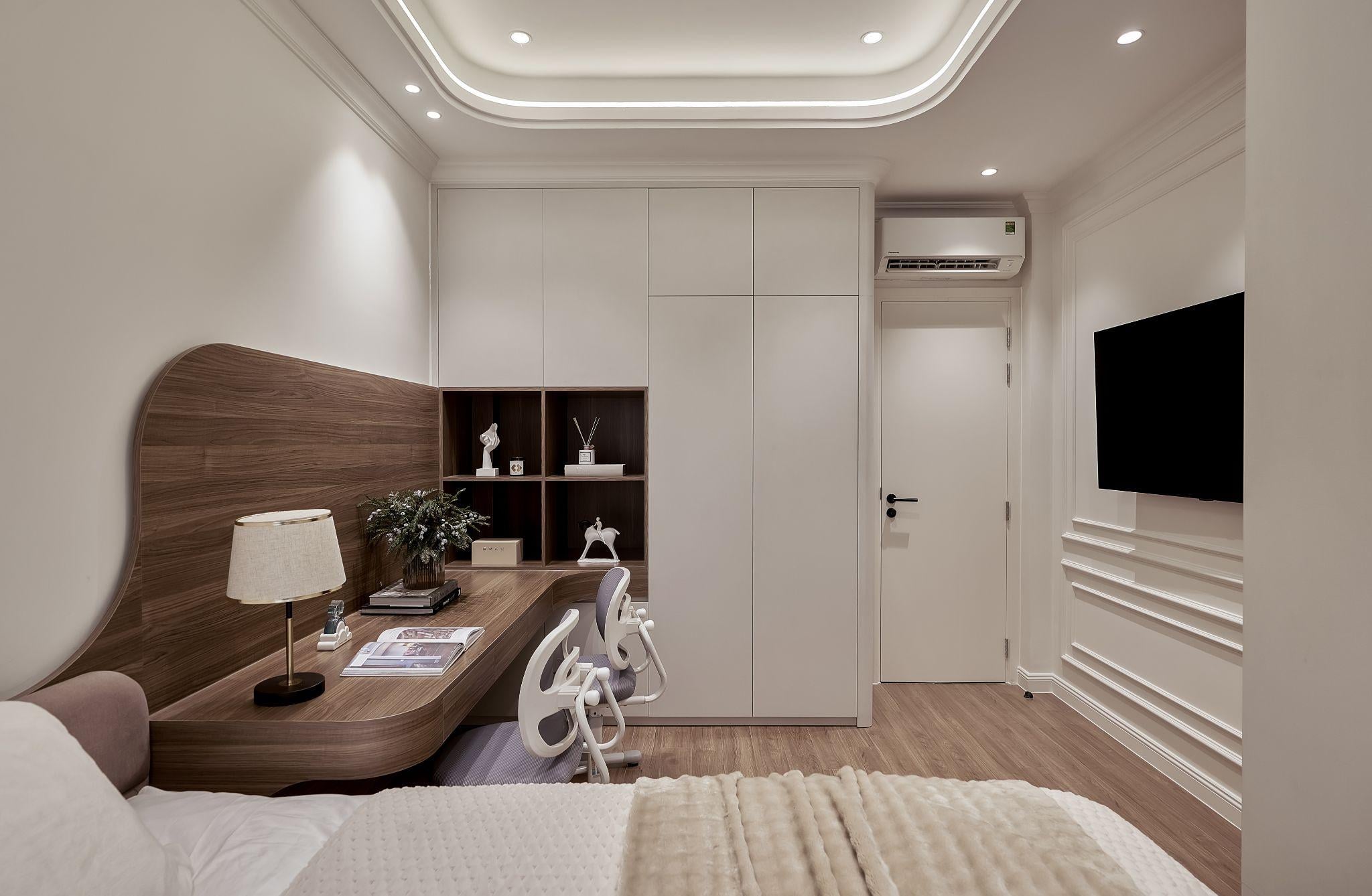 Về ánh sáng: Hệ thống chiếu sáng được thiết kế phân tầng, theo từng không gian. Ánh sáng vàng ấm tạo không khí ấm cúng cho phòng khách, trong khi ánh sáng trắng mát mẻ được sử dụng cho bếp và phòng tắm. Đèn spotlight làm nổi bật các chi tiết tân cổ điển, biến chúng thành những "tác phẩm nghệ thuật" trong không gian.
