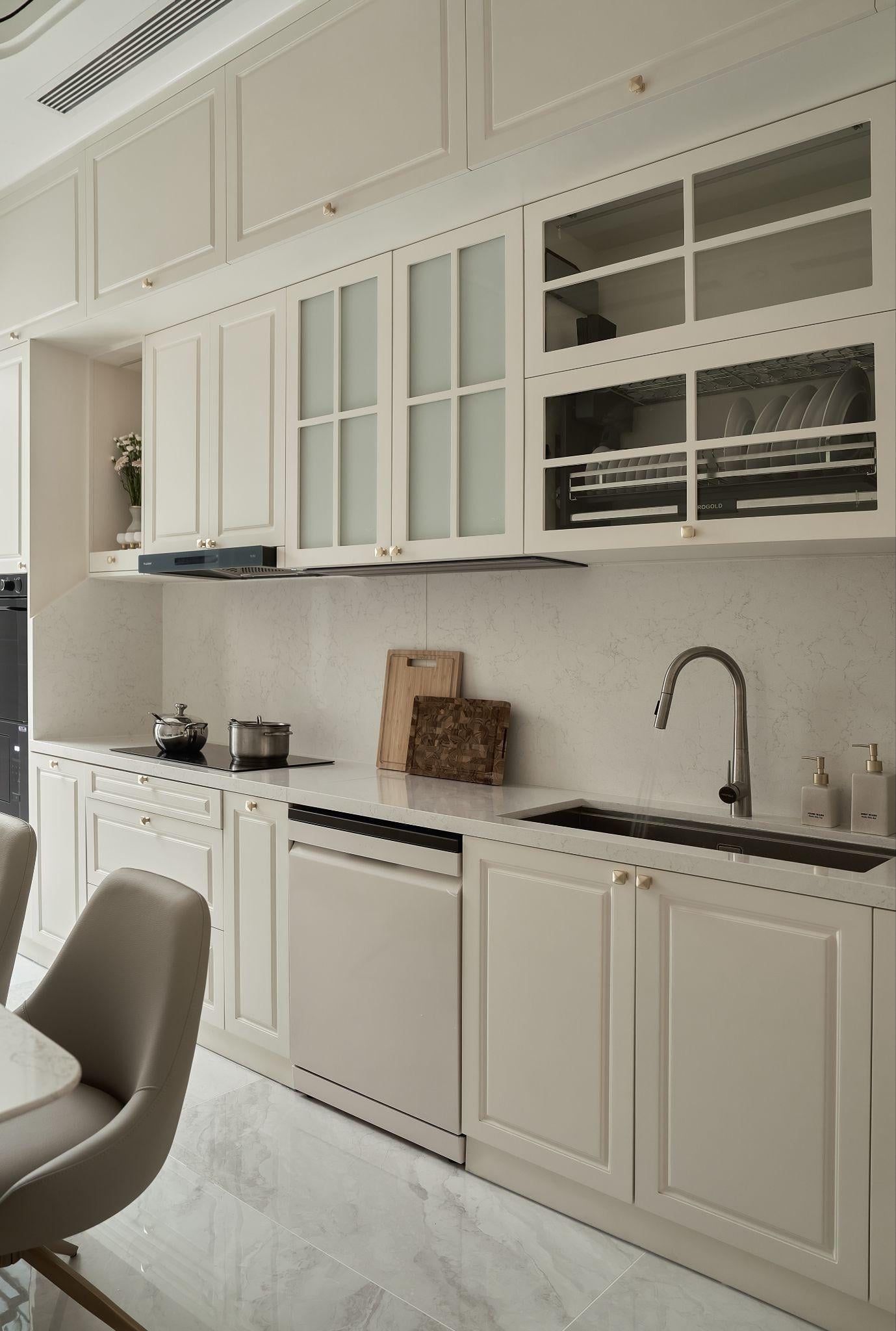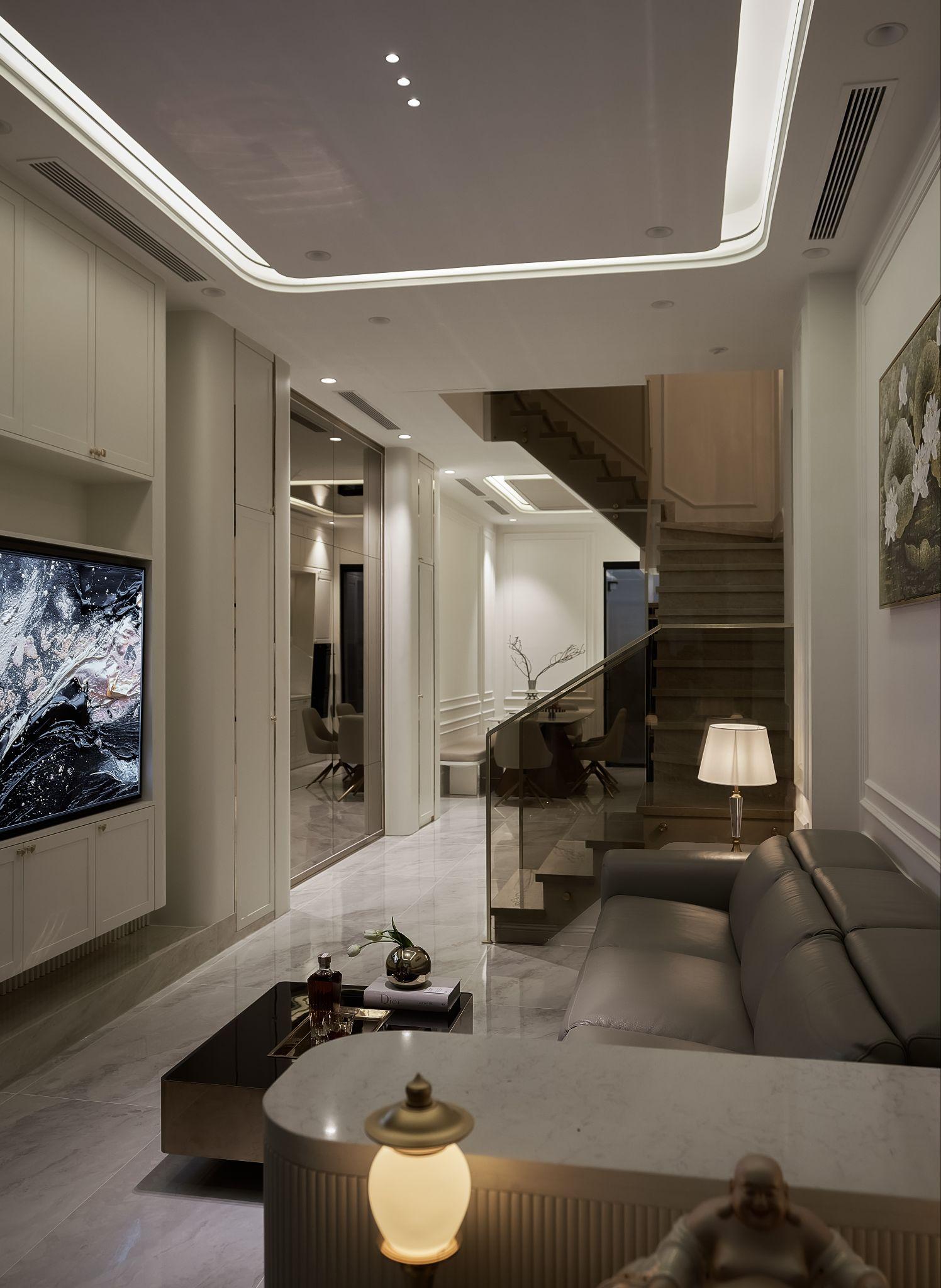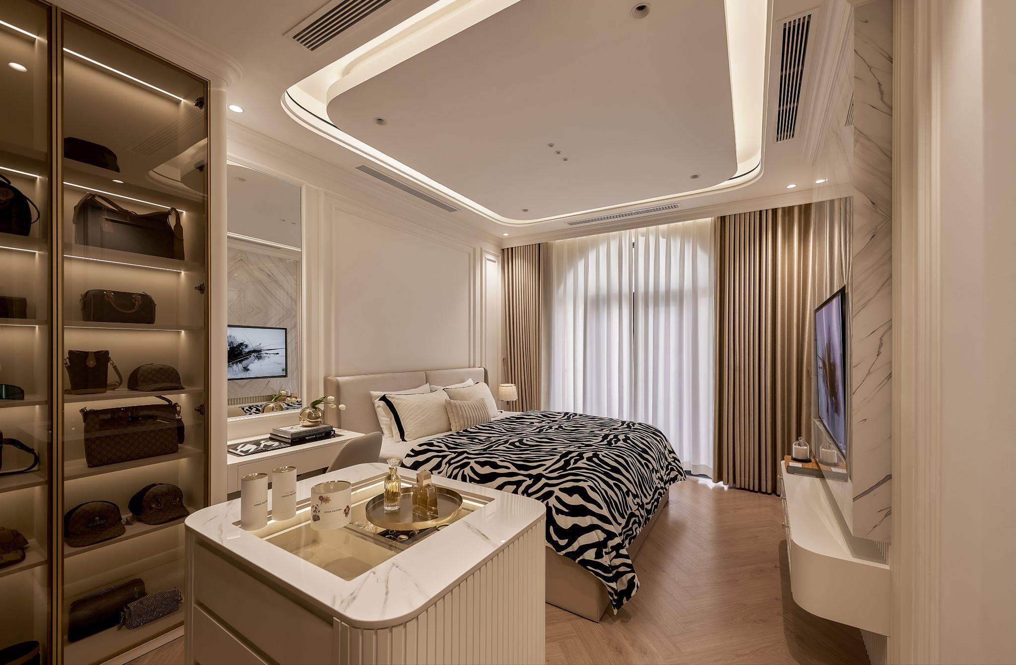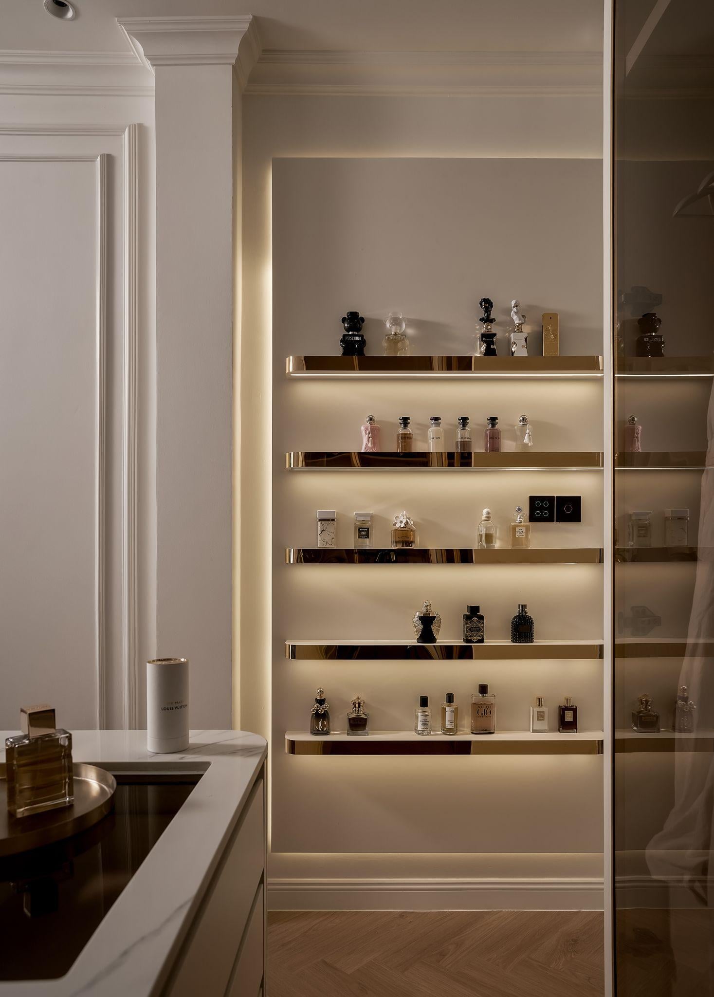 Về ánh sáng: Hệ thống chiếu sáng được thiết kế phân tầng, theo từng không gian. Ánh sáng vàng ấm tạo không khí ấm cúng cho phòng khách, trong khi ánh sáng trắng mát mẻ được sử dụng cho bếp và phòng tắm. Đèn spotlight làm nổi bật các chi tiết tân cổ điển, biến chúng thành những "tác phẩm nghệ thuật" trong không gian.