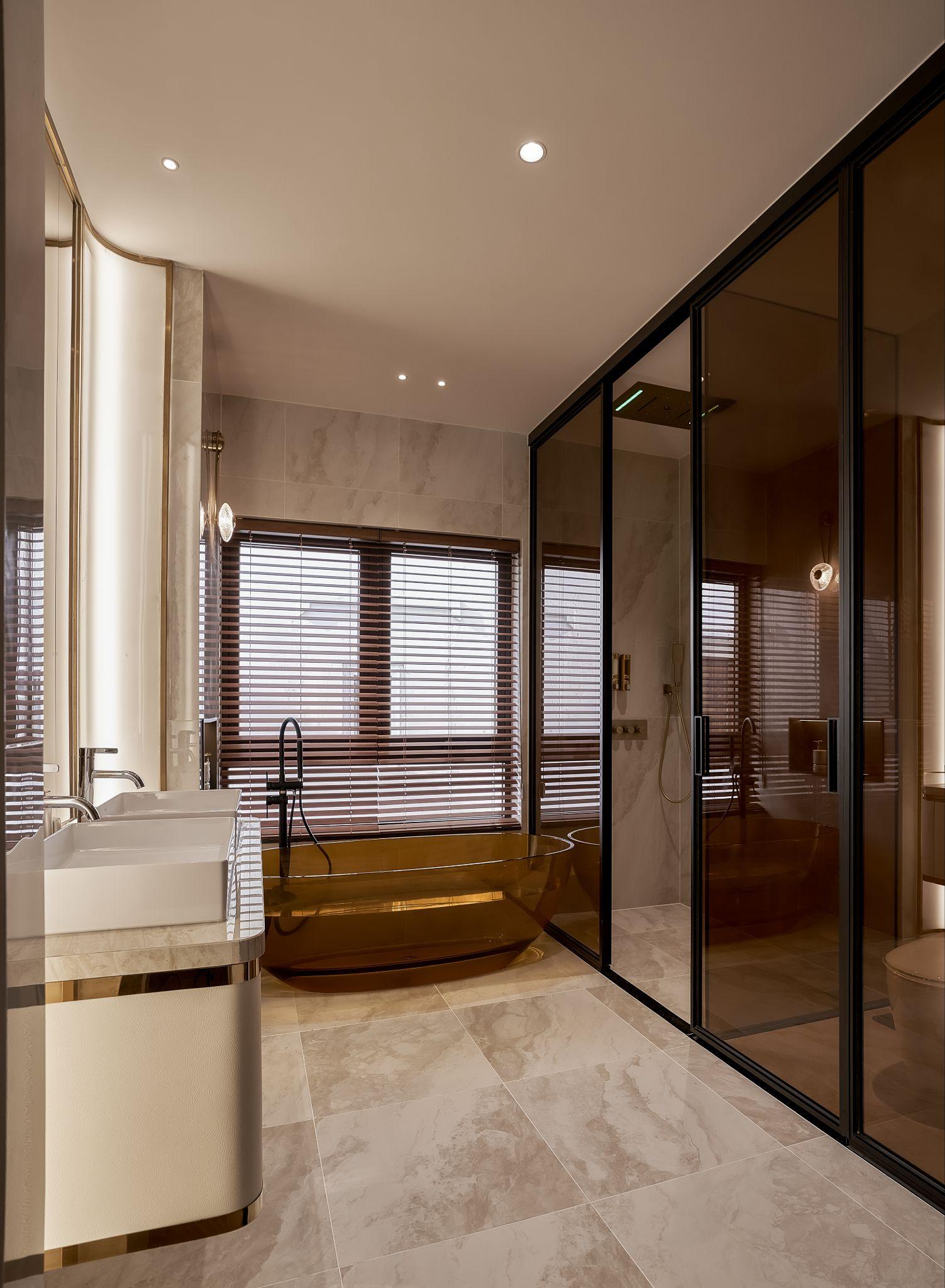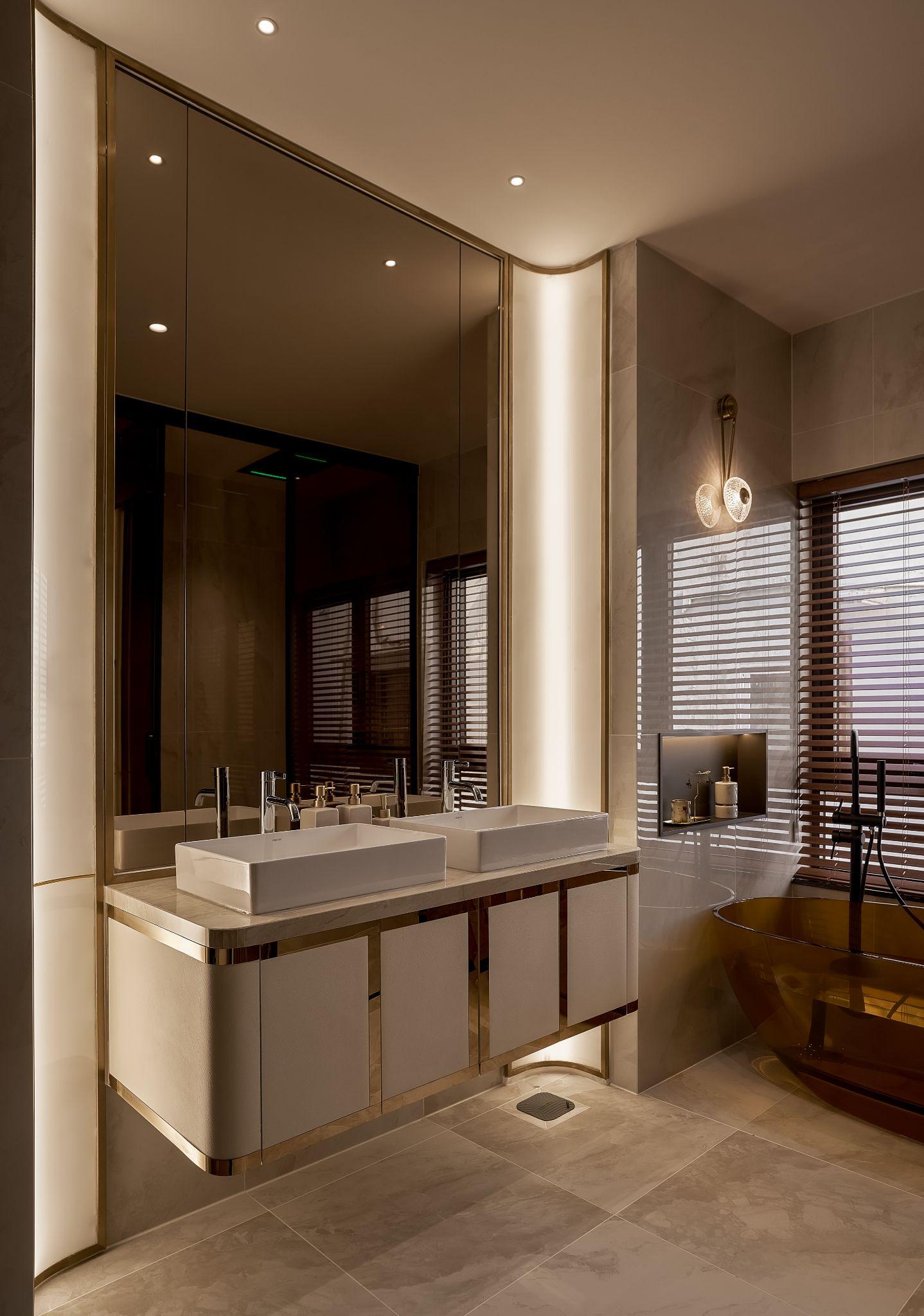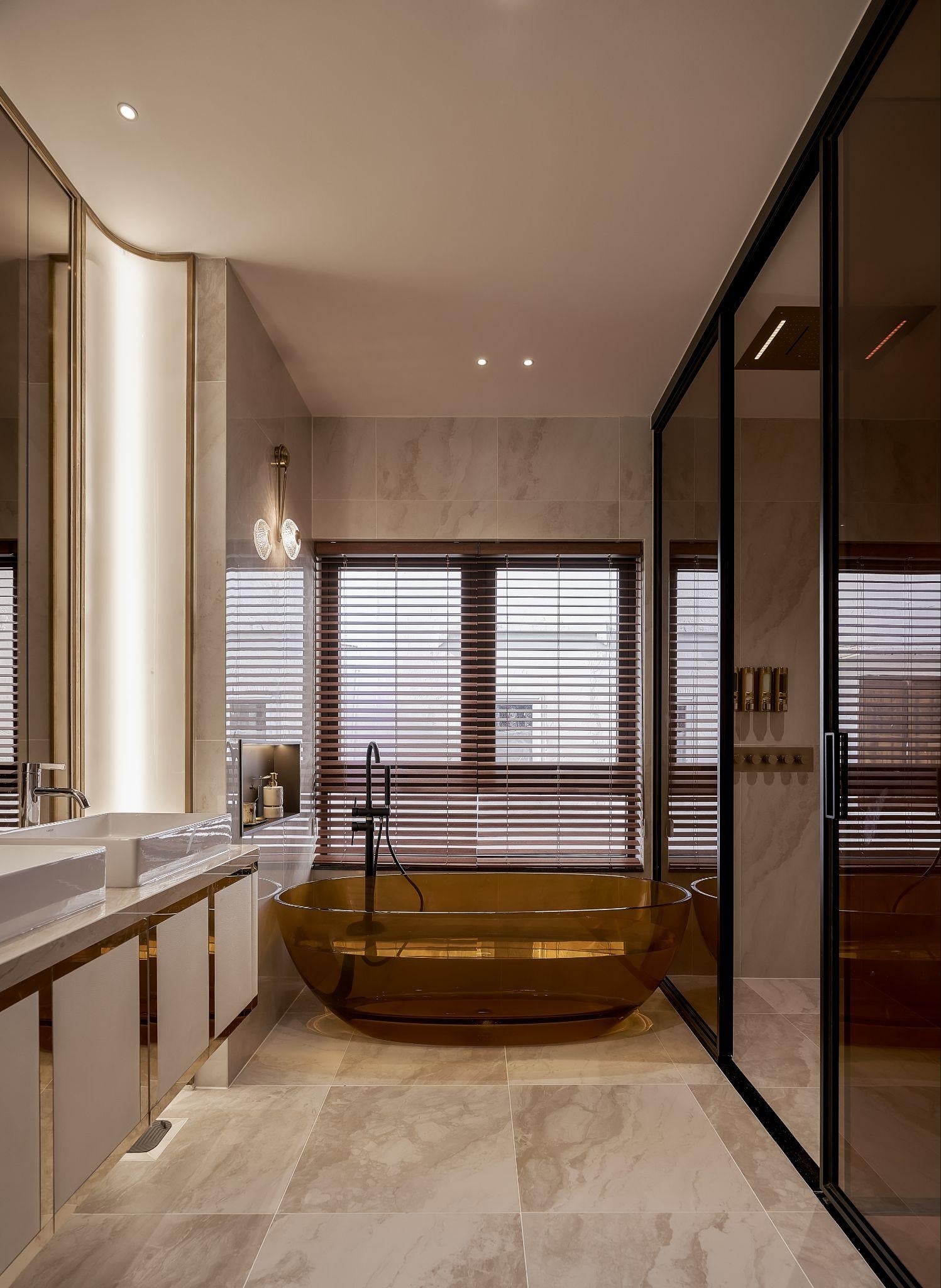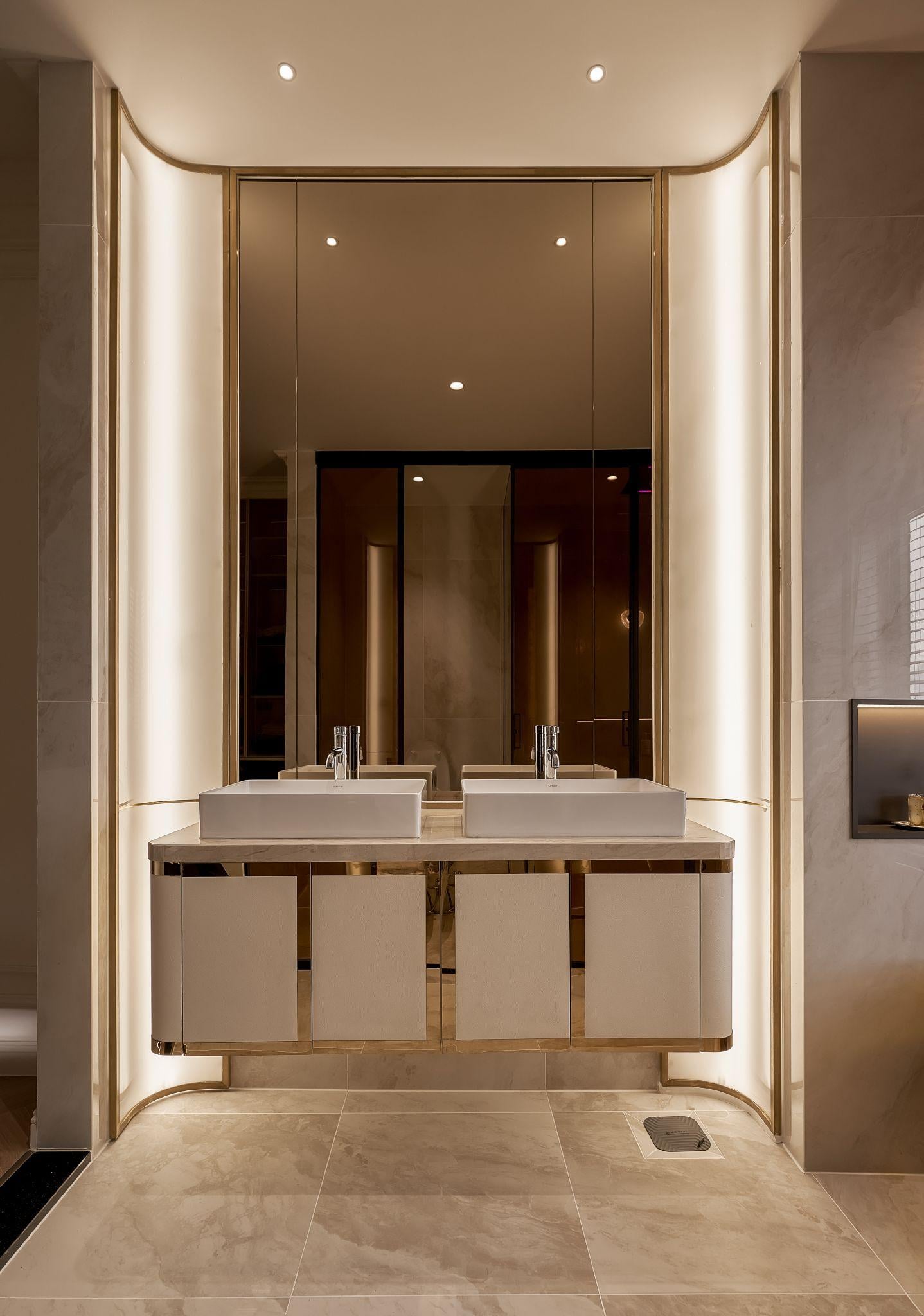 Về vật liệu: Đá tự nhiên, gỗ veneer, kính pha lê... được sử dụng có chọn lọc, tạo điểm nhấn sang trọng nhưng vẫn giữ được sự nhẹ nhàng.