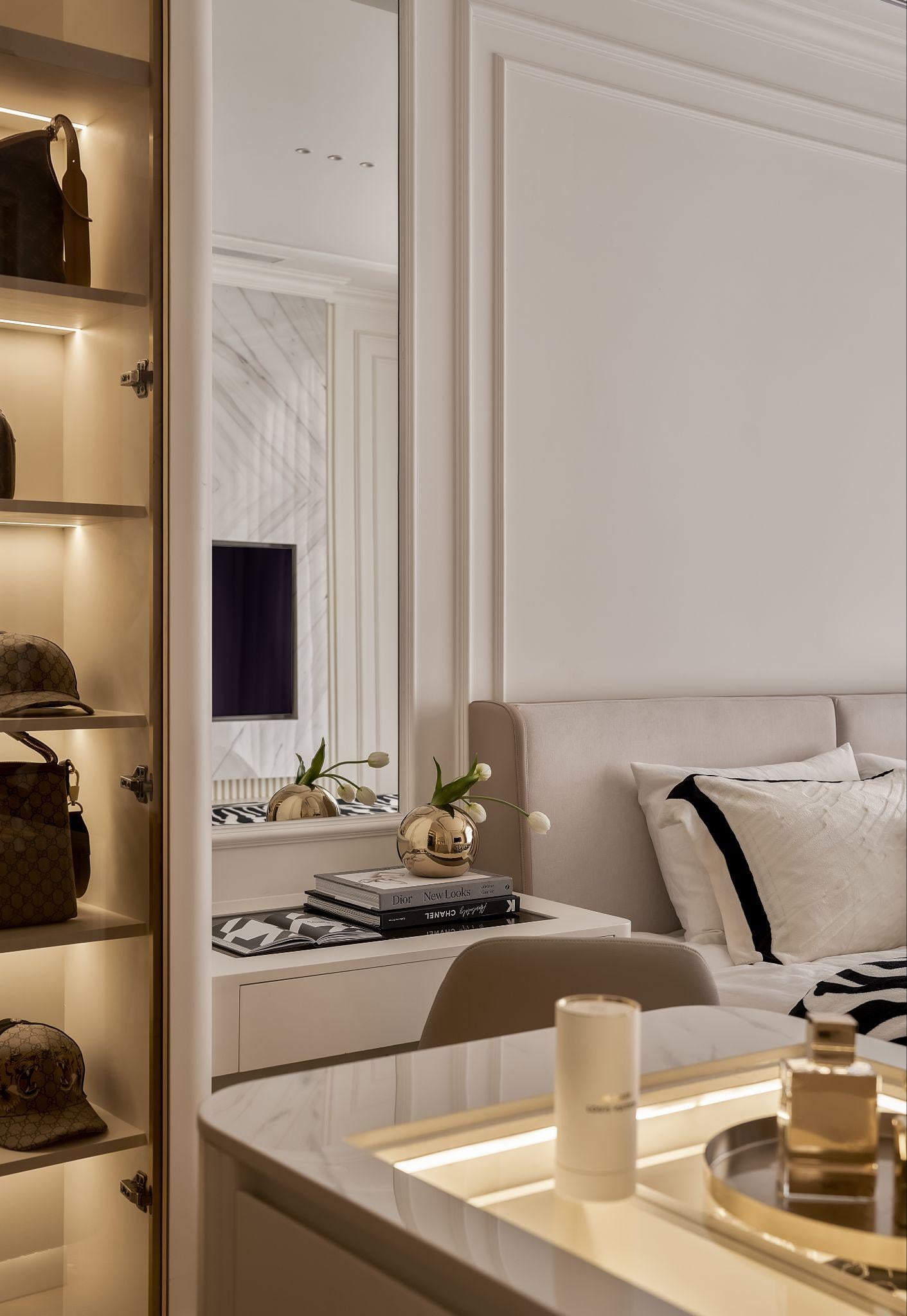 Về chi tiết: Thay vì rải đều các yếu tố trang trí, kiến trúc sư khéo léo chọn lọc những điểm nhấn cần thiết - từ phào chỉ tinh tế, gương trang trí, đèn chùm cổ điển thu nhỏ - để thiết kế trở nên sống động và ấn tượng mà không quá tải.