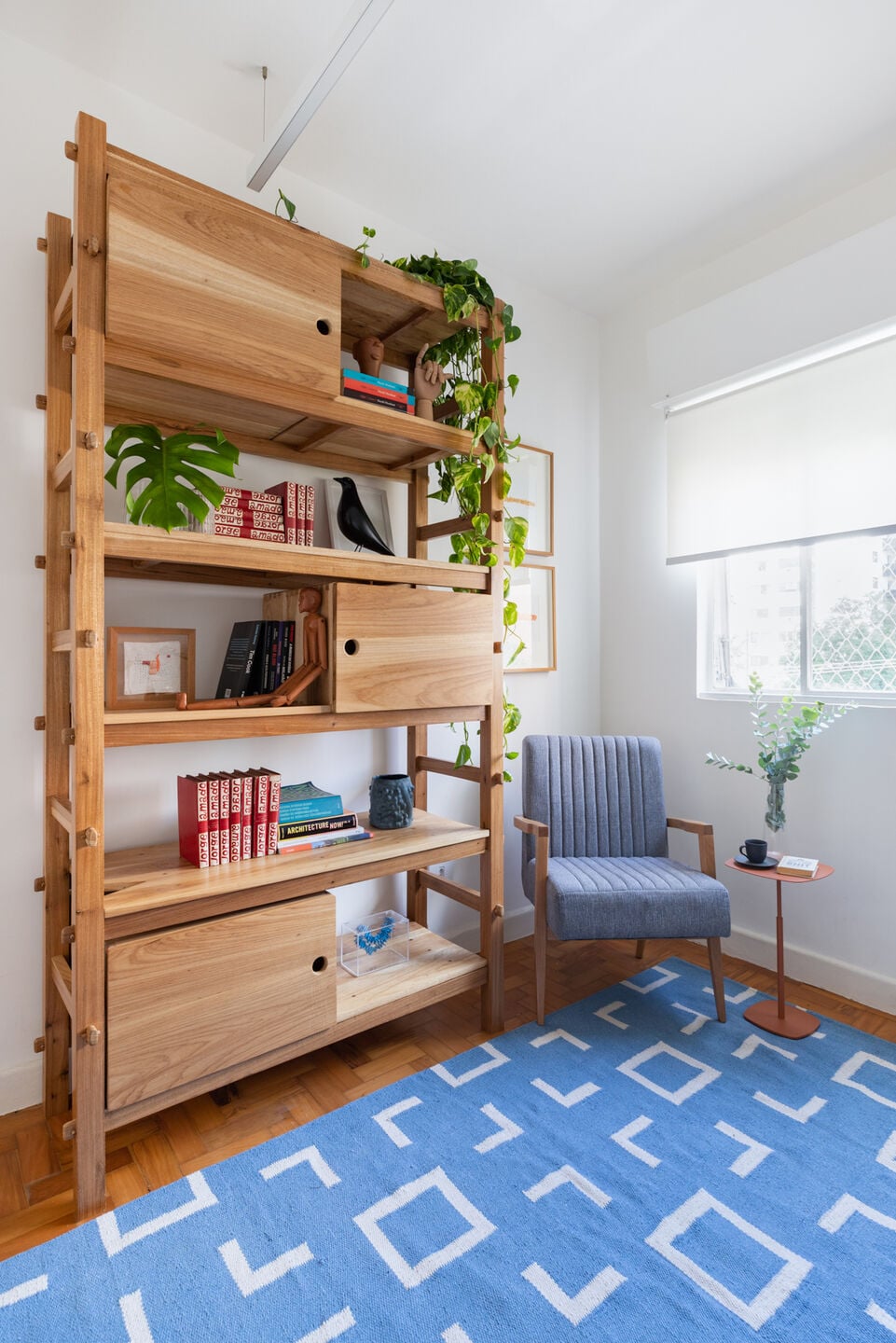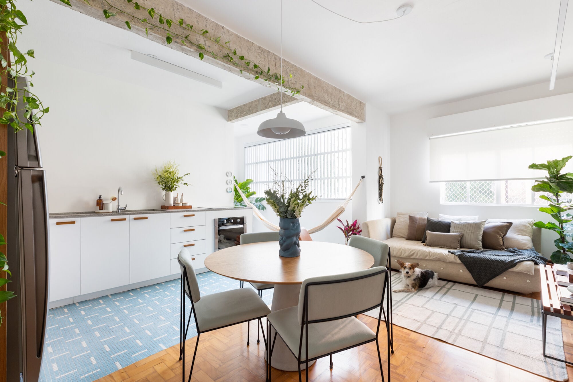 Điểm thú vị là nhiều chi tiết cũ được giữ lại và làm mới để trở thành nét riêng của căn hộ. Chẳng hạn, sàn gỗ parquet từ thập niên 1950 được phục hồi kỹ lưỡng, mang lại cảm giác ấm áp và gần gũi. Hệ gạch hoa gió (cobogó) ở mặt tiền vốn chỉ là phần kỹ thuật nay lại trở thành điểm nhấn trang trí, vừa giúp lấy sáng, vừa giữ nét hoài cổ cho ngôi nhà.