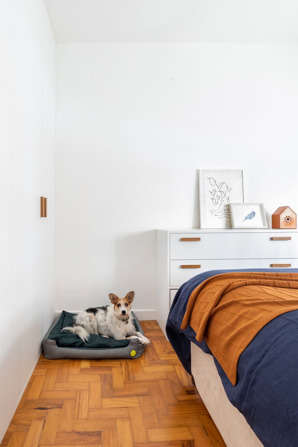Góc nhỏ trong phòng dành riêng cho thú cưng, được bố trí cạnh giường ngủ. Cách sắp xếp này cho thấy sự ấm áp và gần gũi trong sinh hoạt hàng ngày