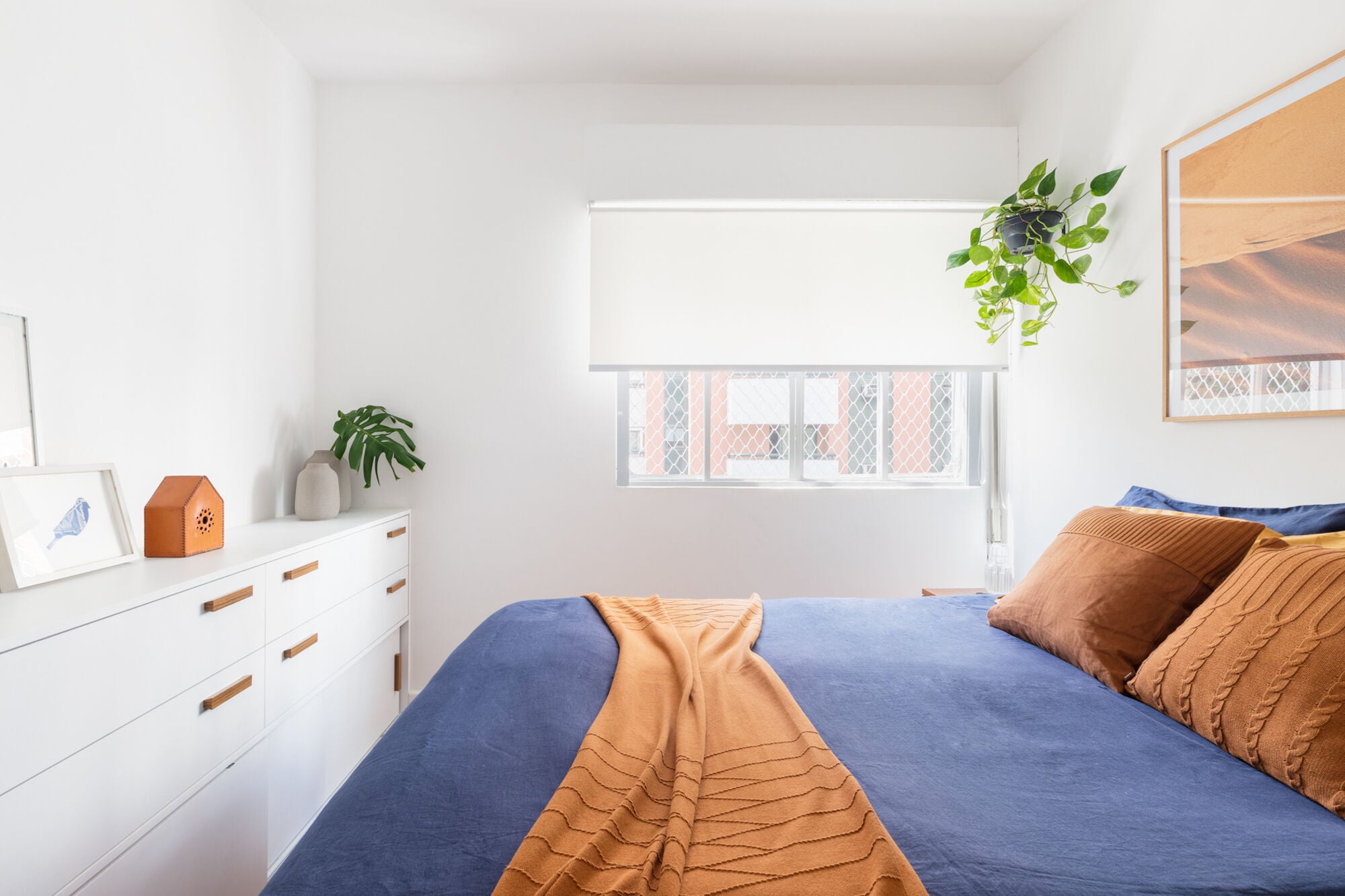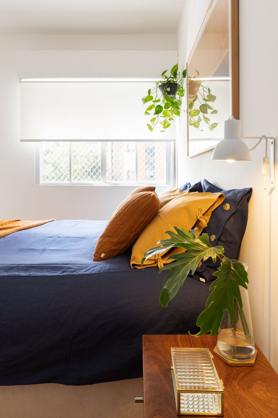 Phòng ngủ mang tông màu xanh navy và cam đất tạo cảm giác cân bằng, thư giãn. Cửa sổ lớn giúp đón ánh sáng tự nhiên, giữ không gian luôn thoáng và dễ chịu